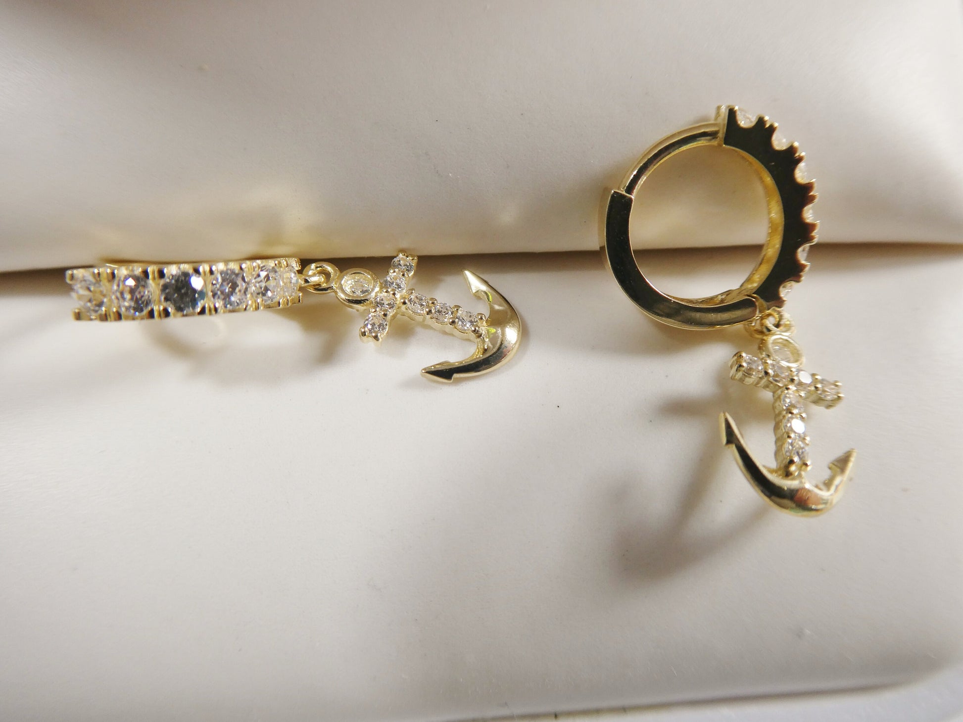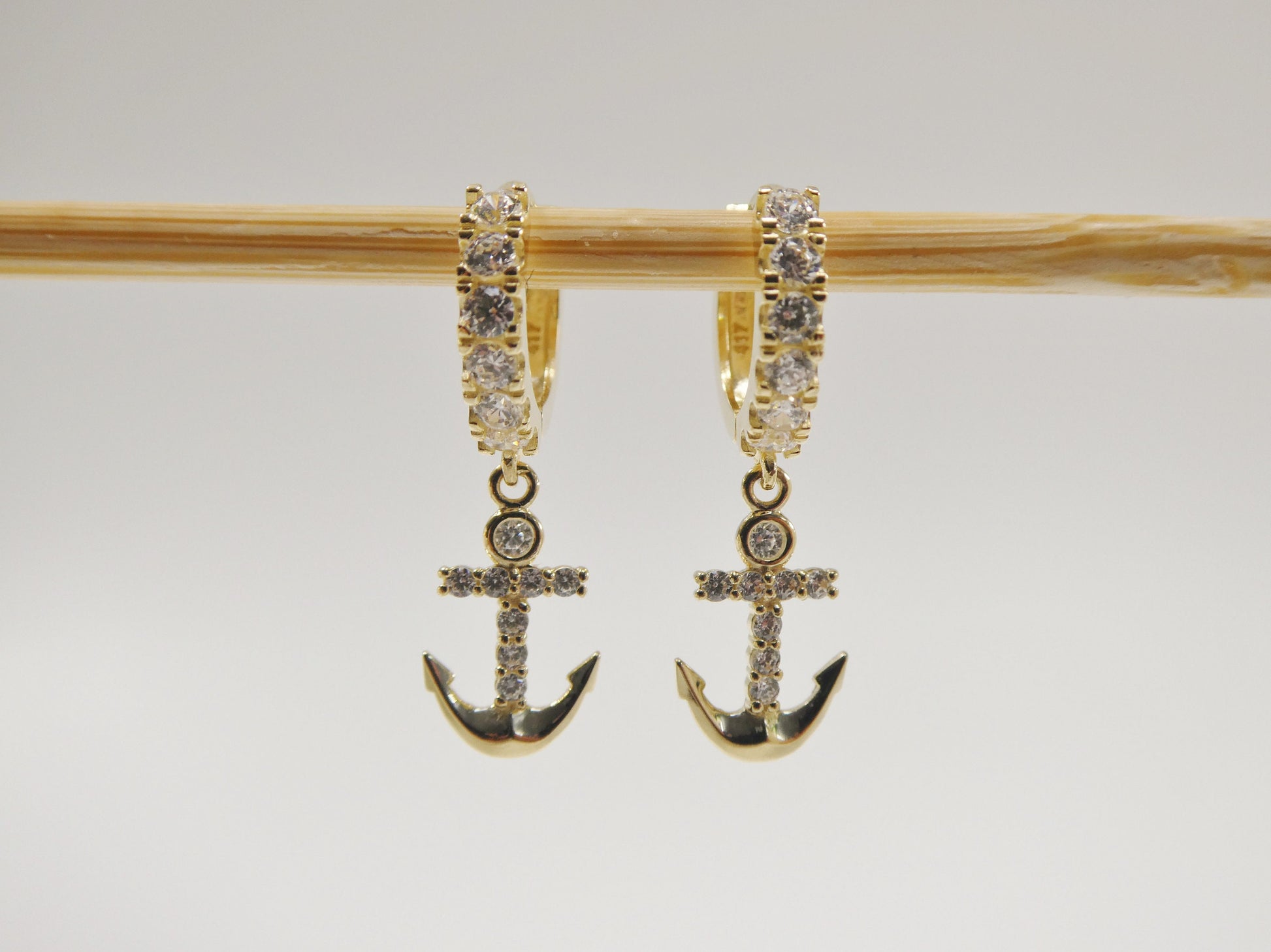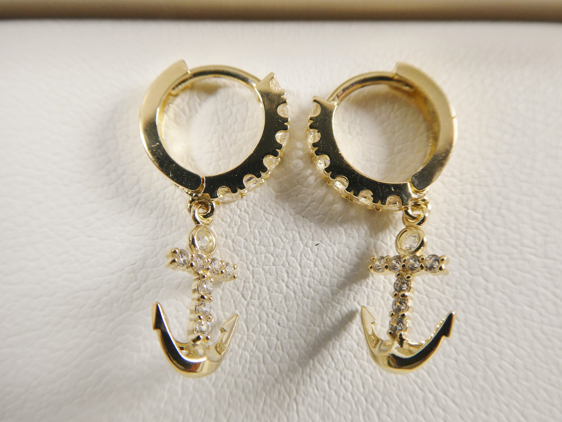 10 REAL YELLOW GOLD ANCHOR DANGLING AAA SHINY CUBIX ZIRCONIA STONE MICRO FAVE SETTING HUGGIE HOOP EARRING GUARANTEE REAL 10K GOLD MARK AND STAMP HIGH QUALITY HIGH POLISH GREAT FINISH LUXURY ATTRACTIVE LOOK COME IN NICE GIFT BOX MAKE PERFECT FIFT FOR ANY OCCASION