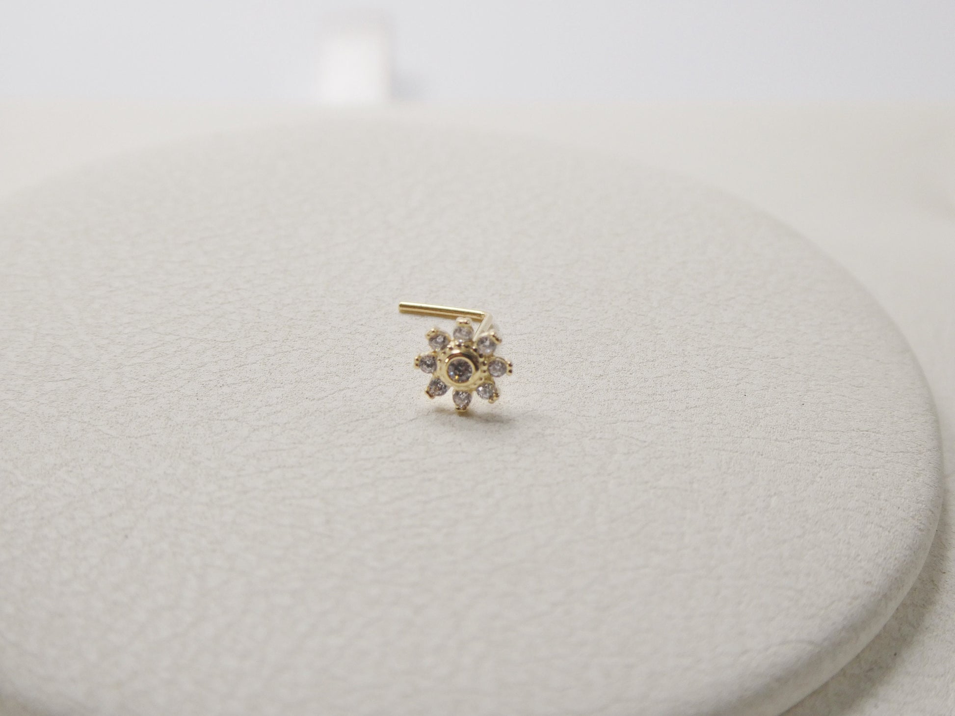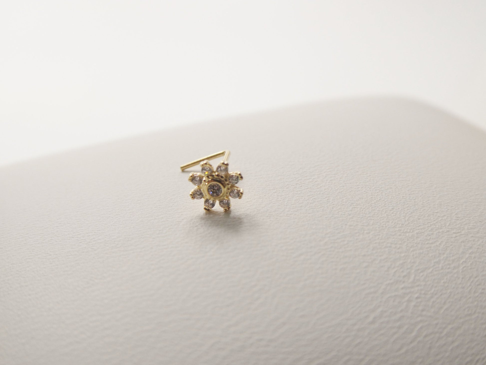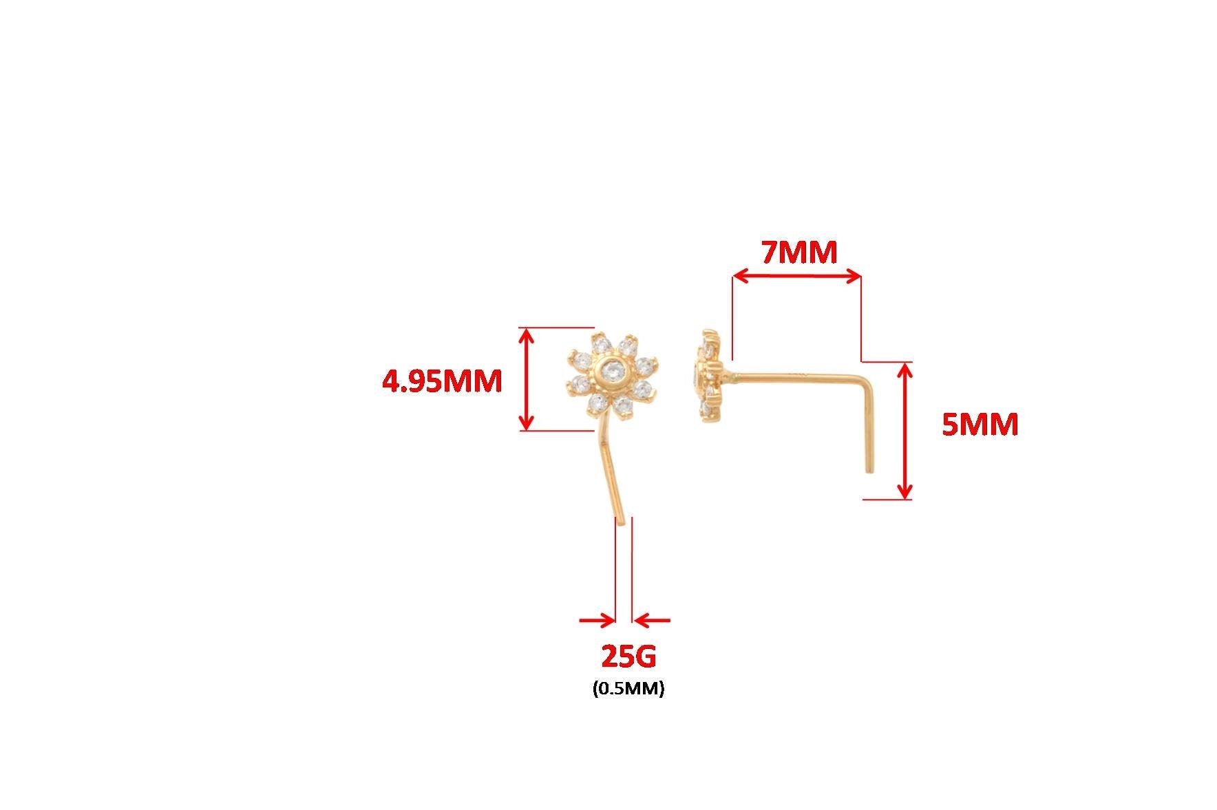 14K REAL SOLID YELLOW GOLD MOST COMFORTABLE NOSE RING FLOWER ROUND STONE L SHAPE STUD NOSE RING GAUGE 24 HIGH QUALITY HIGH POLISH GUARANTEE REAL 14K GOLD MARK AND STAMP COME IN NICE GIFT BOX