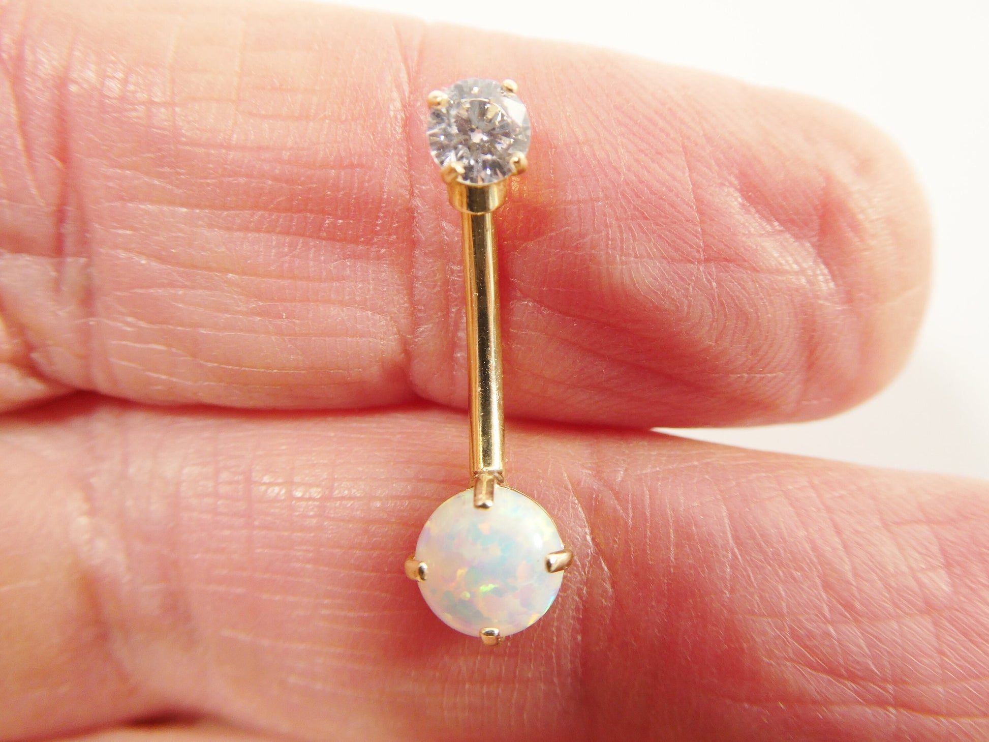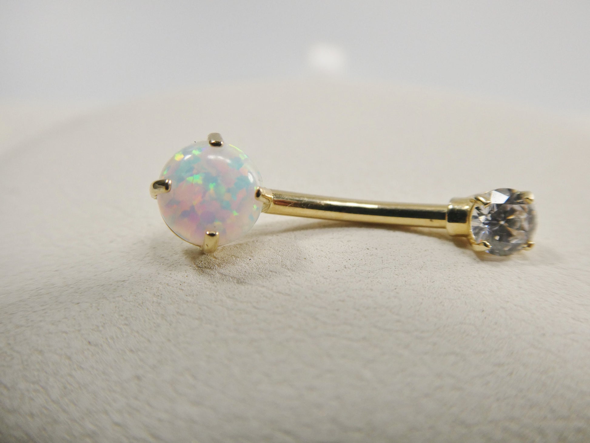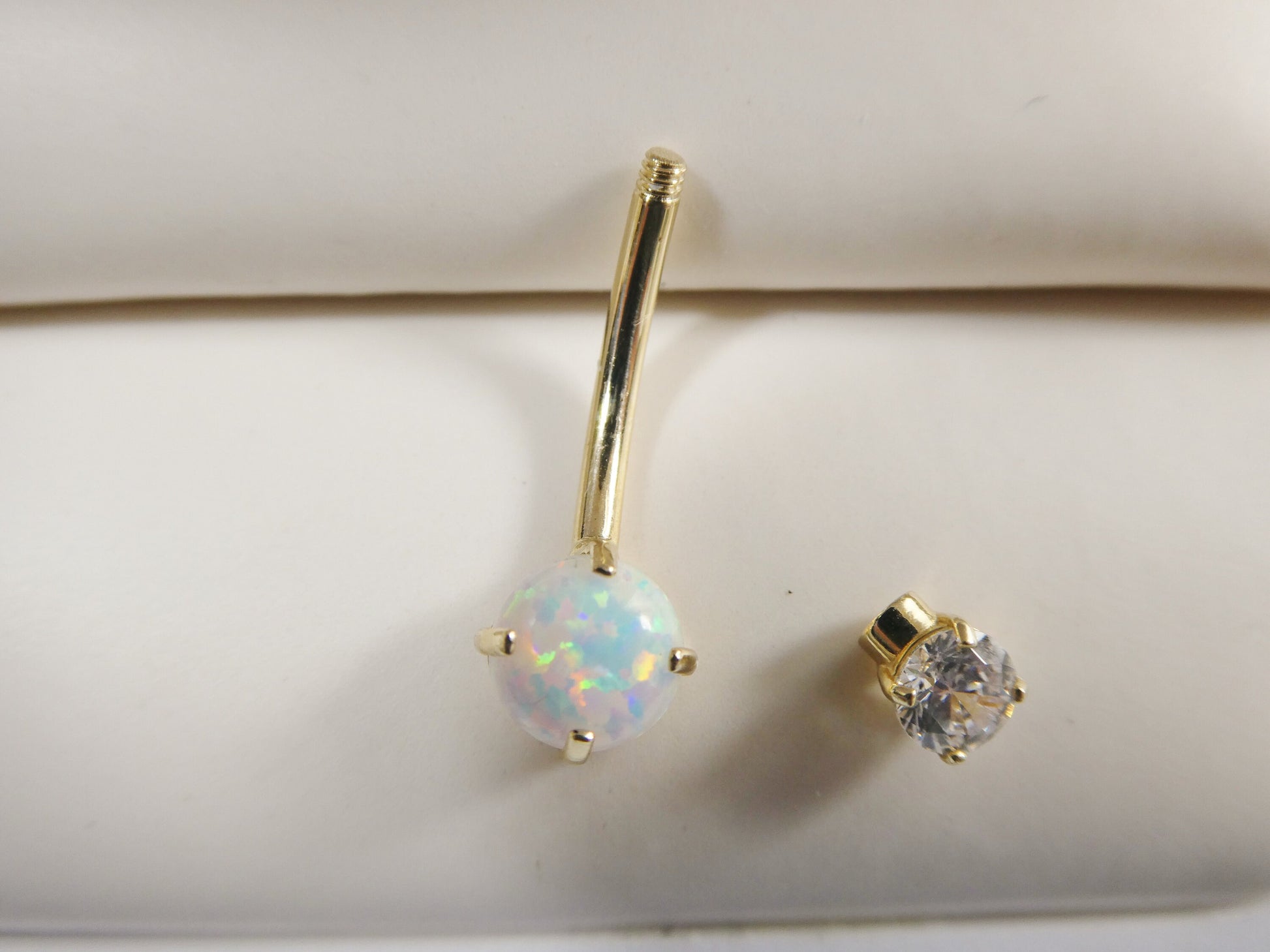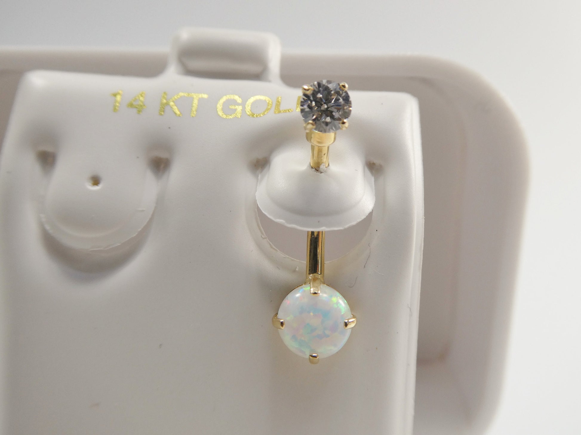 BRAND NEW REAL SOLID 014 GAUGE 14K YELLOW GOLD OPAL BELLY BUTTON RING 3.5MM AAA CUBIC ZIRCONIA SHINY STONE TOP SCREW HIGH POLISH GREAT FINISH LUXURY ATTRACTIVE LOOK HIGH QUALITY SCREW ON AND OFF GUARANTEE REAL 14K GOLD MARK AND STAMP ON THE BANANA BAR AND THE TOP SRCEW COME IN NICE GIFT BOX MAKE IT PERFECT GIFT FOR ANY OCCASION