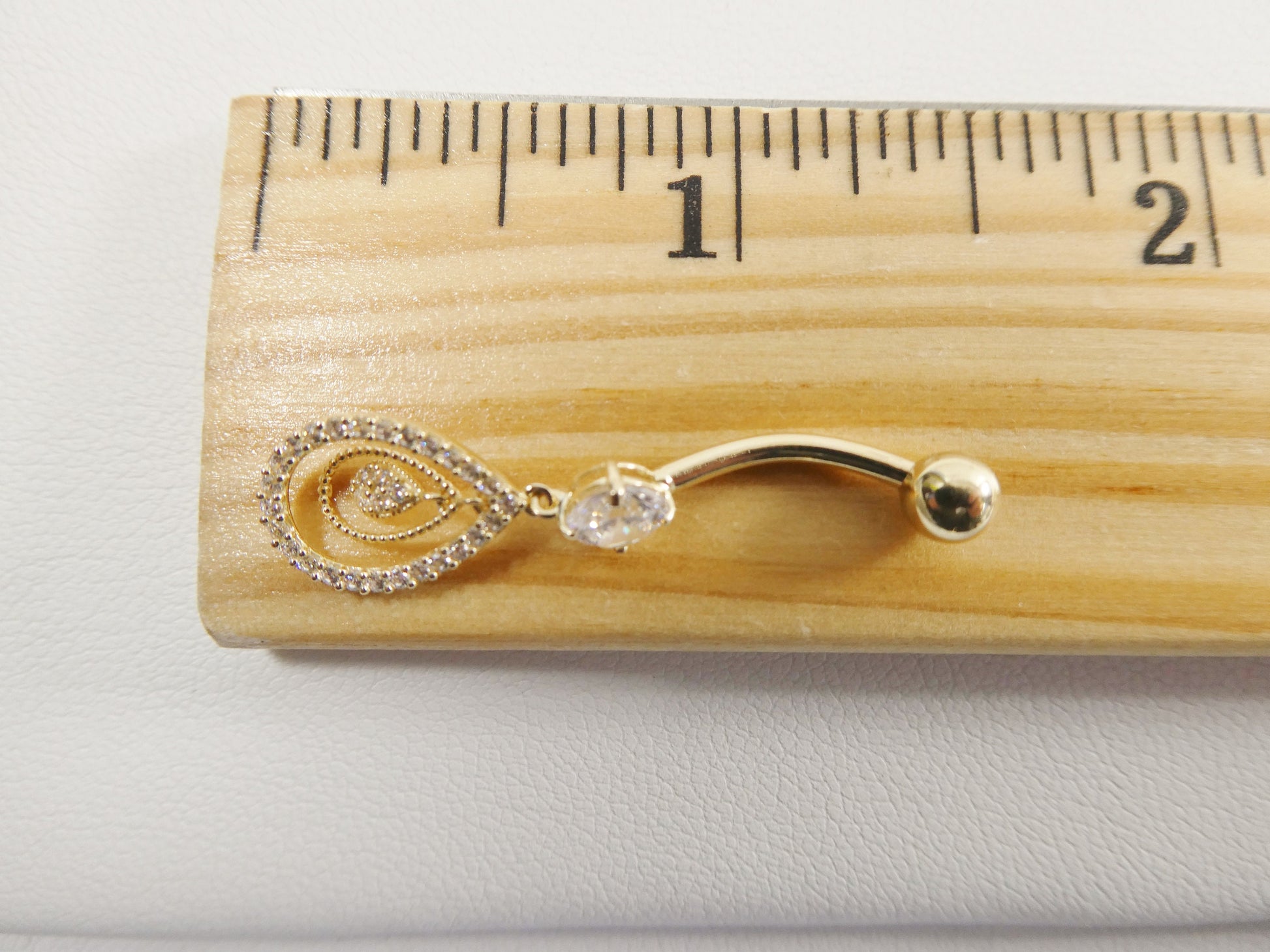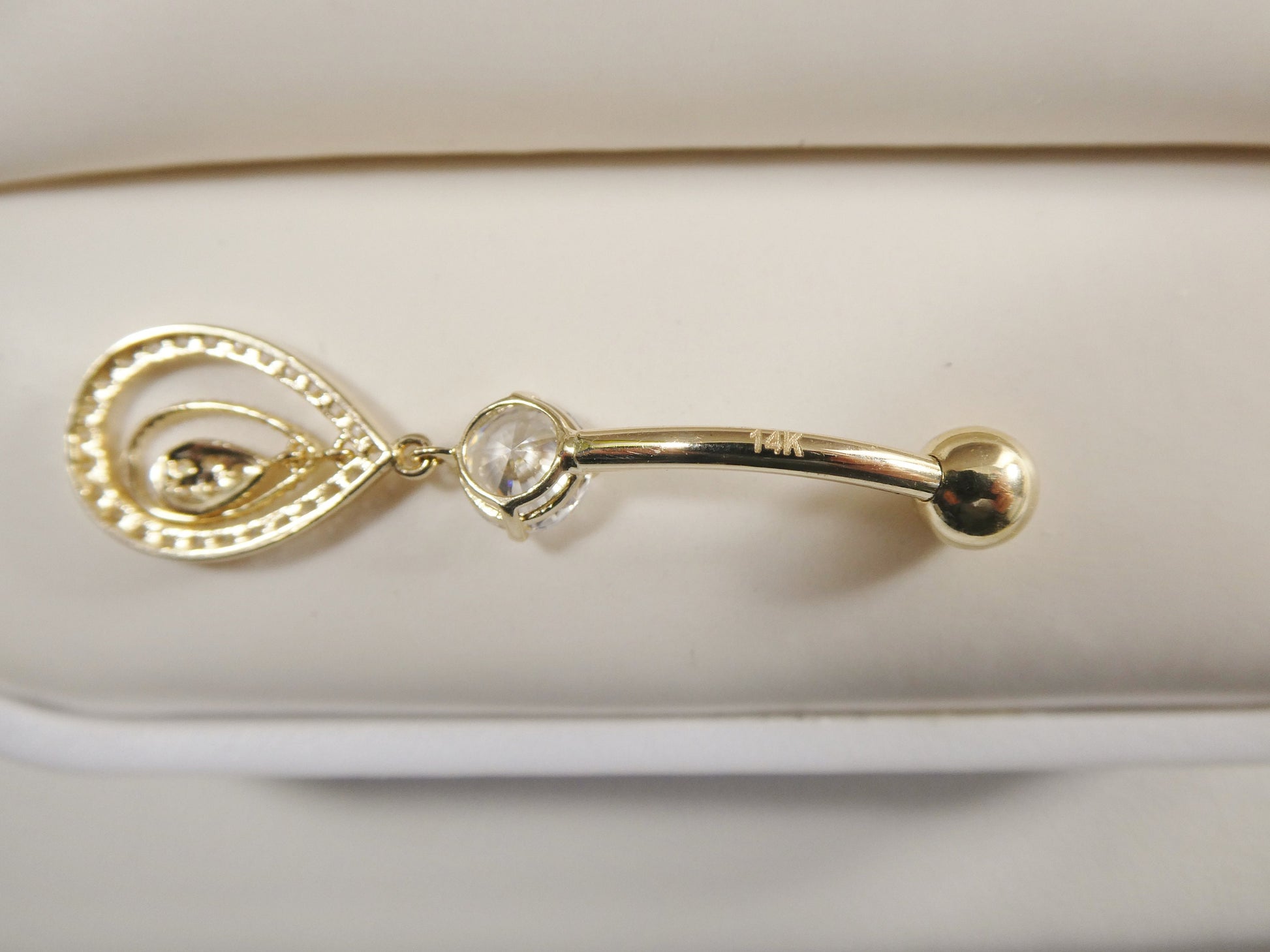 BRAND NEW REAL SOLID 014 GAUGE 14K YELLOW GOLD OVAL DANGLING SHAPE BELLY BUTTON RING AAA CUBIC ZIRCONIA 4MM SHINY STONE CENTER HIGH POLISH GREAT FINISH LUXURY ATTRACTIVE LOOK HIGH QUALITY SCREW ON AND OFF GUARANTEE REAL 14K GOLD MARK AND STAMP ON THE BANANA BAR AND THE TOP SRCEW COME IN NICE GIFT BOX MAKE IT PERFECT GIFT FOR ANY OCCASION