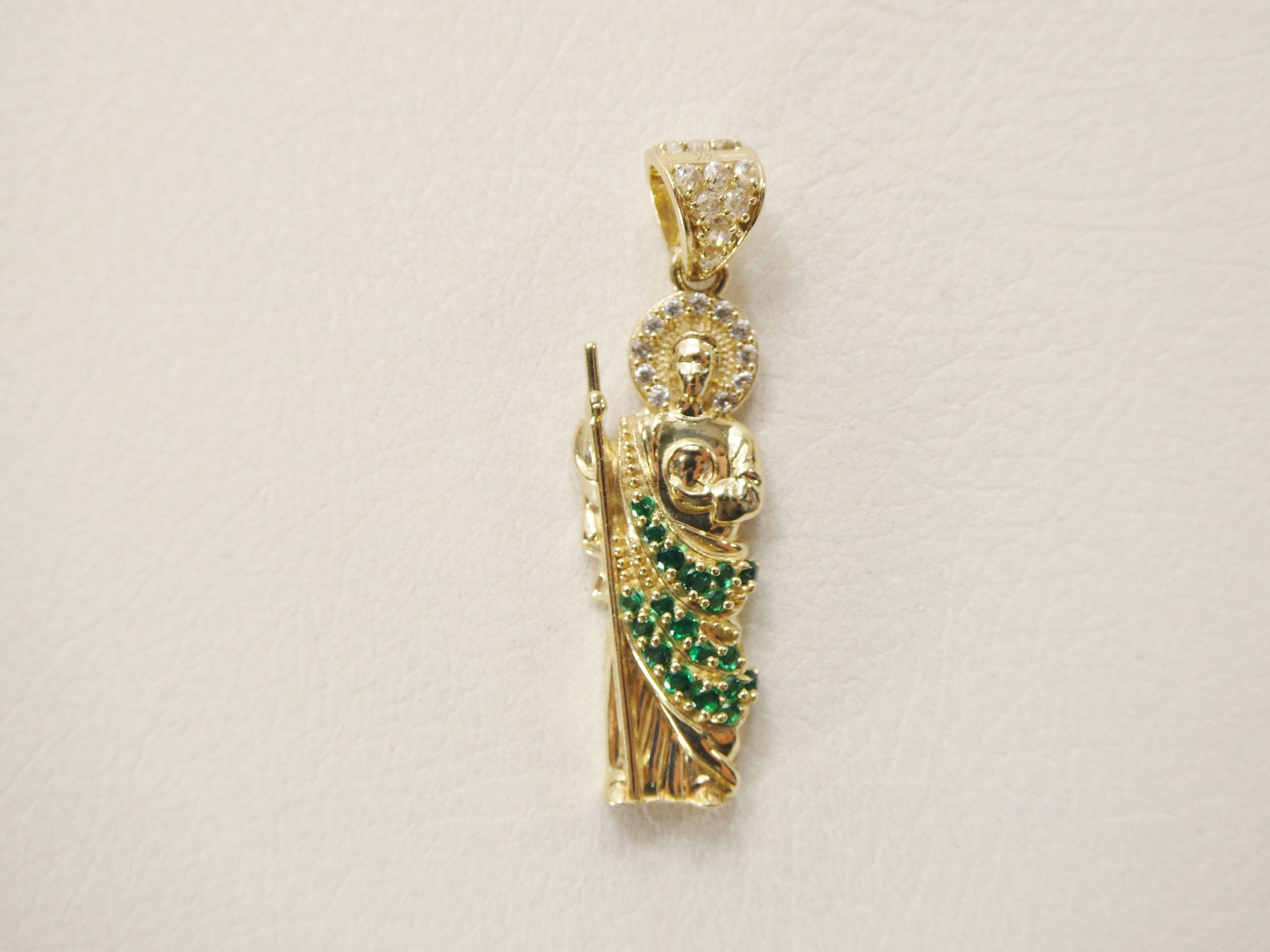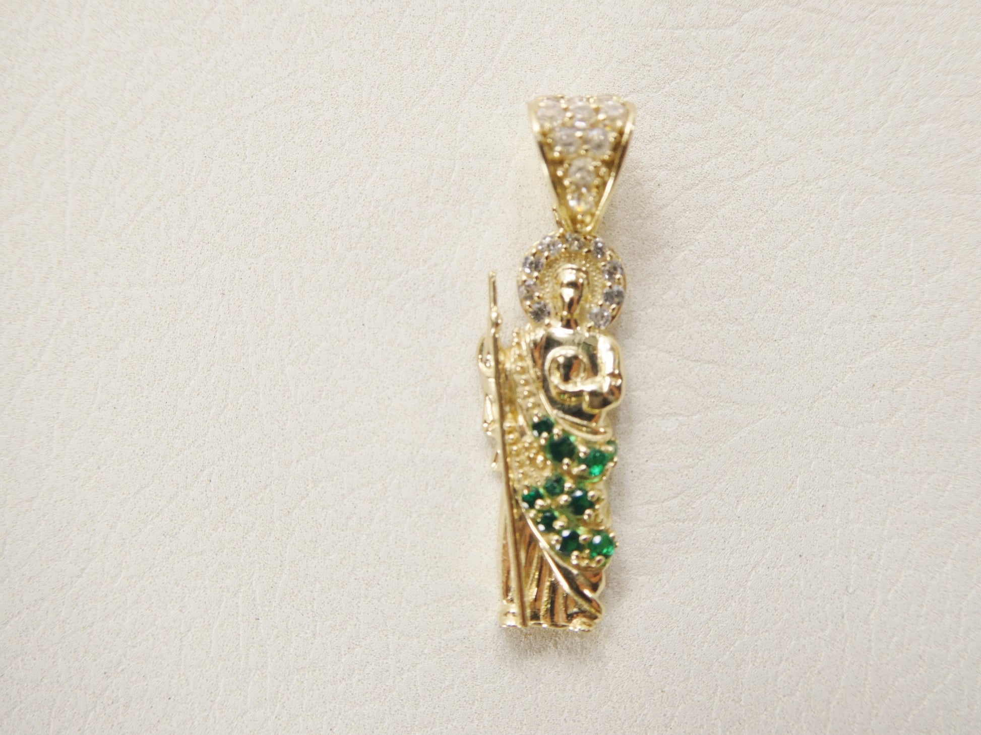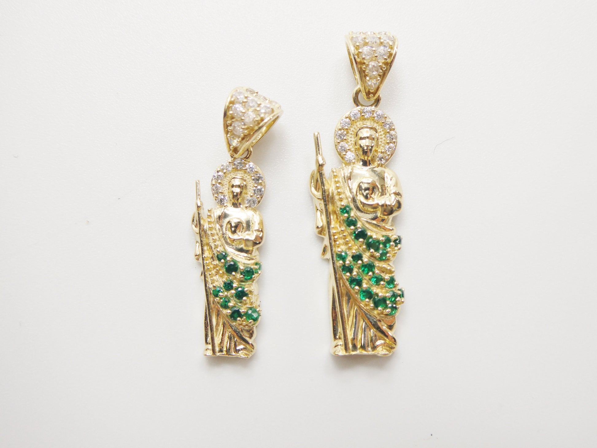 14K REAL SOLID YELLOW GOLD SAINT JUDE CHARM PENDENT SAN JUDAS WITH GRENN AND WHITE SHINY CUBIC ZIRCONIA STONE HIGH POLISH HIGH QUALITY GREAT PRICE GUARANTEE