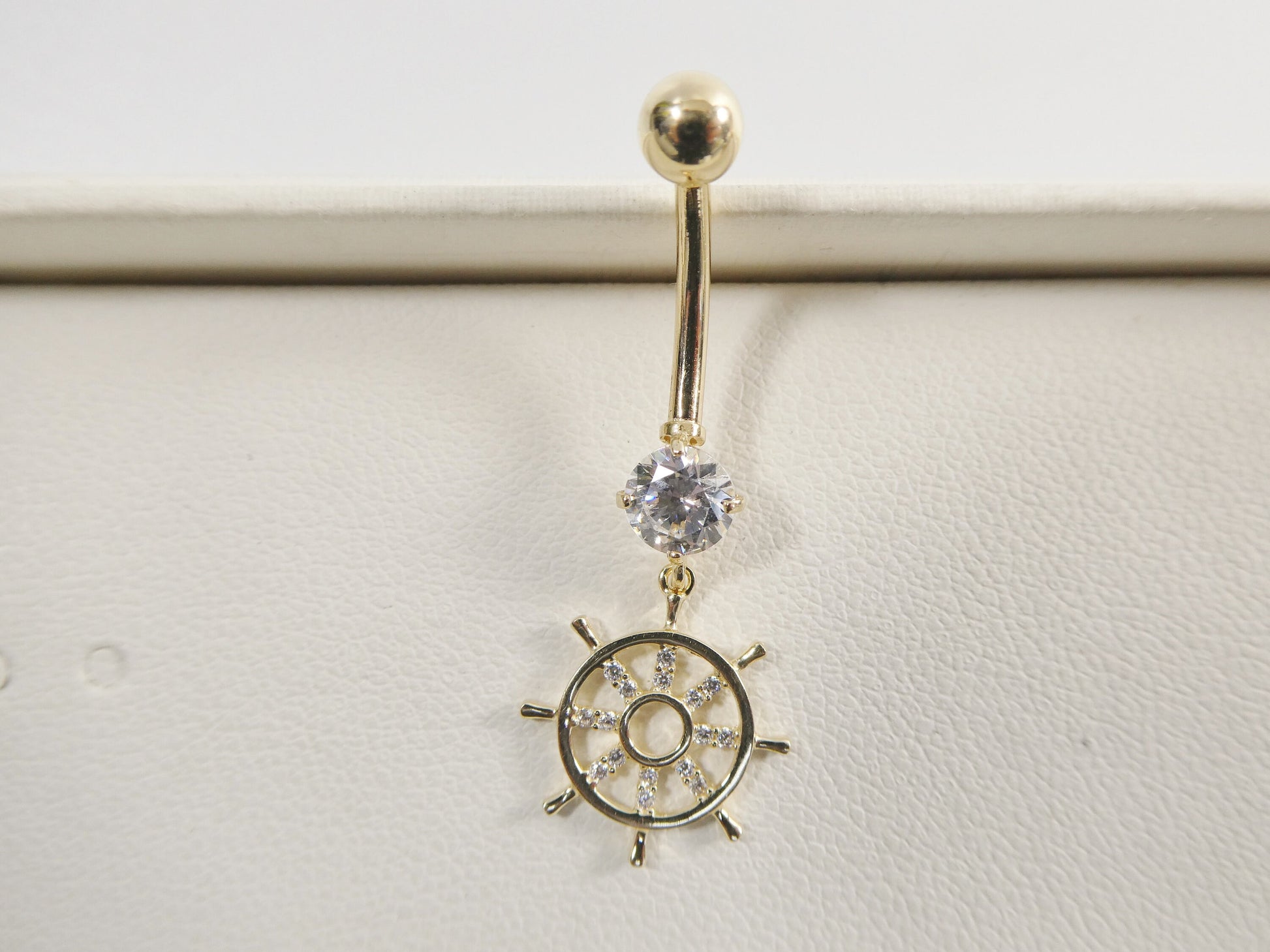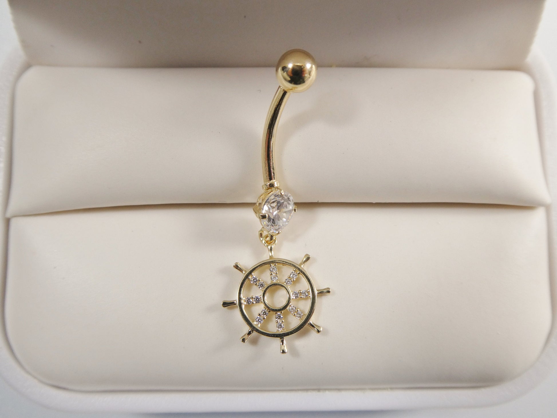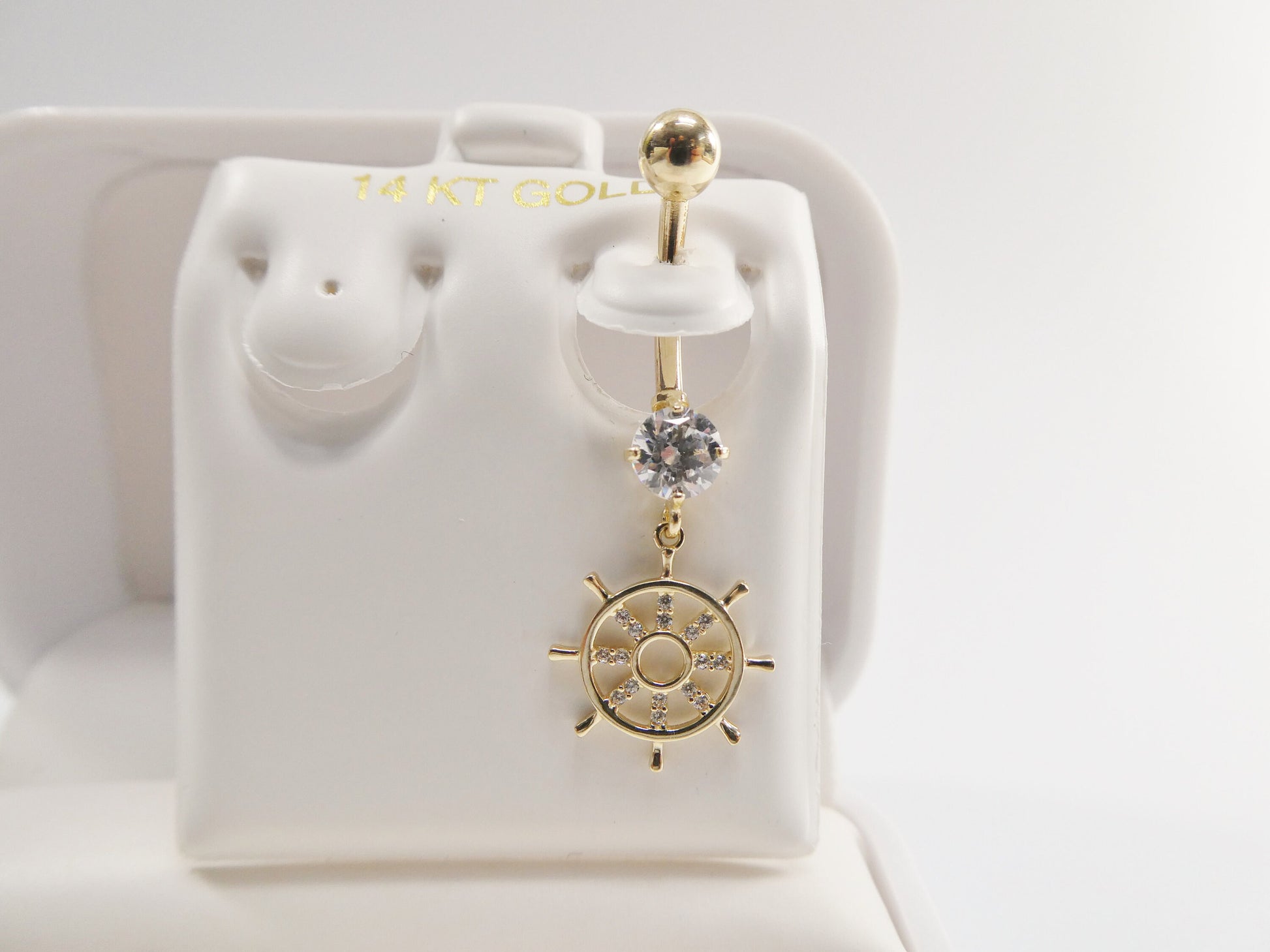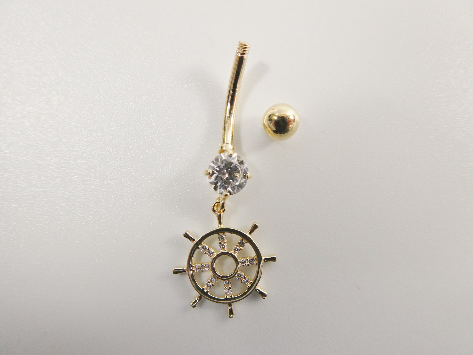 14k real solid yellow gold ship wheel dangling belly button ring piercing