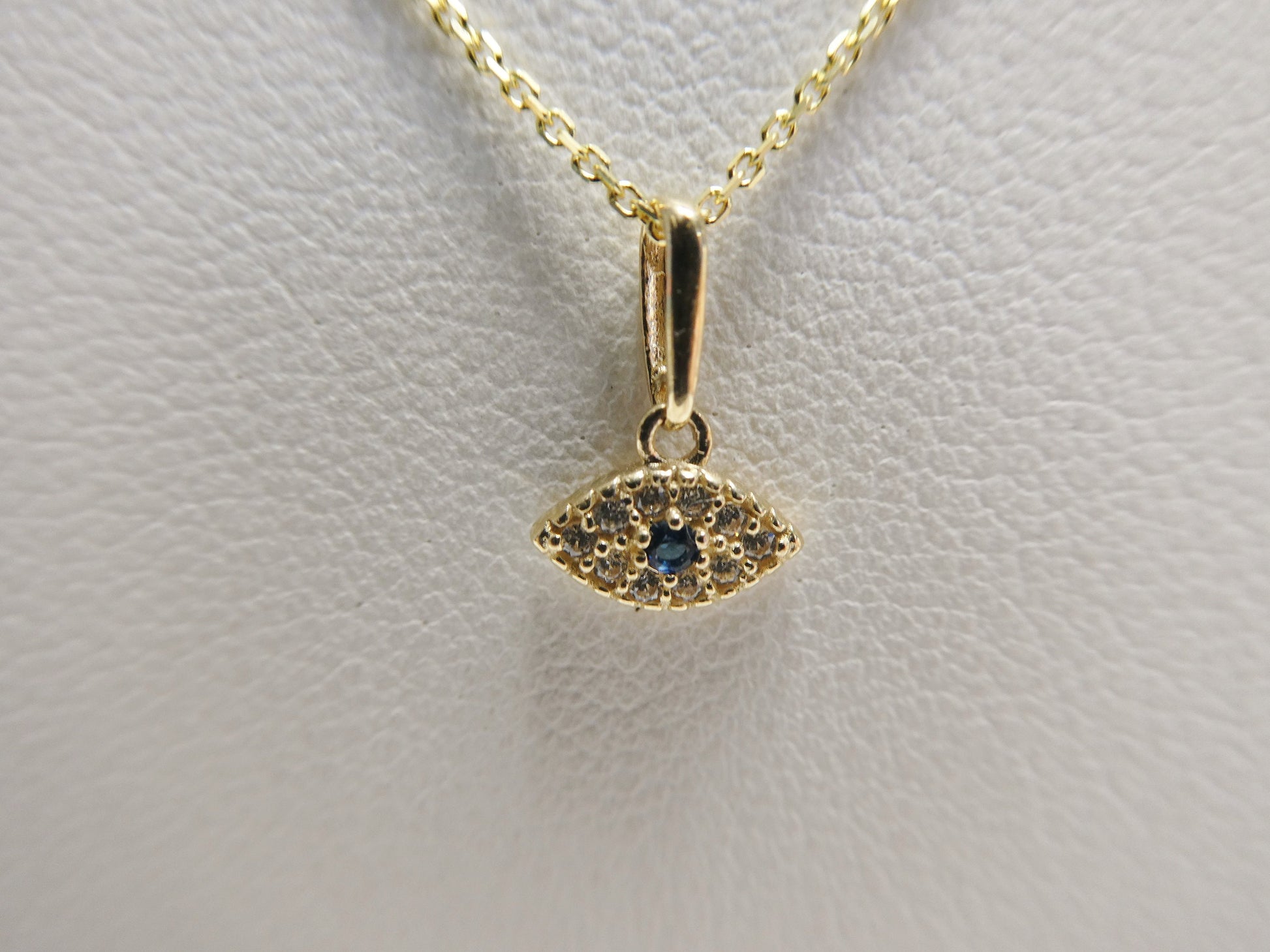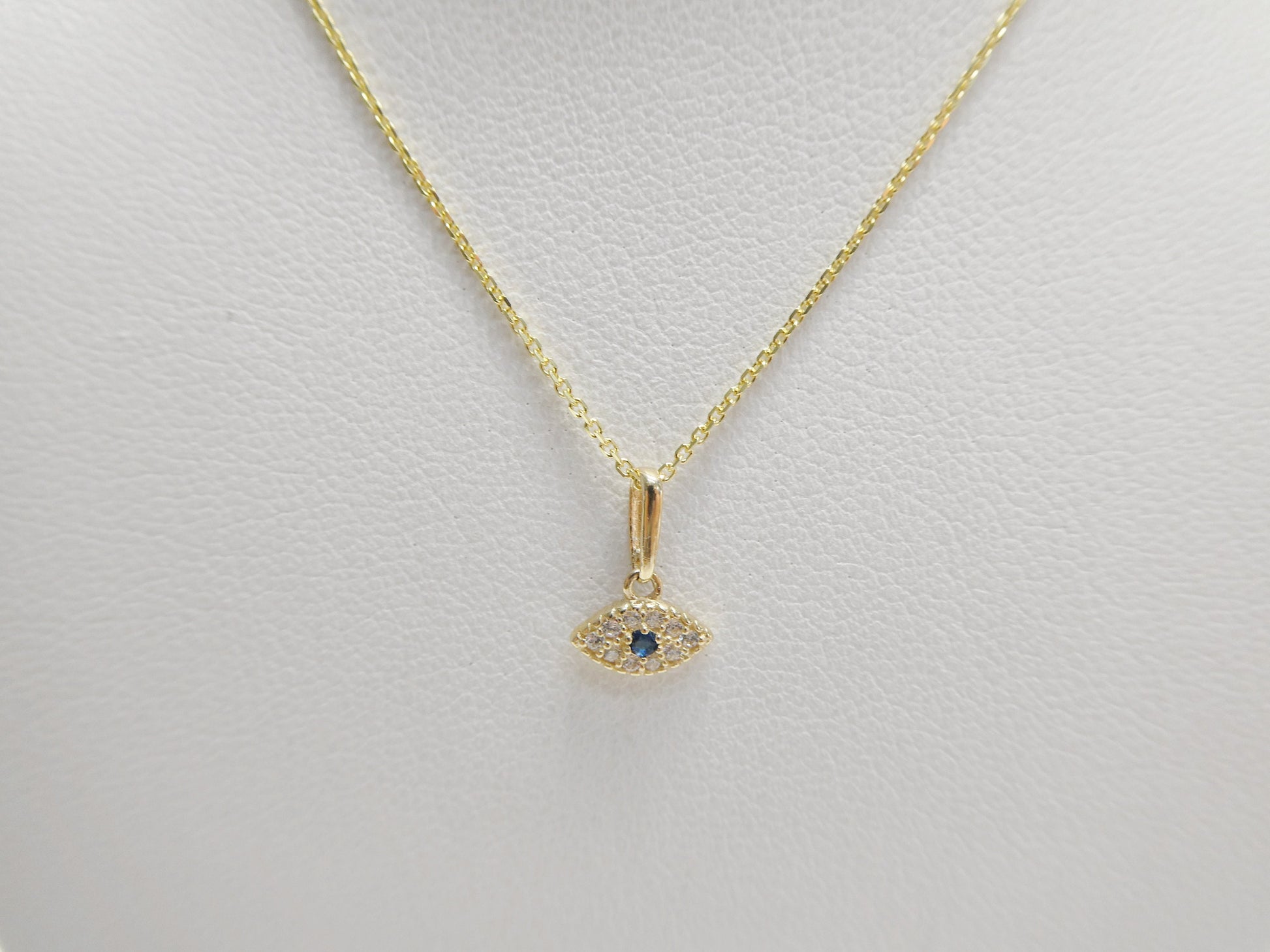 14K SOLID REAL YELLOW GOLD COLOR SMALL EVIL EYE CHARM PENDENT AND CABLE CHAIN COMES IN 16 INCH AND 18 INCH LOBSTER LOCK SAPPIRE STONE COLOR CENTER HIGH QUALITY SUPPER GENUINE HIGH QUALITY HIGH POLISH GREAT FINISH GREAT PRICE AAAA SHINY CUBIZ ZIRCONIA MICRO FAVE SETTING GUARANTTE REAL 14K GOLD MARK AND STAMP LUXURAY ATTRACTIVE LOOK COME IN NICE GIFT BOX MAKE IT BEAUTIFUL GIFT FOR ANY OCCASION