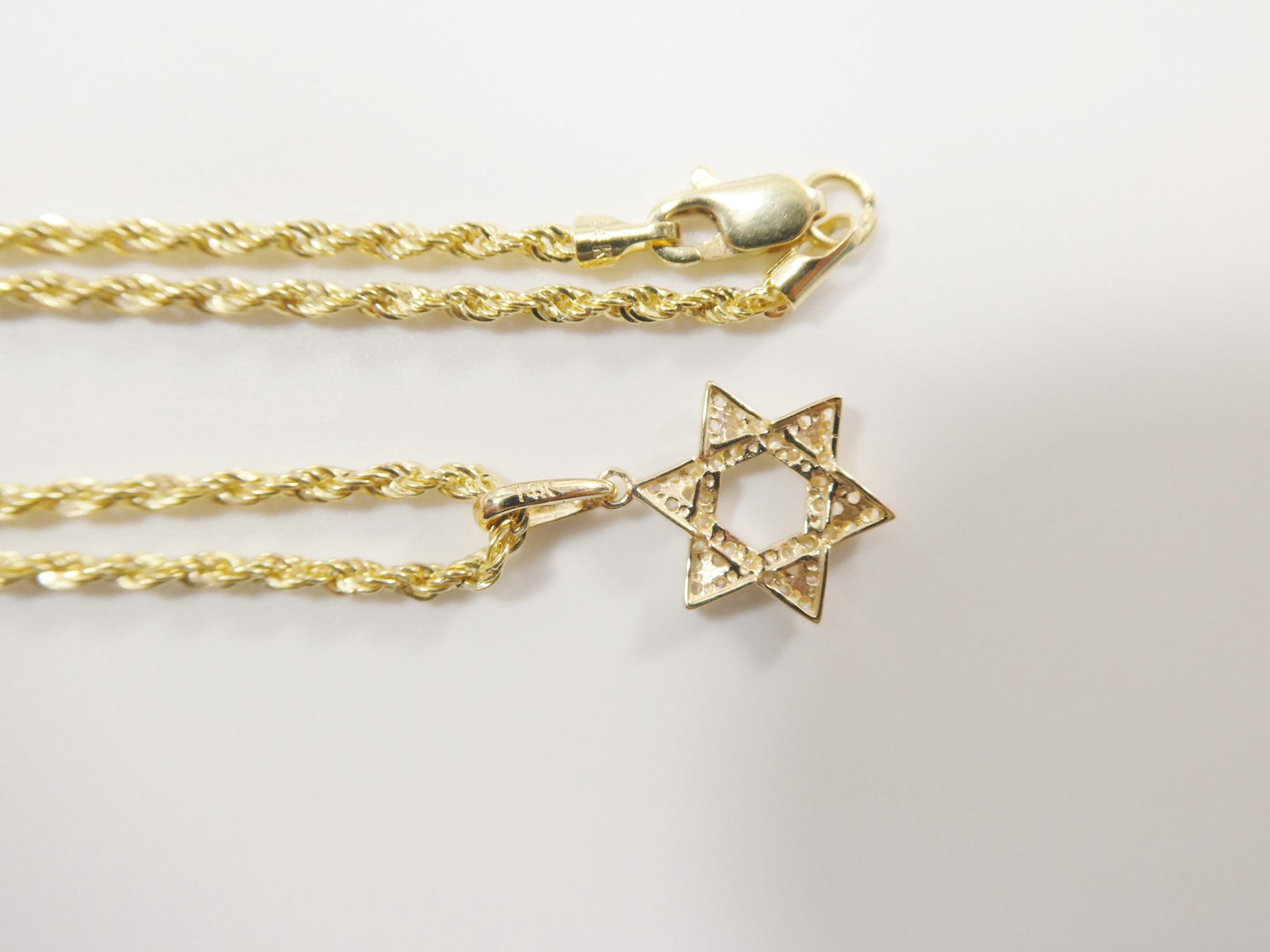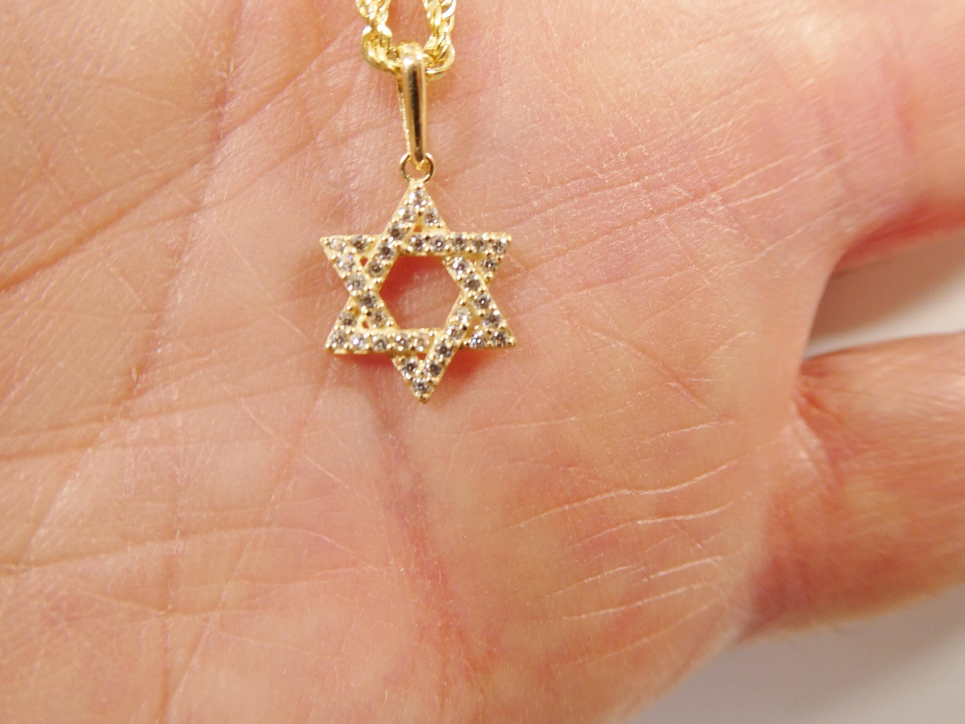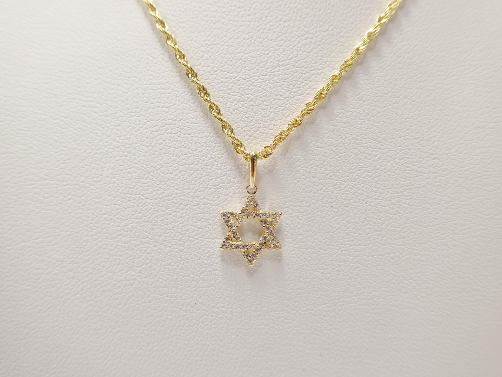 14K SOLID REAL YELLOW GOLD COLOR STAR DAVID CHARM PENDENT COME WITH 18 INCH ROPE CHAIN LOBSTER LOCK HIGH QUALITY SUPPER GENUINE HIGH QUALITY HIGH POLISH GREAT FINISH GREAT PRICE 1.5MM AAA SHINY FULL SETTING CUBIZ ZIRCONIA MICRO FAVE SETTING ALL AROUND GUARANTTE REAL 14K GOLD MARK AND STAMP LUXURAY ATTRACTIVE LOOK COME IN NICE GIFT BOX MAKE IT BEAUTIFUL GIFT FOR ANY OCCASION