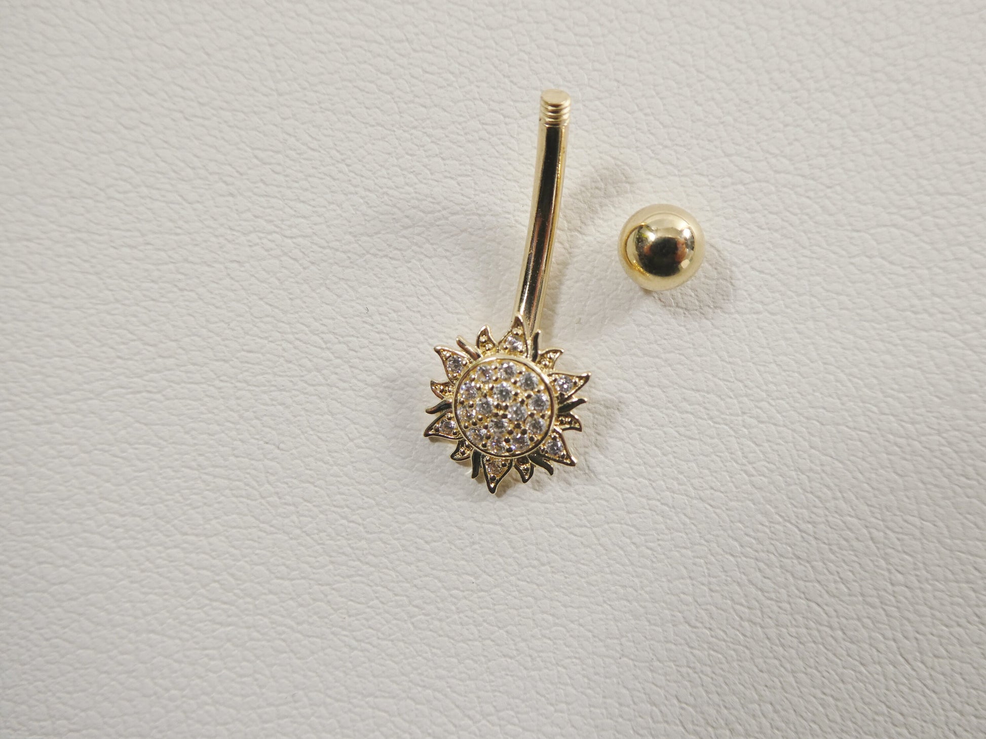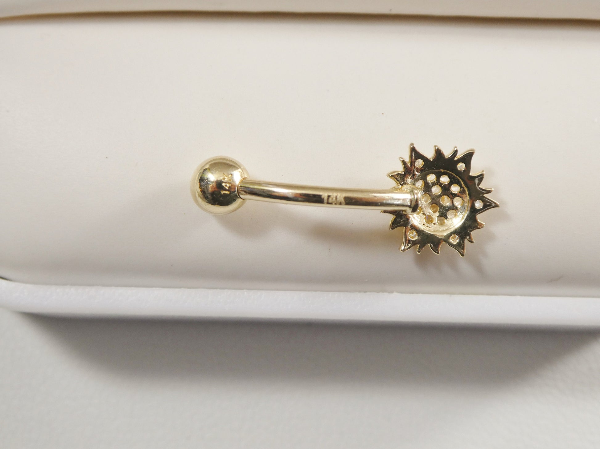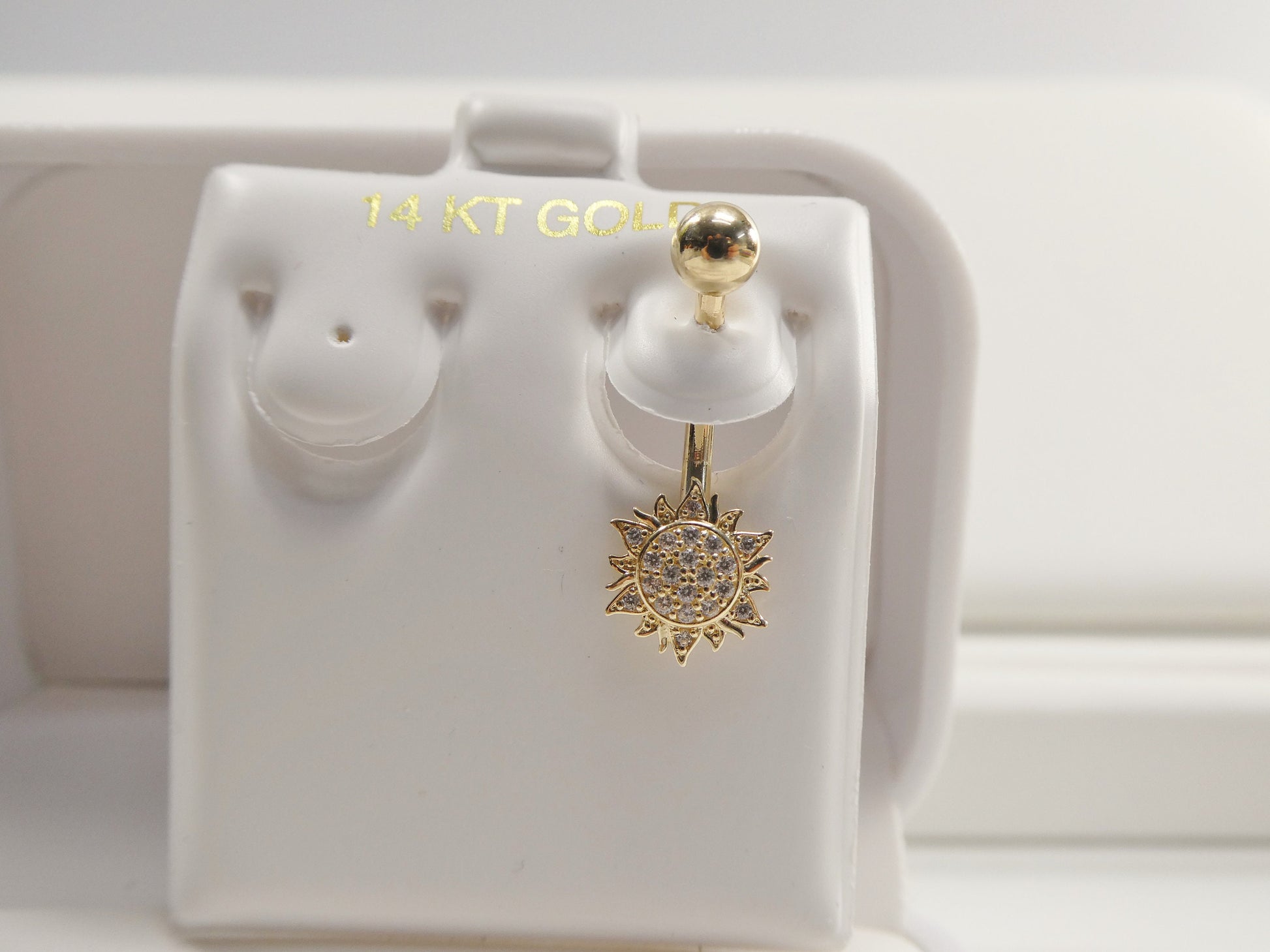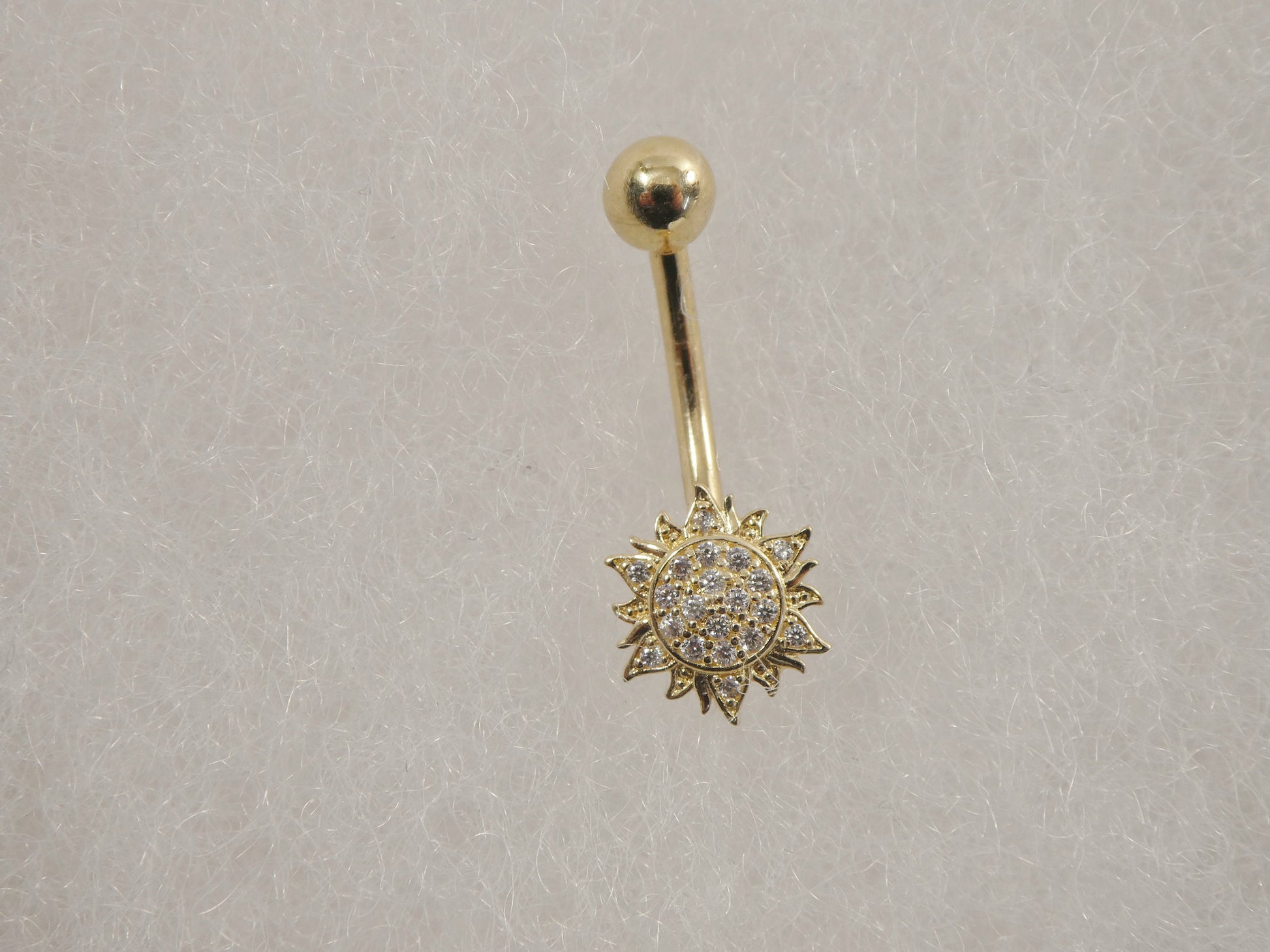 BRAND NEW REAL SOLID 14K YELLOW GOLD SUN SHAPE BELLY BUTTON RING AAA CUBIC ZIRCONIA SHINY STONE HIGH POLISH GREAT FINISH LUXURY ATTRACTIVE LOOK HIGH QUALITY SCREW ON AND OFF GUARANTEE REAL 14K GOLD MARK AND STAMP ON THE BANANA BAR AND THE TOP SRCEW COME IN NICE GIFT BOX MAKE IT PERFECT GIFT FOR ANY OCCASION