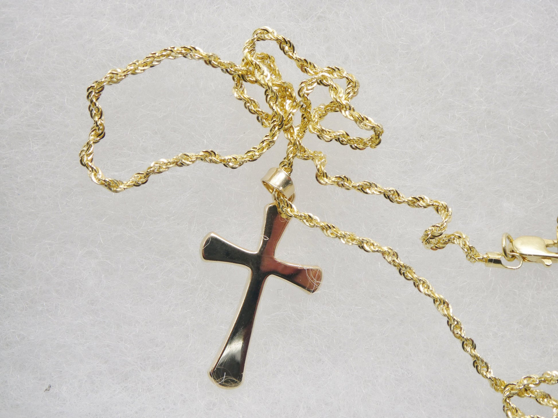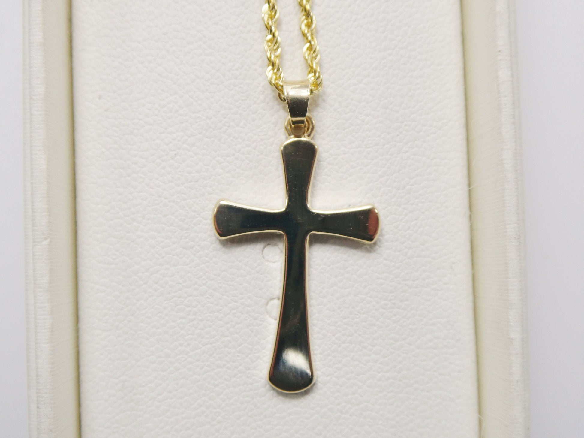 14K SOLID REAL YELLOW GOLD SUPER POLISH CROSS CHARM PENDENT AND ROBE CHAIN COMES IN 16 INCH AND 18 INCH AND 20 INCH LOBSTER LOCK HIGH QUALITY GENUINE HIGH QUALITY HIGH POLISH GREAT FINISH GREAT PRICE GUARANTTE REAL 14K GOLD MARK AND STAMP LUXURAY ATTRACTIVE LOOK COME IN NICE GIFT BOX MAKE IT BEAUTIFUL GIFT FOR ANY OCCASION