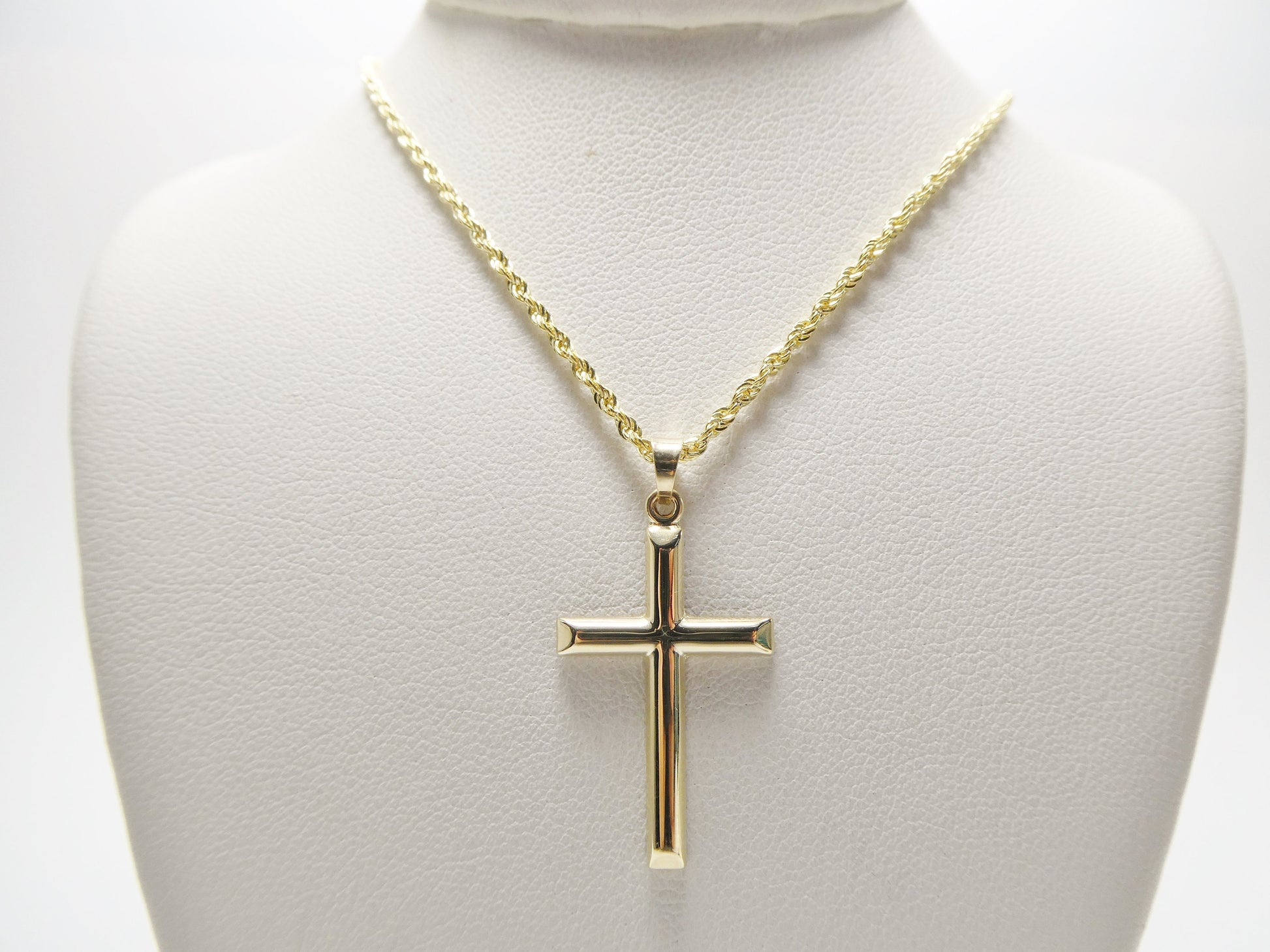 14K SOLID REAL YELLOW GOLD SUPER POLISH CROSS CHARM PENDENT AND ROBE CHAIN COMES IN 16 INCH AND 18 INCH AND 20 INCH LOBSTER LOCK HIGH QUALITY GENUINE HIGH QUALITY HIGH POLISH GREAT FINISH GREAT PRICE GUARANTTE REAL 14K GOLD MARK AND STAMP LUXURAY ATTRACTIVE LOOK COME IN NICE GIFT BOX MAKE IT BEAUTIFUL GIFT FOR ANY OCCASION