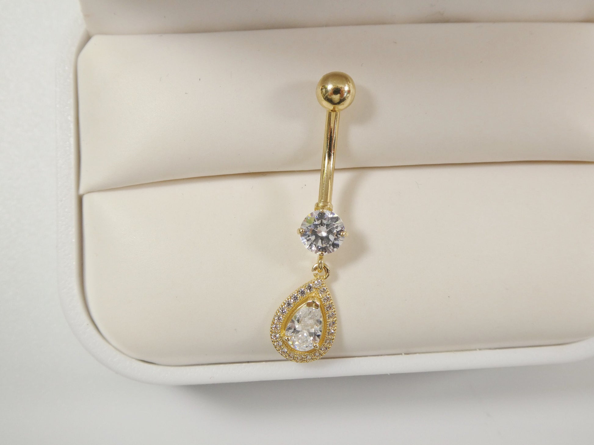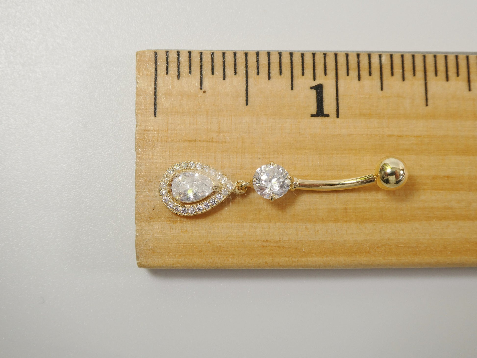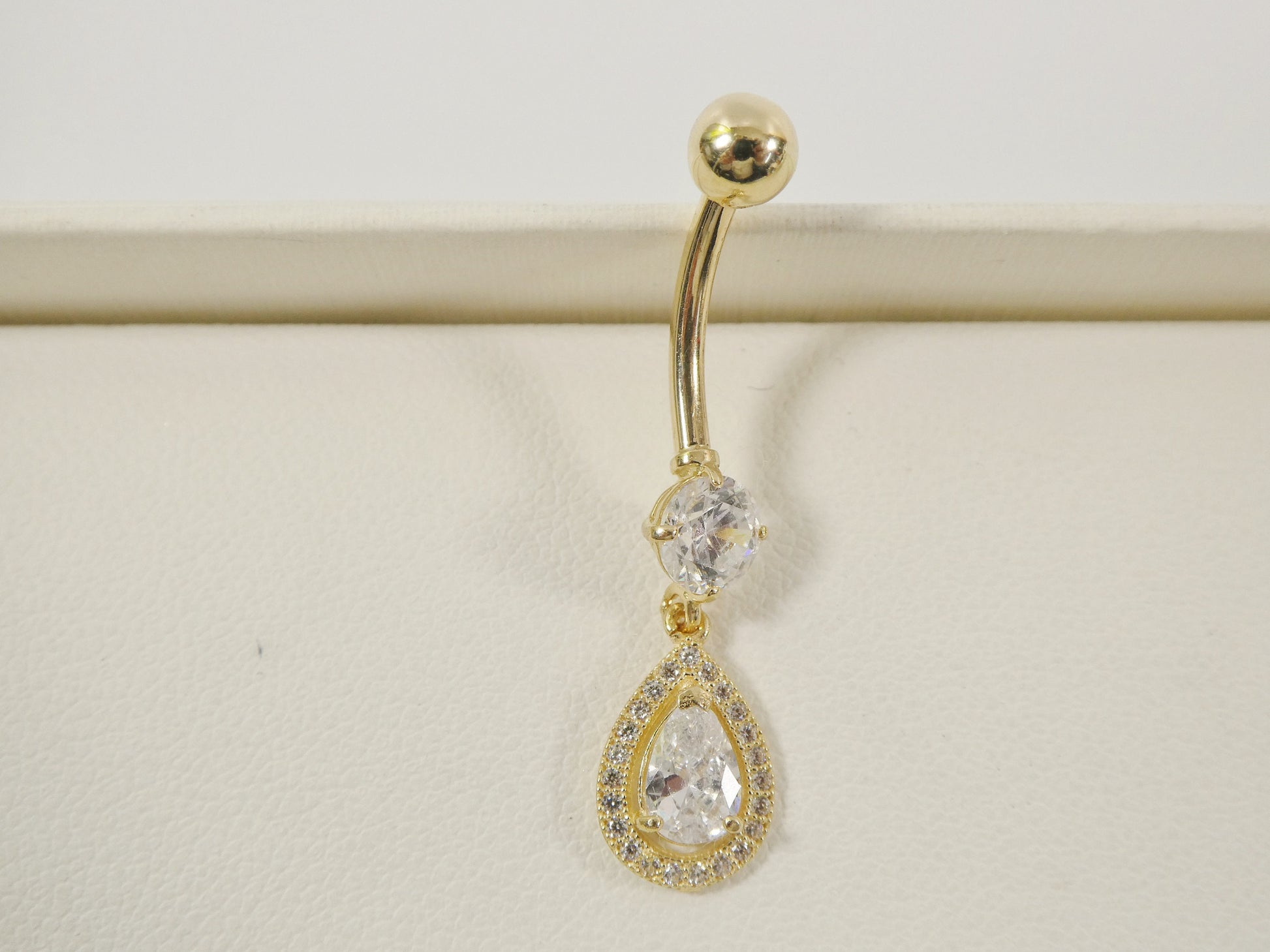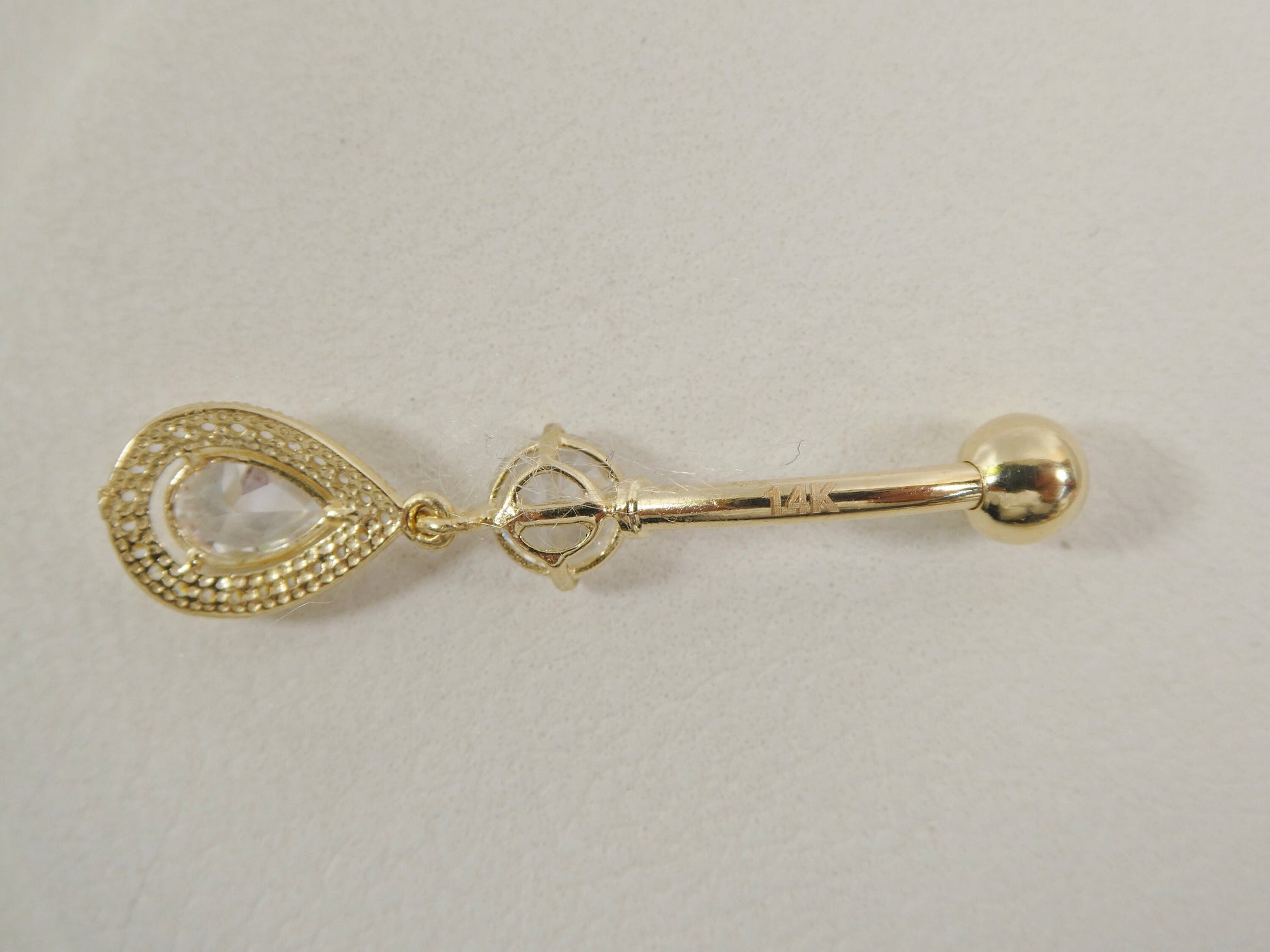 BRAND NEW REAL SOLID 14K YELLOW GOLD TEAR DROP DESIGN BELLY BUTTON RING AAA CUBIC ZIRCONIA SHINY 5MM STONE CENTER HIGH POLISH GREAT FINISH LUXURY ATTRACTIVE LOOK HIGH QUALITY SCREW ON AND OFF GUARANTEE REAL 14K GOLD MARK AND STAMP ON THE BANANA BAR AND THE TOP SRCEW COME IN NICE GIFT BOX MAKE IT PERFECT GIFT FOR ANY OCCASION