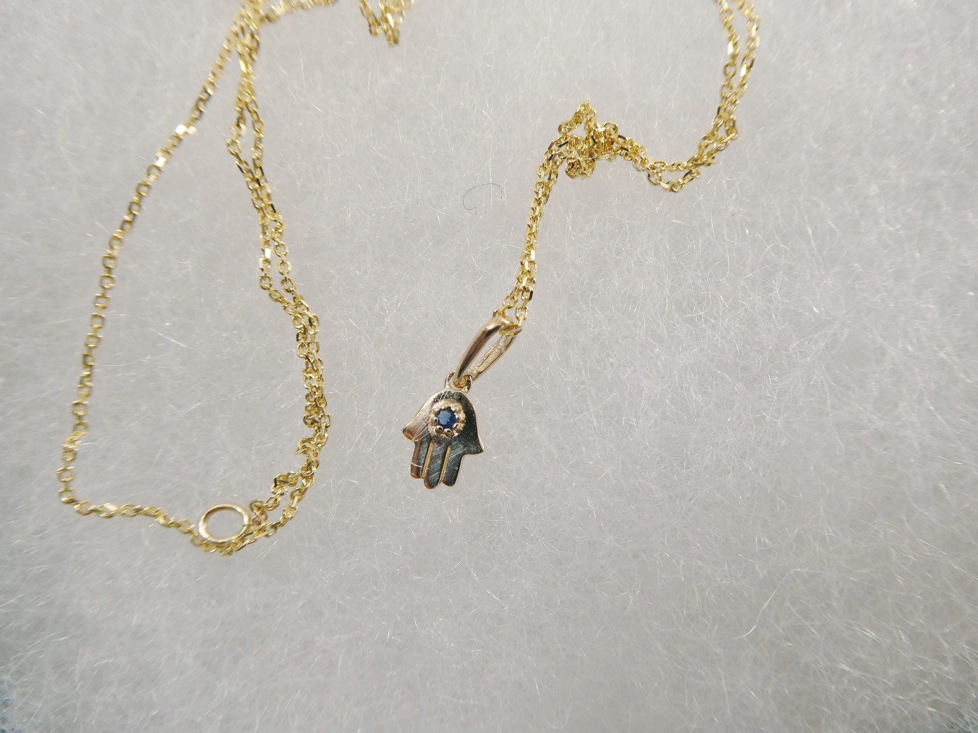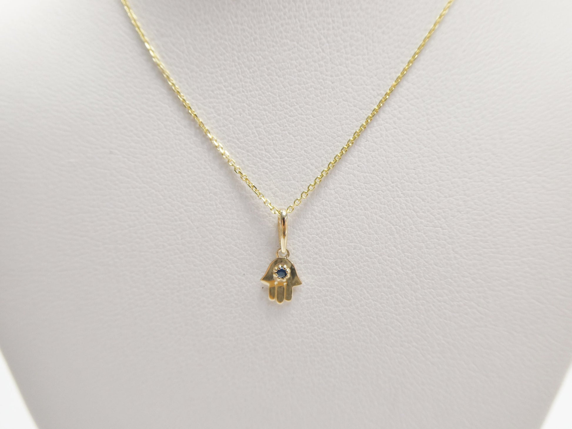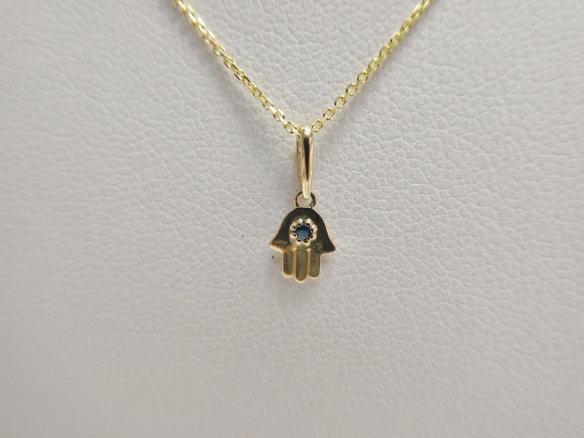 14K SOLID REAL YELLOW GOLD TINY SMALL HAND HAMSA CHARM PENDENT AND CABLE CHAIN COMES IN 16 INCH AND 18 INCH LOBSTER LOCK 2MM SAPPIRE STONE CENTER EVIL EYE HIGH QUALITY GENUINE HIGH QUALITY HIGH POLISH GREAT FINISH GREAT PRICE GUARANTTE REAL 14K GOLD MARK AND STAMP LUXURAY ATTRACTIVE LOOK COME IN NICE GIFT BOX MAKE IT BEAUTIFUL GIFT FOR ANY OCCASION