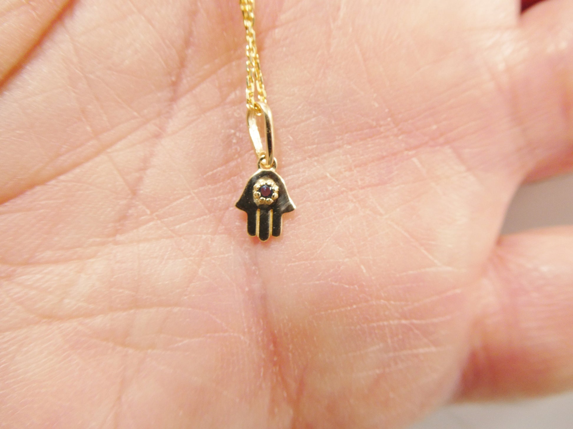 14k real solid yellow gold tiny hand hamsa pendent and cable necklace