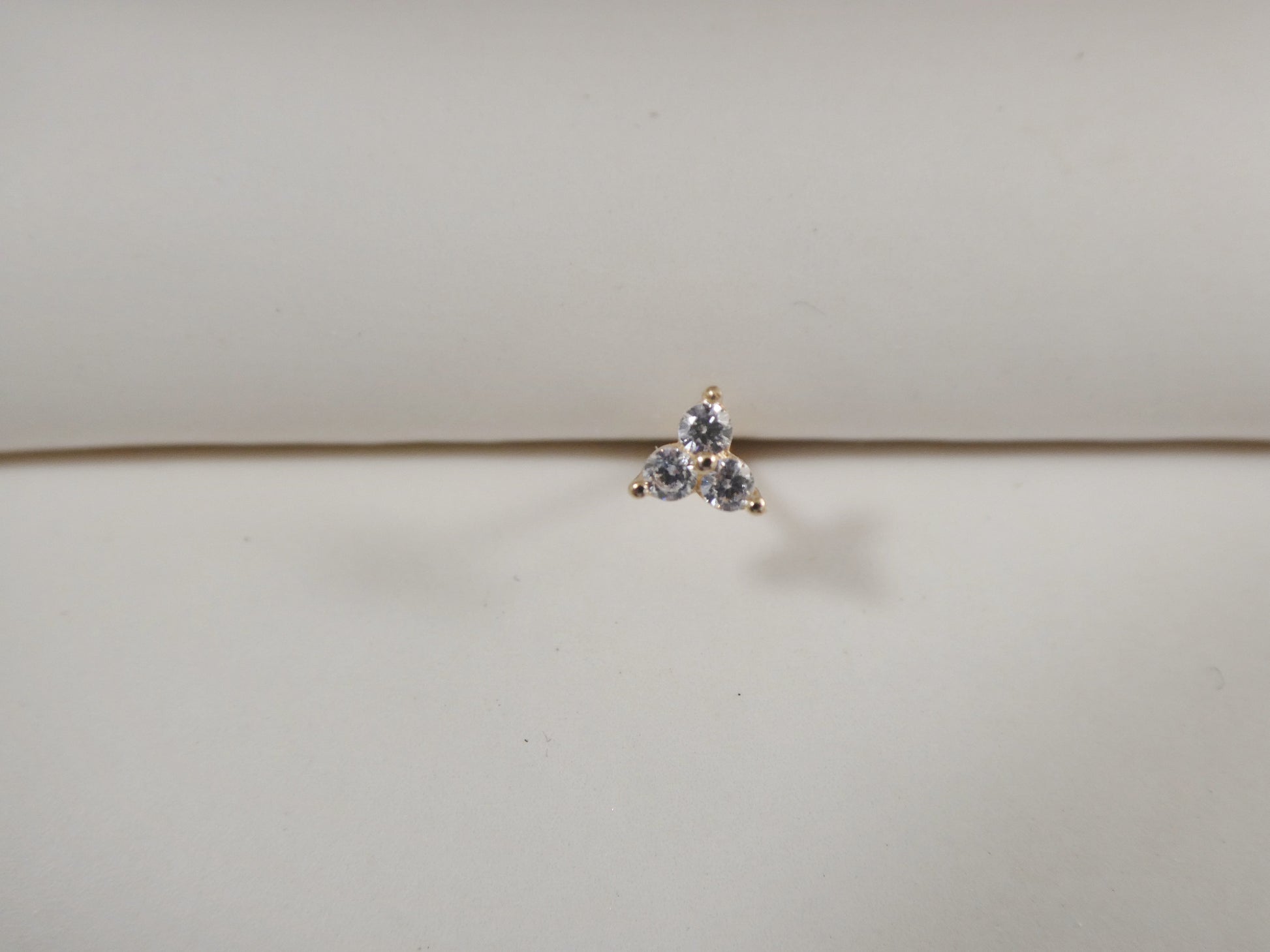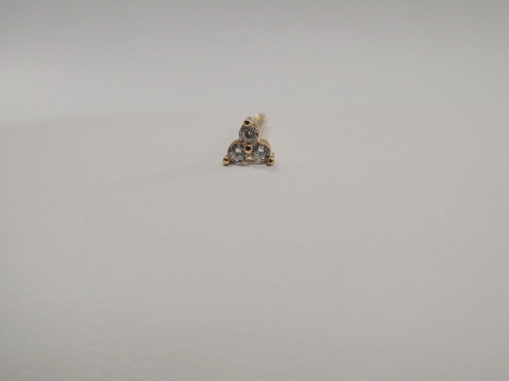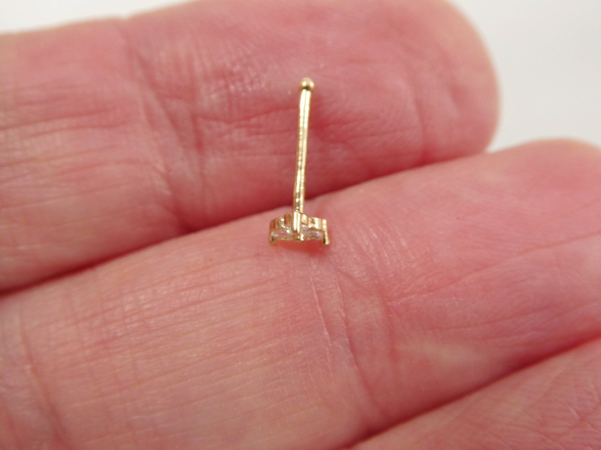 14K REAL SOLID YELLOW GOLD TRINGLE 1.5MM 3 STONE STUD NOSE RING 10.66MM LENGTH HIGH QUALITY HIGH POLISH GUARANTEE REAL 14K GOLD MARK AND STAMP COME IN NICE GIFT BOX