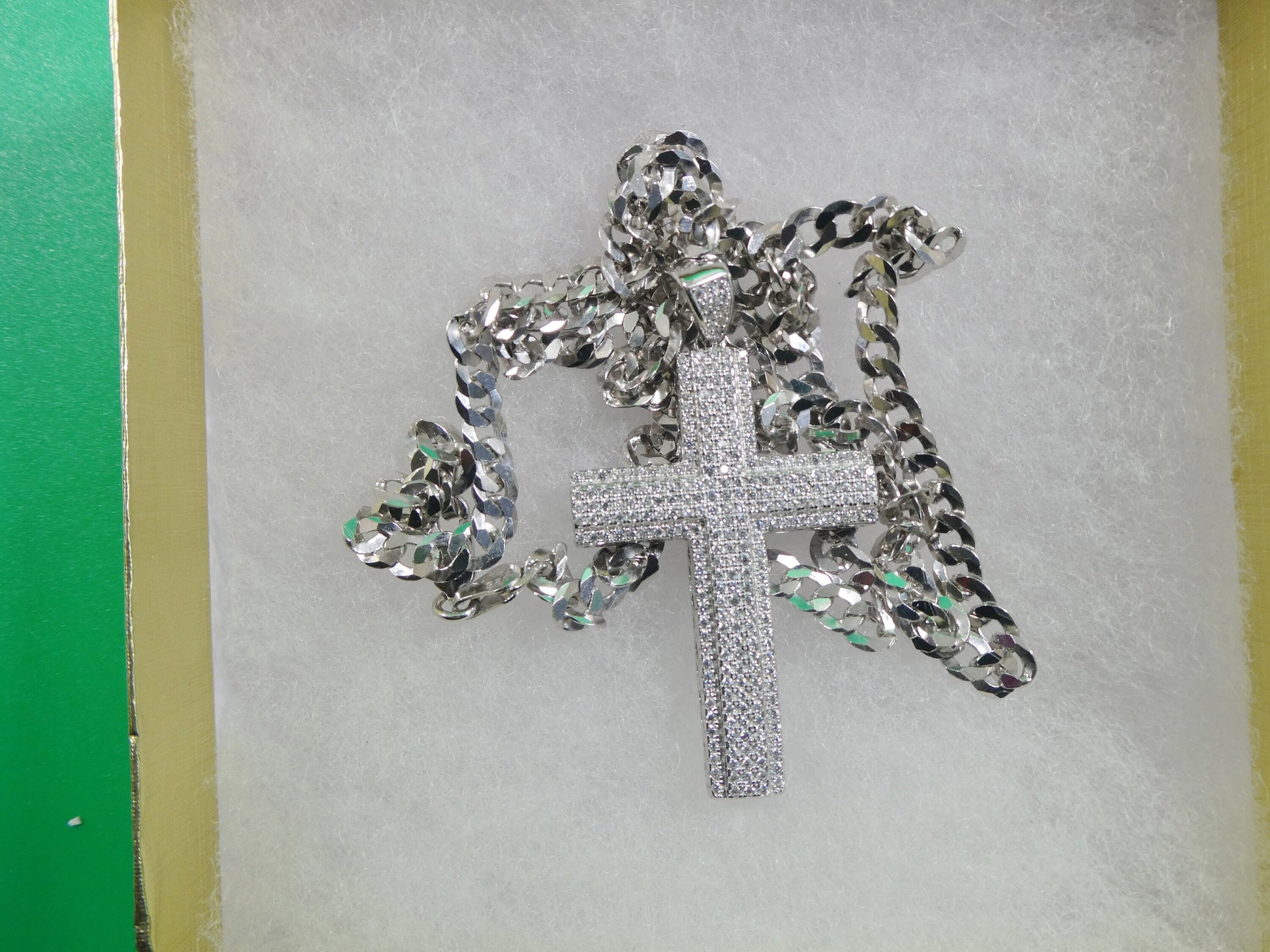 BRAND NEW NEW RELEASE 14K WHITE GOLD TONE COLOR CHAIN AND LARGE CROSS CHARM PENDENT OVER REAL 925 STERLING SILVER 24 INCH ITALYN FLAT MIAMI CUBAN CHAIN LOBSTER CLASP LOCK RHODIUM PLATING FOR LASTER LUXURY ATTRACTIVE LOOK EXCELLENT GOLD COLOR FINISH HIGH POLISH GREAT PRICE COME IN NICE GIFT BOX PERFECT GIFT FOR ANY OCCASION