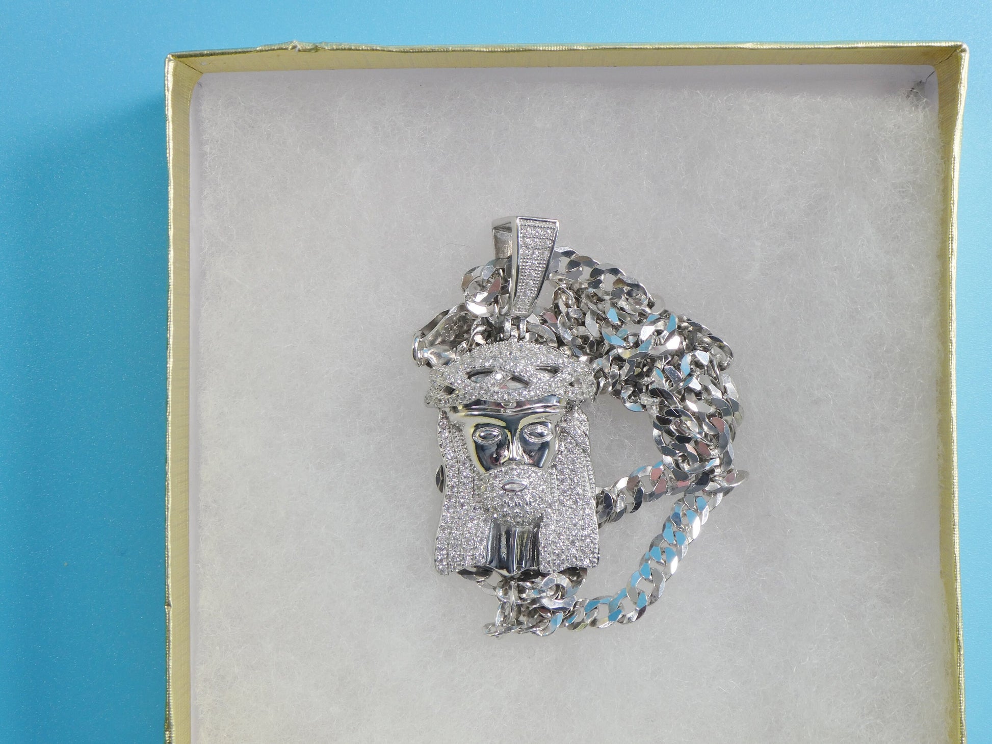 14k white gold color tone chain and large Jesus face charm pendent over real 925 sterling silver