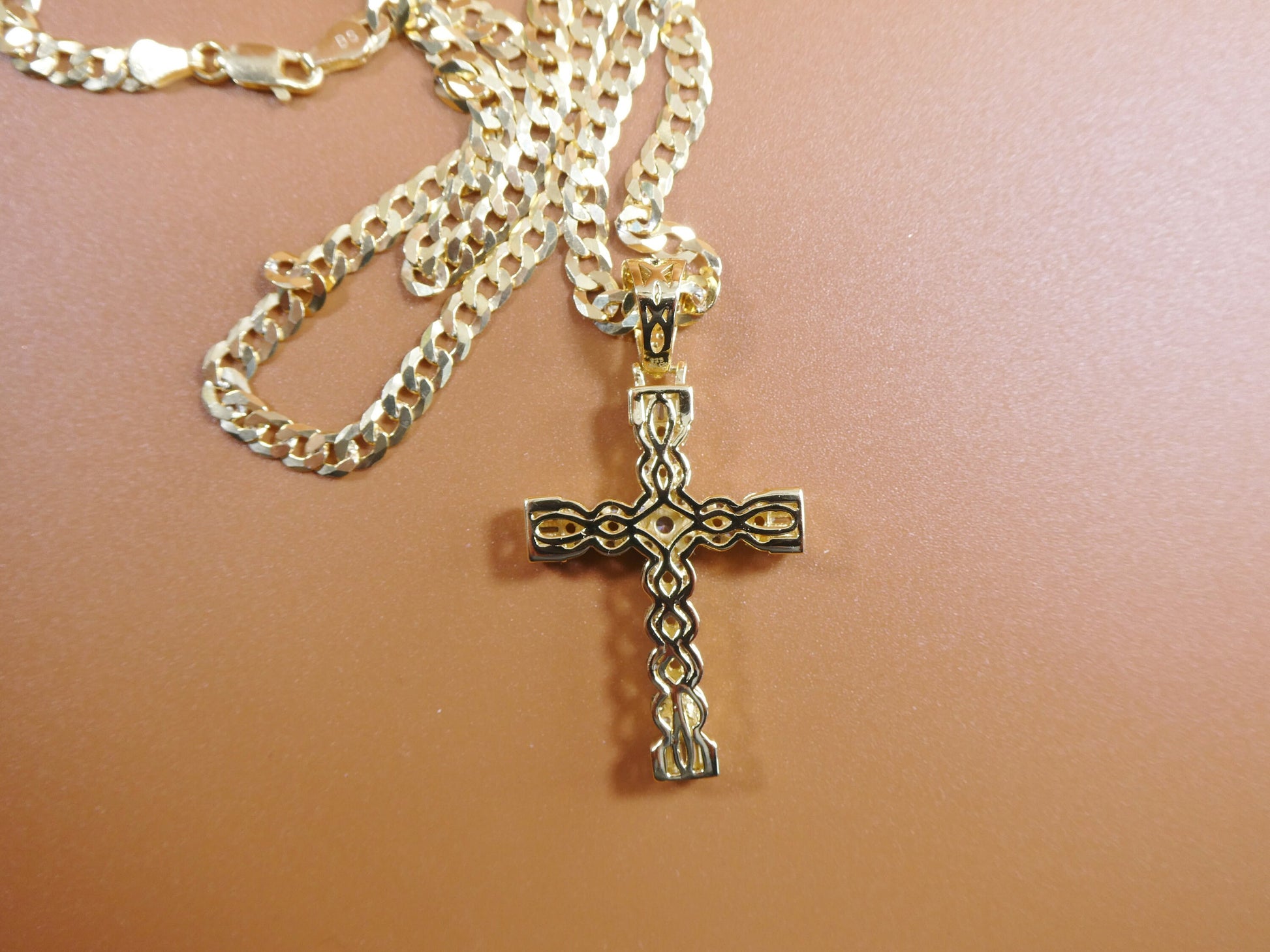 14k yellow gold color tone chain and cross charm pendent over real 925 sterling silver