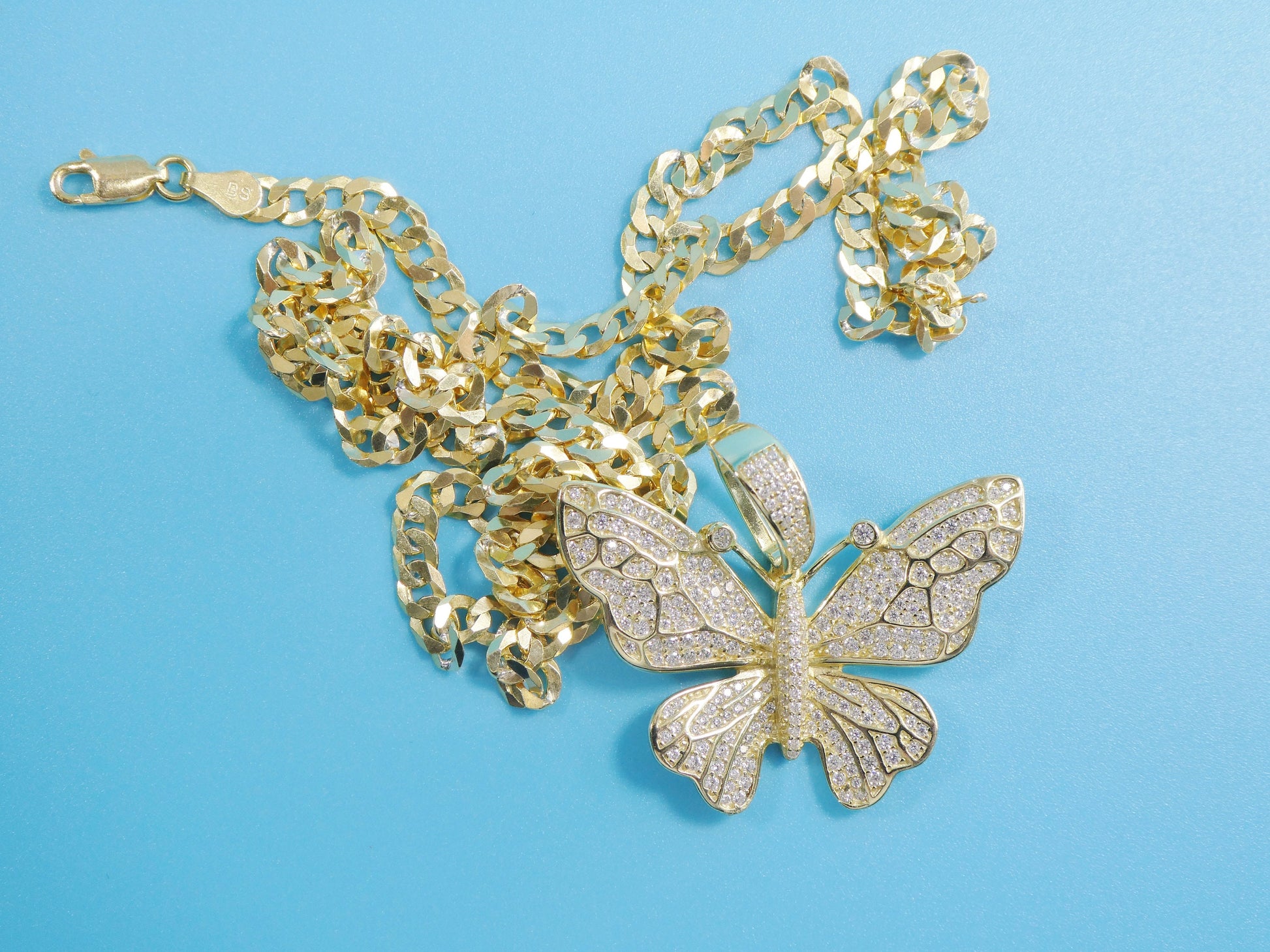 14k yellow gold color tone chain and large butterfly charm pendent over real 925 sterling silver