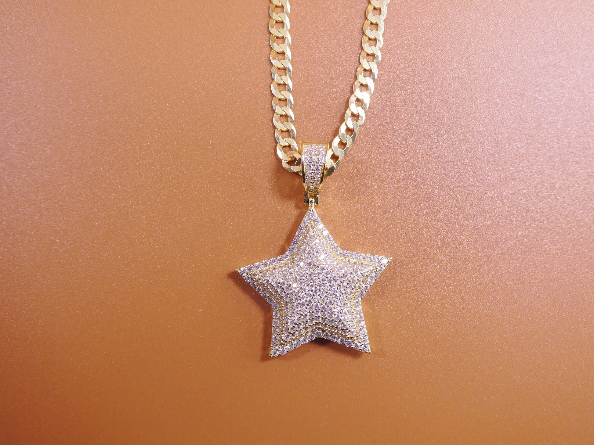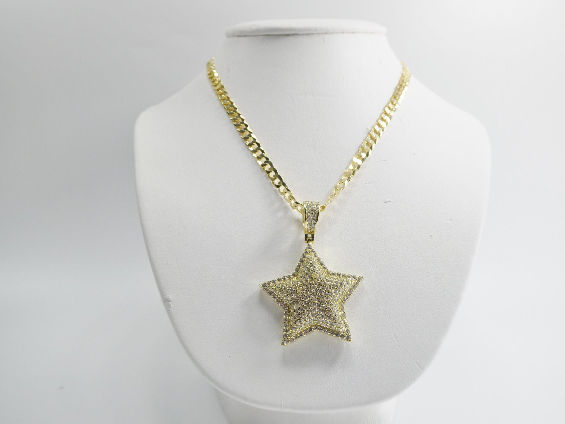 BRAND NEW NEW RELEASE 14K GOLD TONE COLOR CHAIN AND STAR CHARM PENDENT OVER REAL 925 STERLING SILVER 24 INCH ITALYN FLAT MIAMI CUBAN CHAIN LOBSTER CLASP LOCK LUXURY ATTRACTIVE LOOK EXCELLENT GOLD COLOR FINISH HIGH POLISH GREAT PRICE COME IN NICE GIFT BOX PERFECT GIFT FOR ANY OCCASION