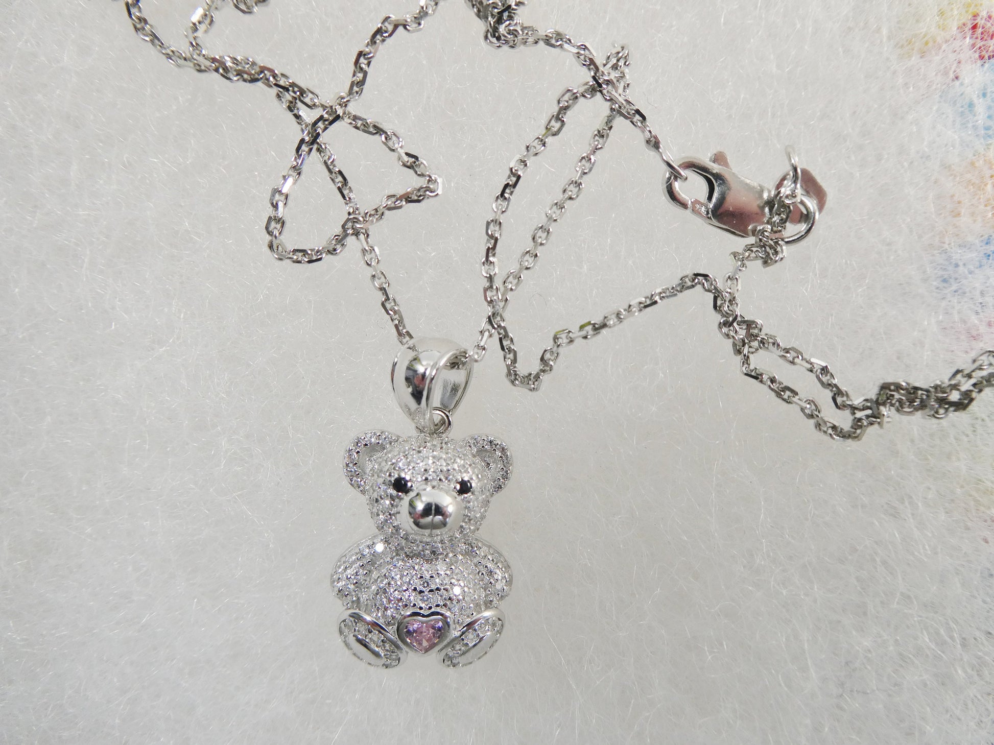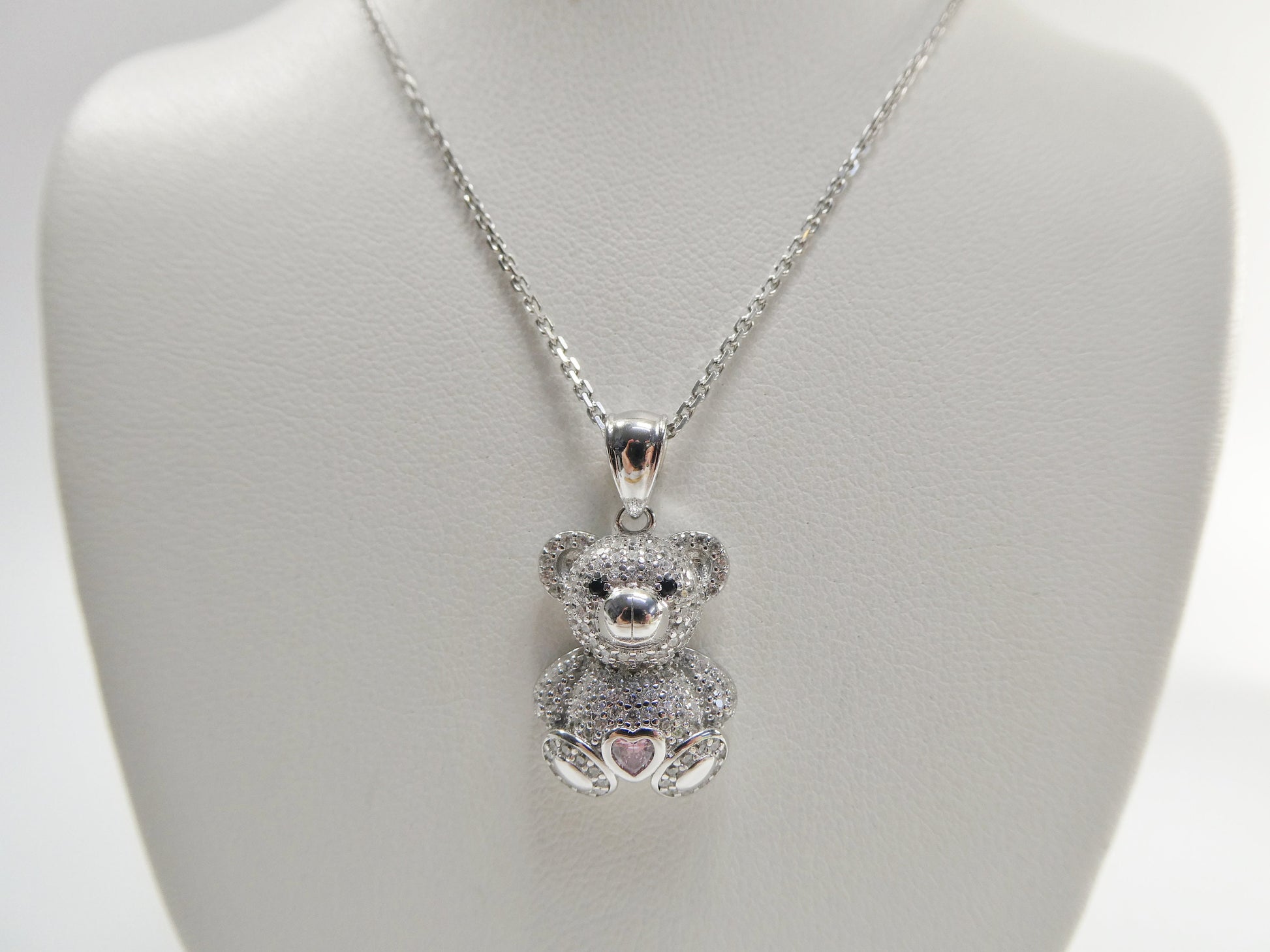 REAL 925 STERLING SILVER TEDDY BEAR WITH PINK STONE CENTER 16 INCH CABLE CHAIN AND TEDDY BEAR PENDENT FULL ICE CUBIC ZIRCONIA SHINY STONE CABLE STYLE CHAIN LOBSTER CLASP LOCK RHODIUM PLATED FOR LASTING HIGH QUALITY HIGH POLISH GREAT PRICE MARK AND STAMP COME IN NICE GIFT BOX