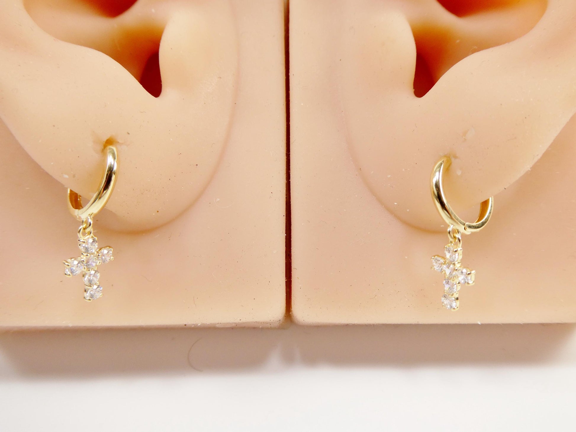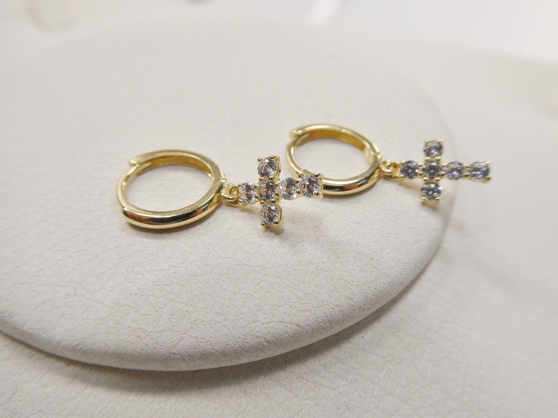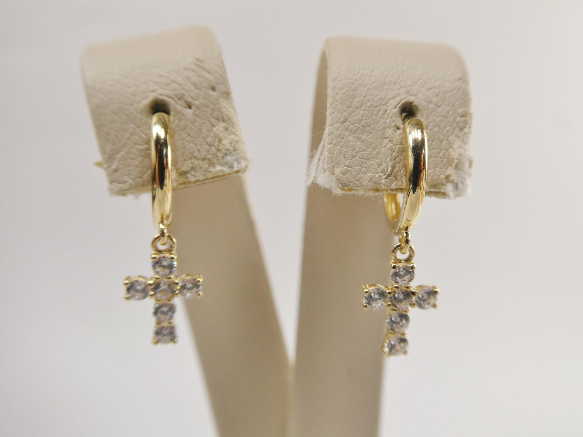 real 10k solid yellow gold cross dropping hoop huggie earrings