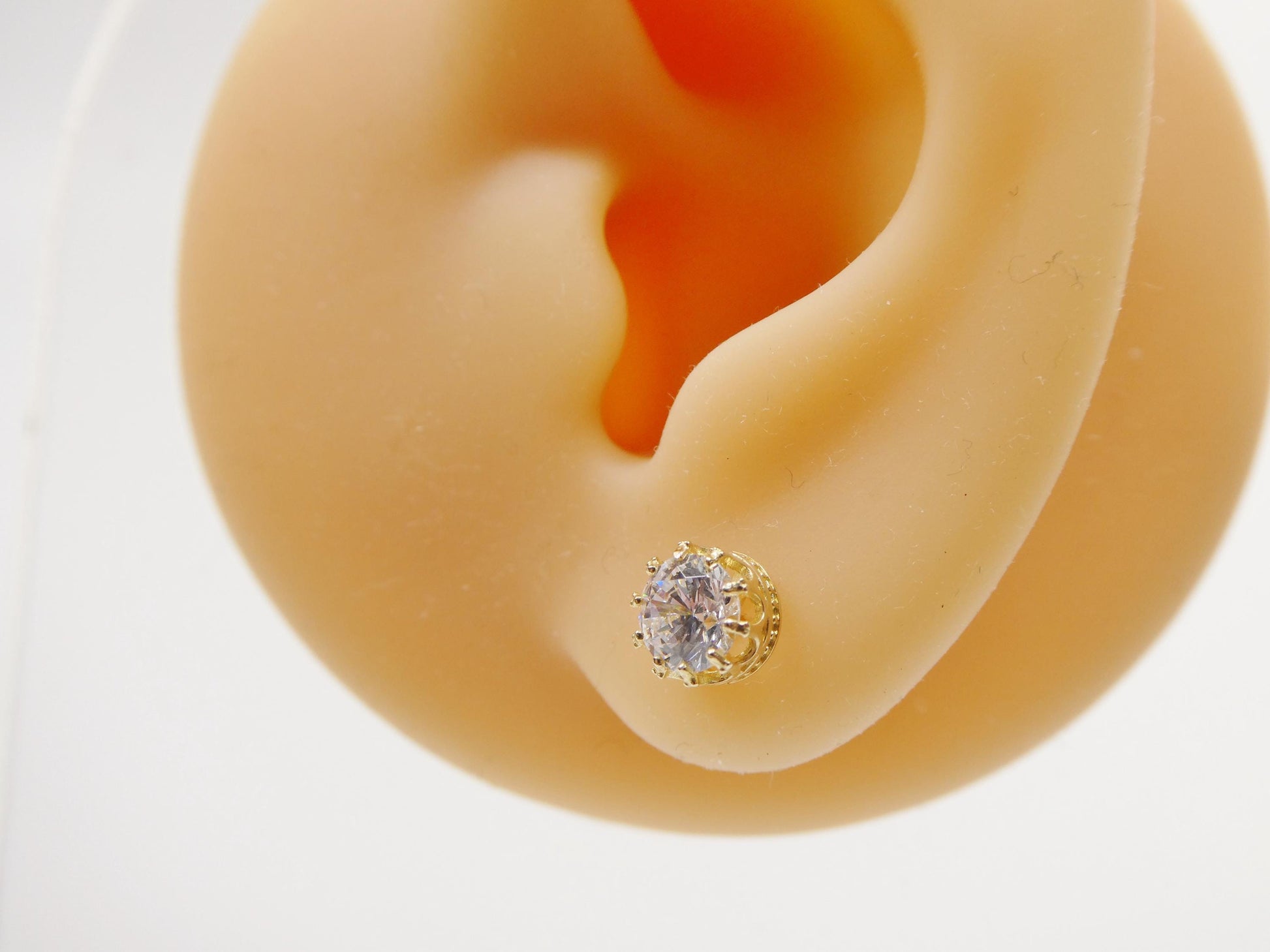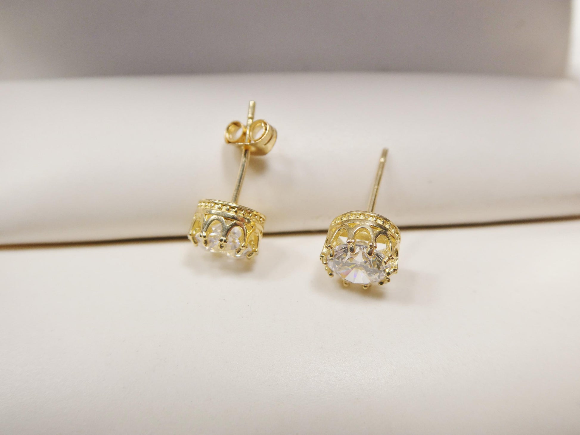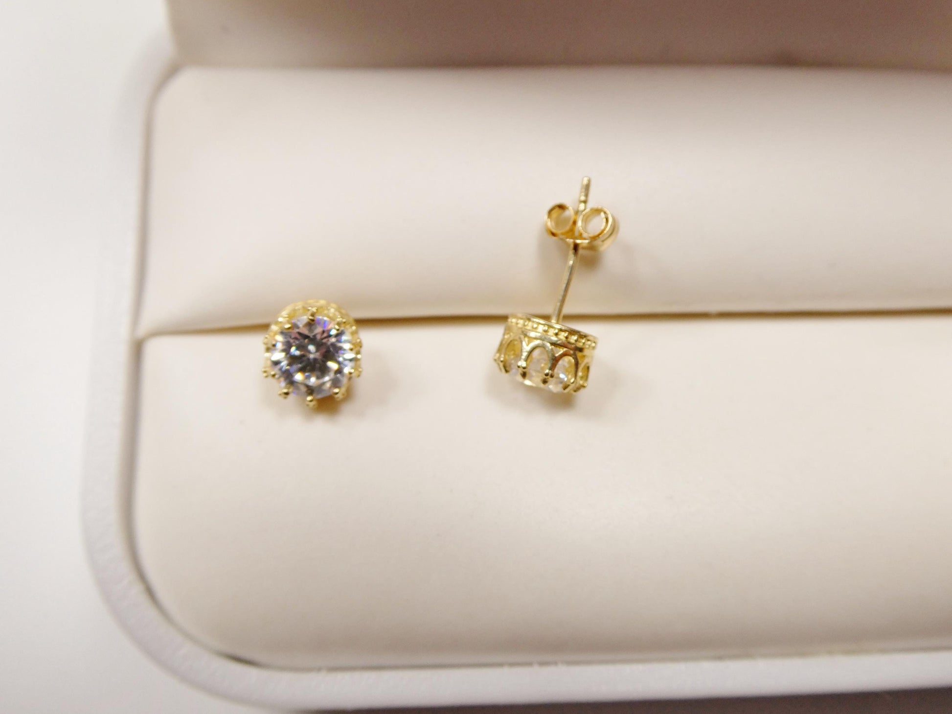 10K REAL SOLID YELLOW GOLD 6MM CROWN CIRCLE PUSH POST STUD EARRING 5MM AAA SHINY CUBIC ZIRCONIA HIGH QUALITY HIGH POLISH GUARANTEE REAL 10K GOLD MARK AND STAMP COME WITH FREE GOLD FILLED BACKING COME IN NICE GIFT BOX MAKE IT GREAT GIFT FOR ANY OCCASION