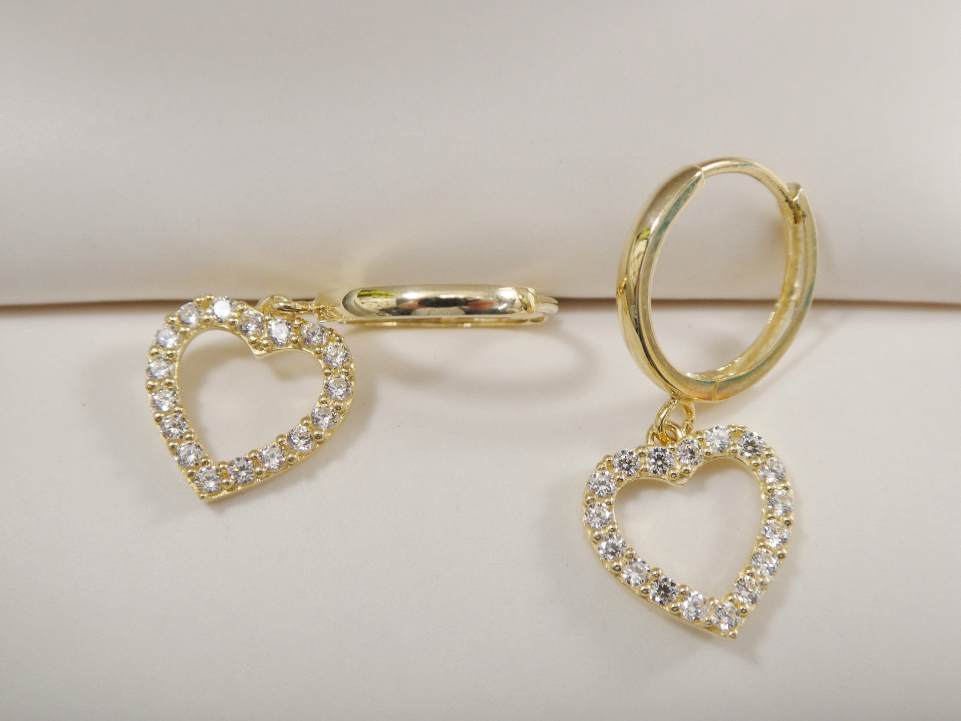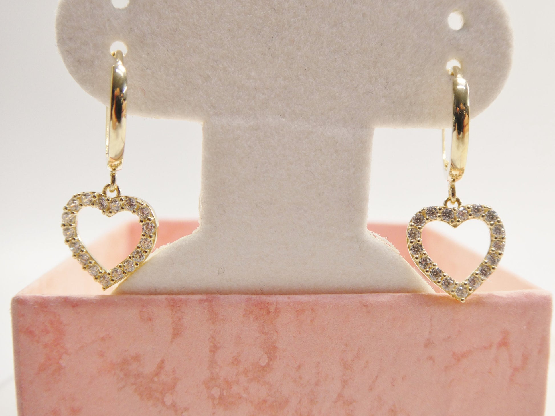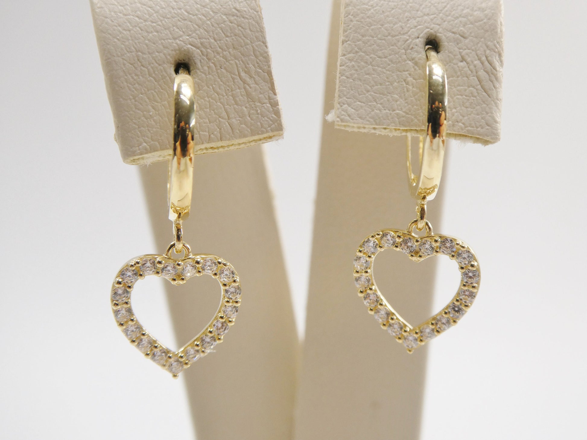 REAL 10K SOLID YELLOW GOLD HEART DANGLING FULL MICRO FAVE ONE MM STONE SETTING AAA SHINY STONE ON 11.5MM PLAIN HUGGIE HOOP EARRING HIGH QUALITY HIGH POLISH PERFECT FINISH GUARANTEE 10K GOLD MARK AND STAMP (NOT GOLD FILLED OR GOLD PLATING ) COME IN NICE GIFT BOX MAKE IT GREAT GIFT FOR ANY OCCASION