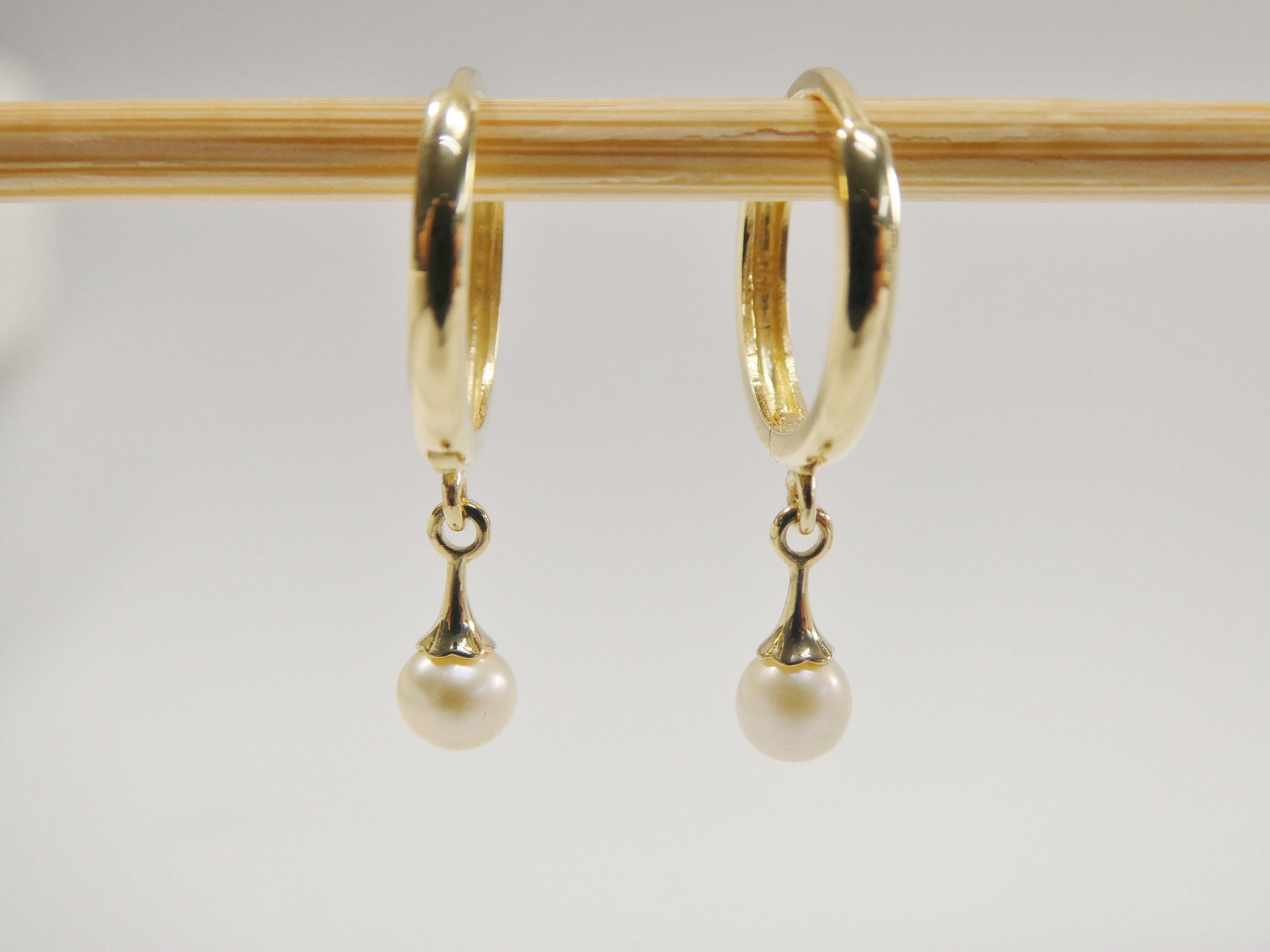 real 10k solid yellow gold dangling cultured freshwater pearl plain hoop huggie earrings