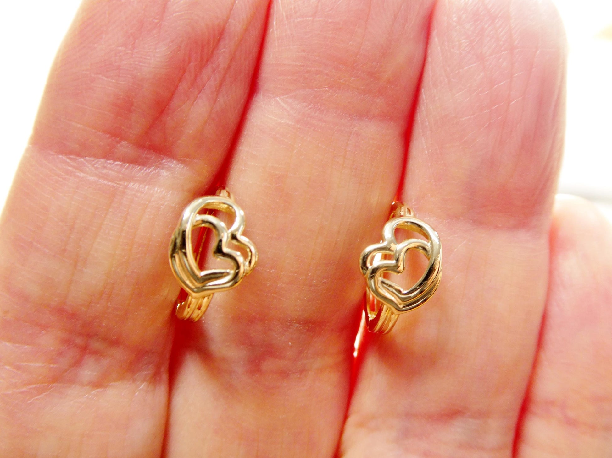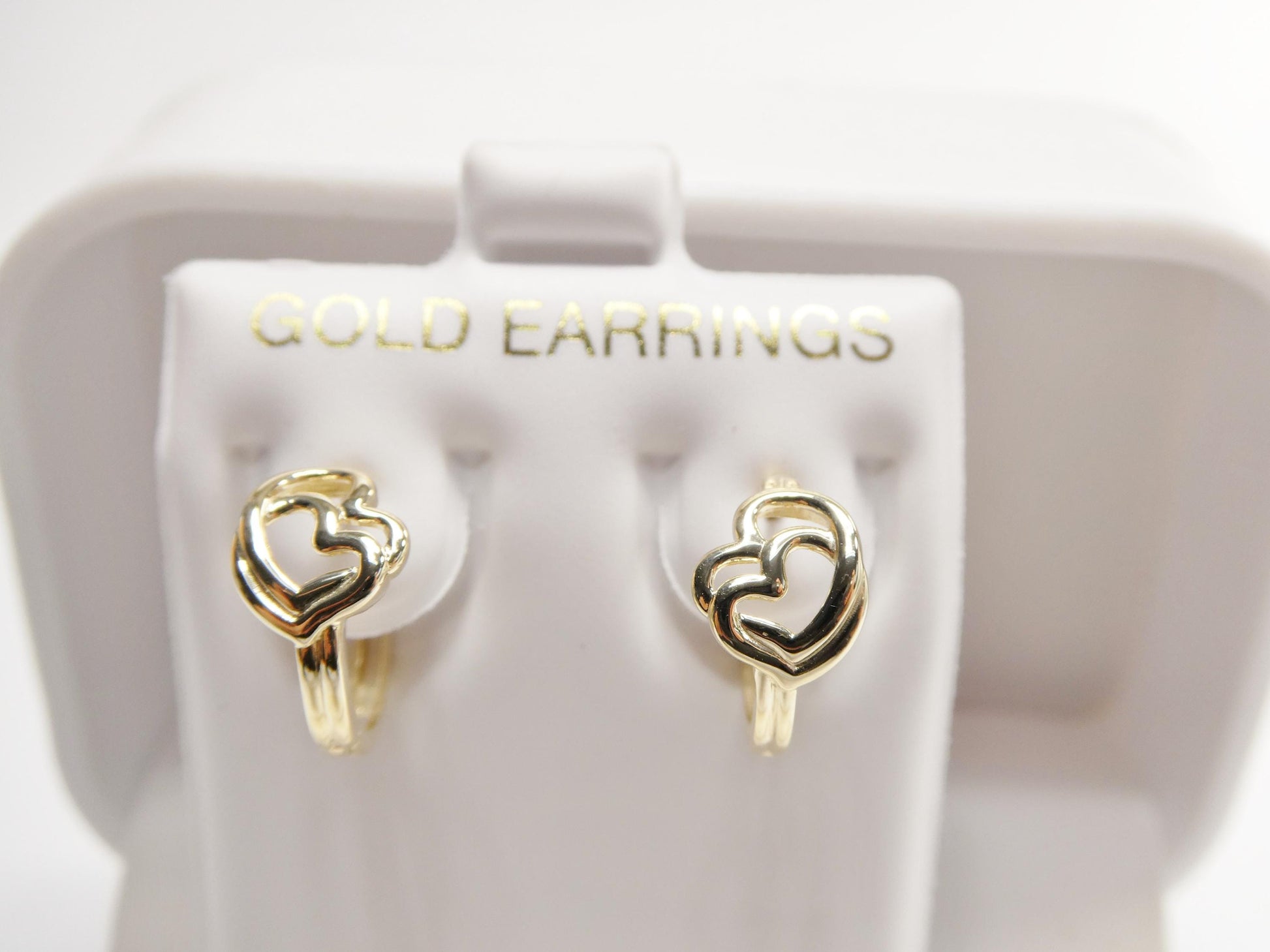 real 10k solid yellow gold designer double heart hoop huggie earrings