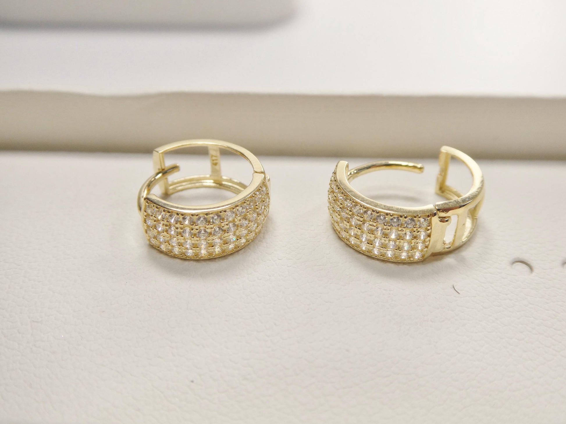REAL 10K SOLID YELLOW GOLD DESIGNER HUGGIE HOOP EARRINGS 4 LINE AAA FULL ICE SHINY CUBIC ZIRCONIA STONE MICRO FAVE SETTING HIGH QUALITY HIGH POLISH PERFECT FINISH GUARANTEE 10K GOLD MARK AND STAMP (NOT GOLD FILLED OR GOLD PLATING ) COME IN NICE GIFT BOX MAKE IT GREAT GIFT FOR ANY OCCASION