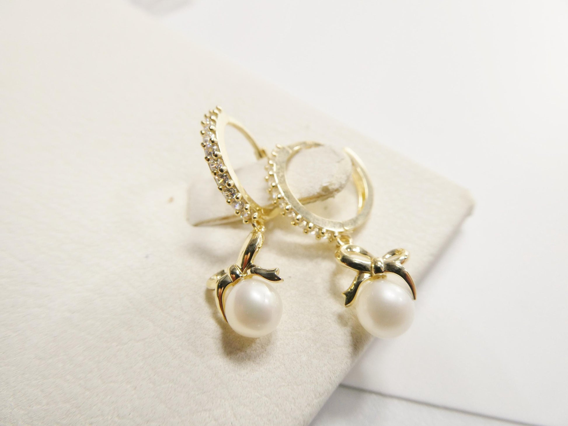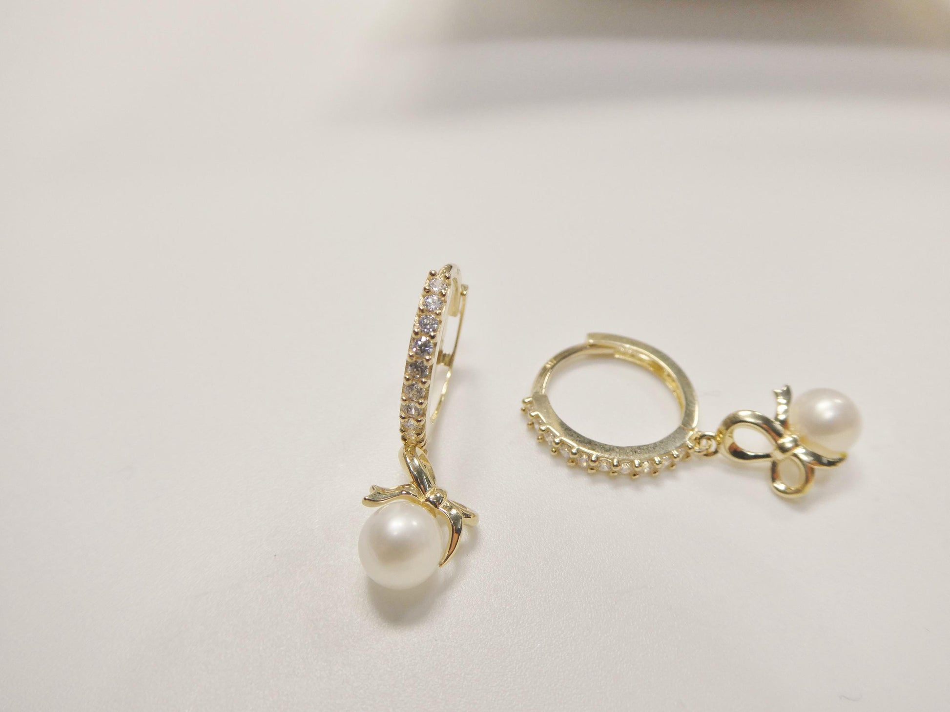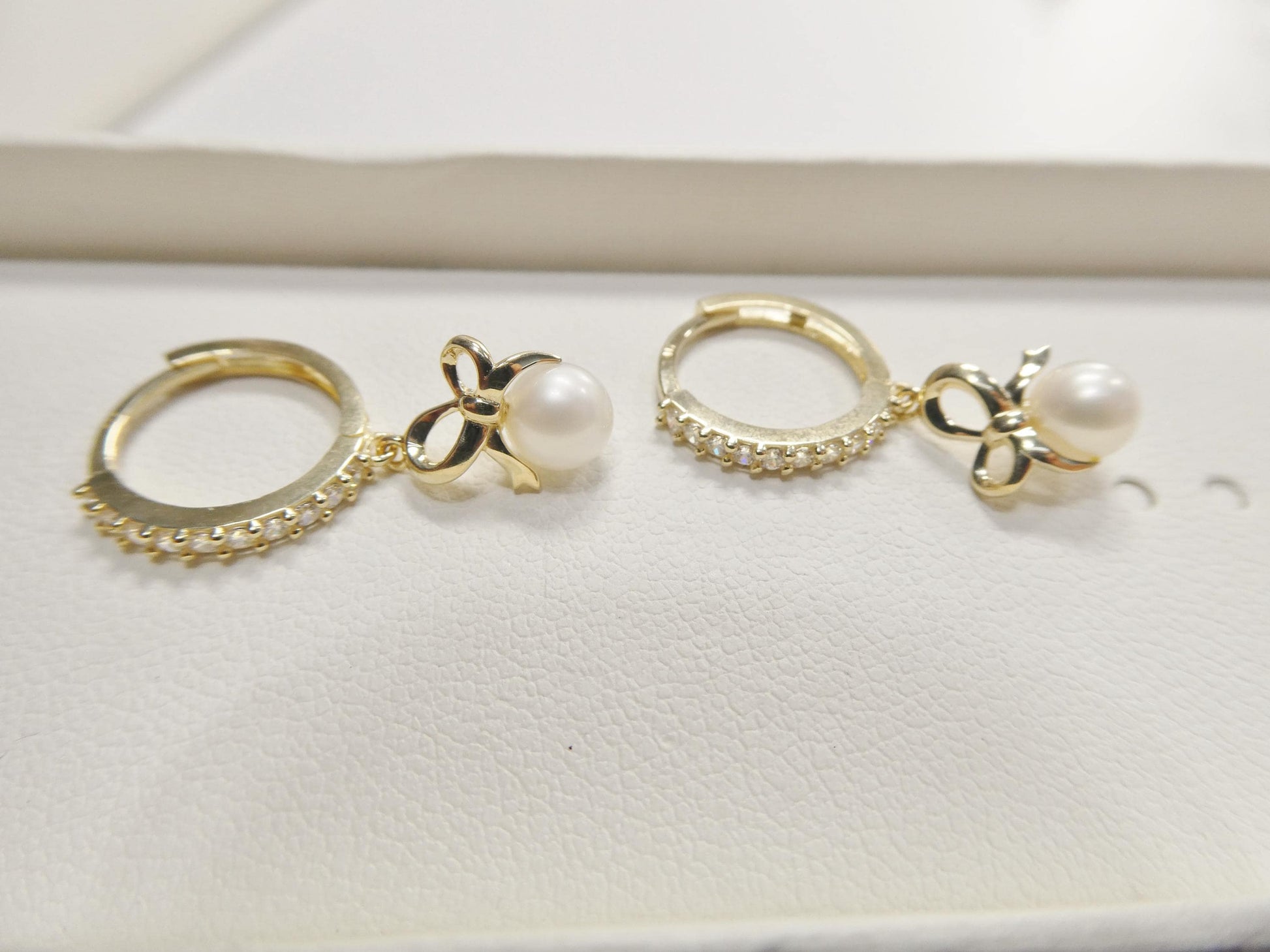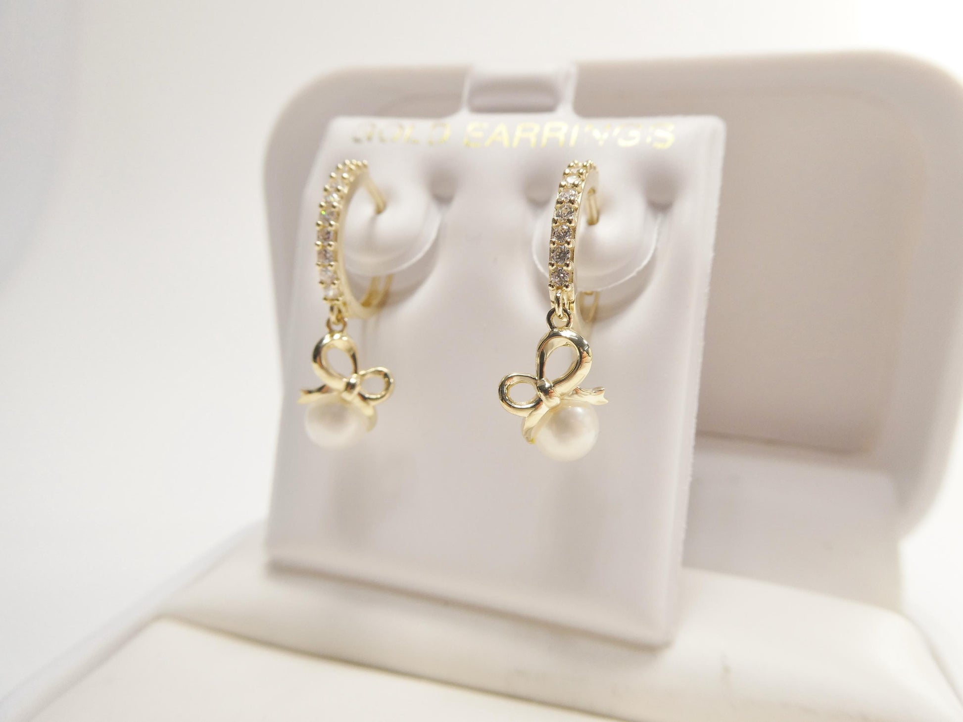 real 10k solid yellow gold designer pearl drop hoop huggie earrings