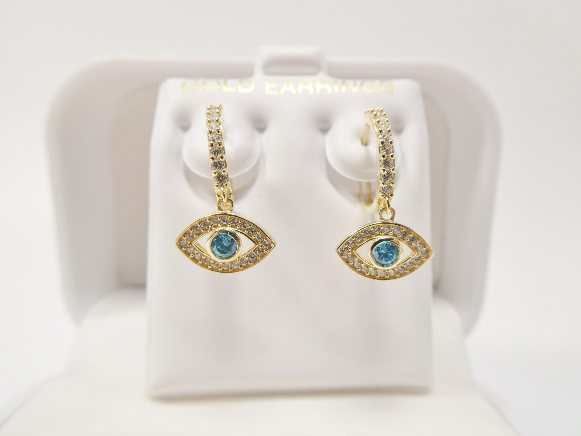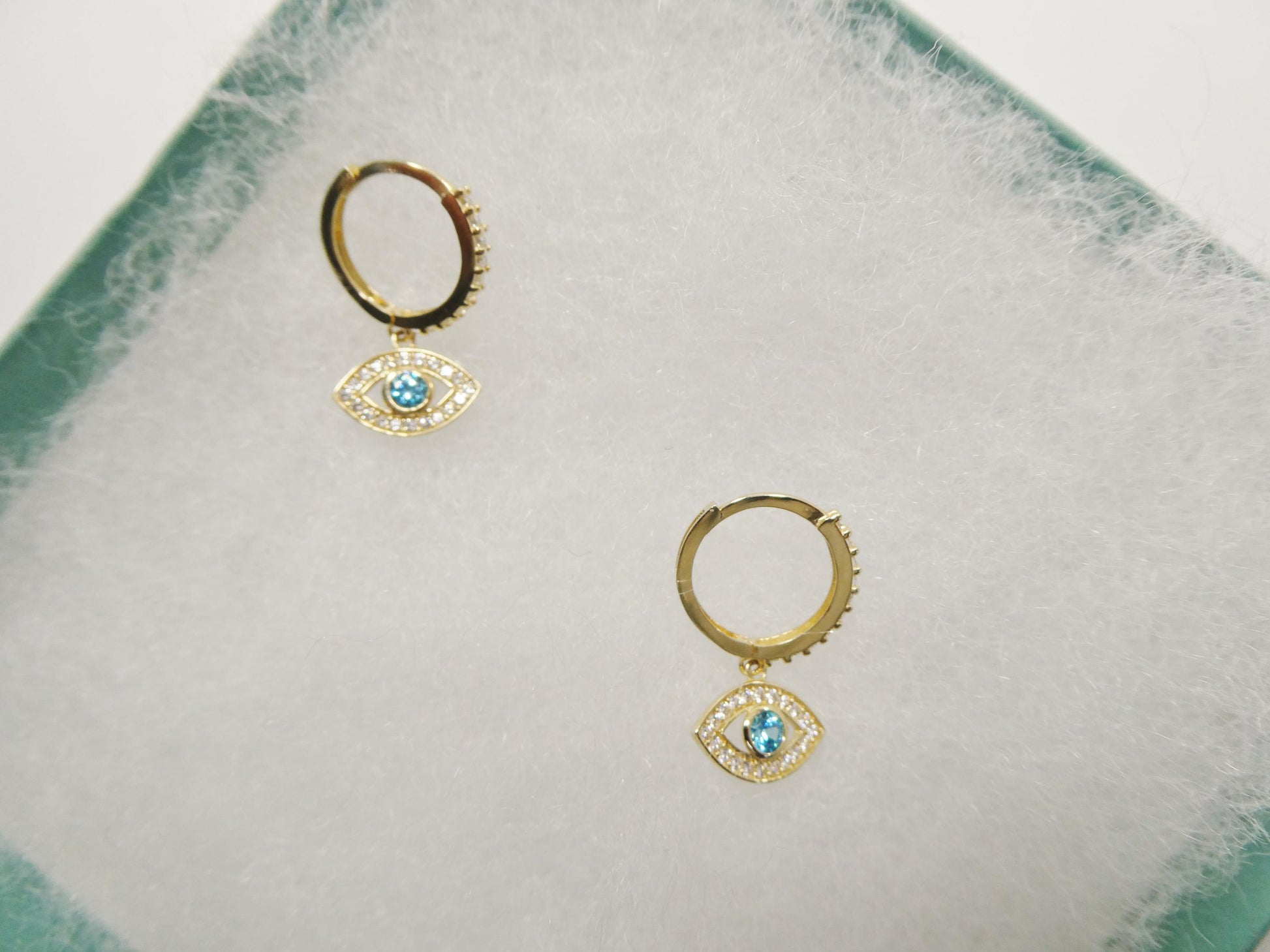real 10k solid yellow gold evil eye drop hoop huggie earrings
