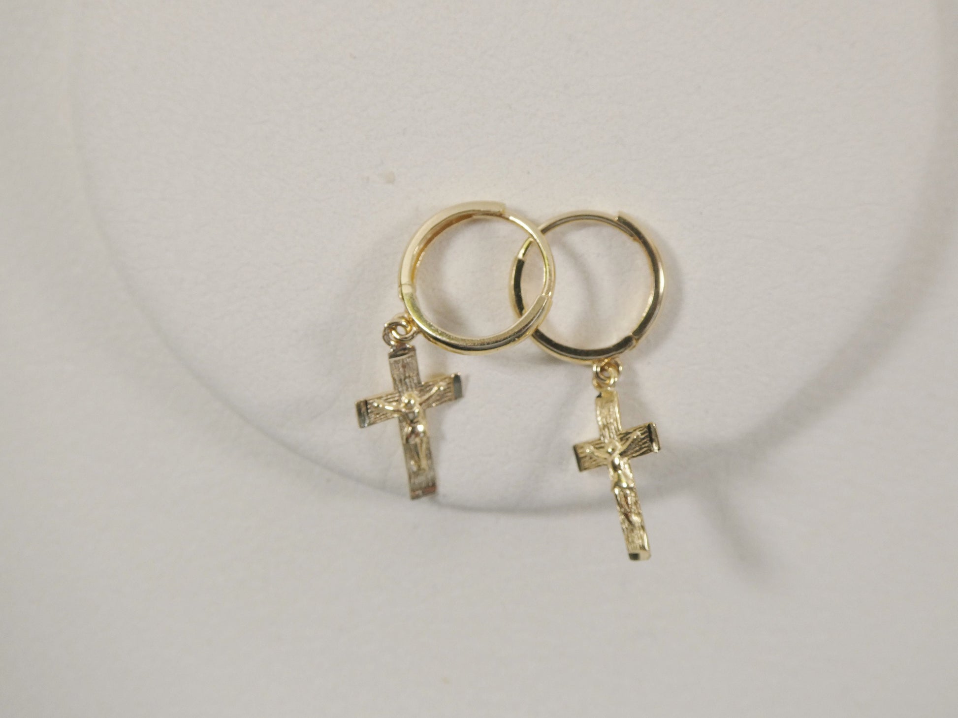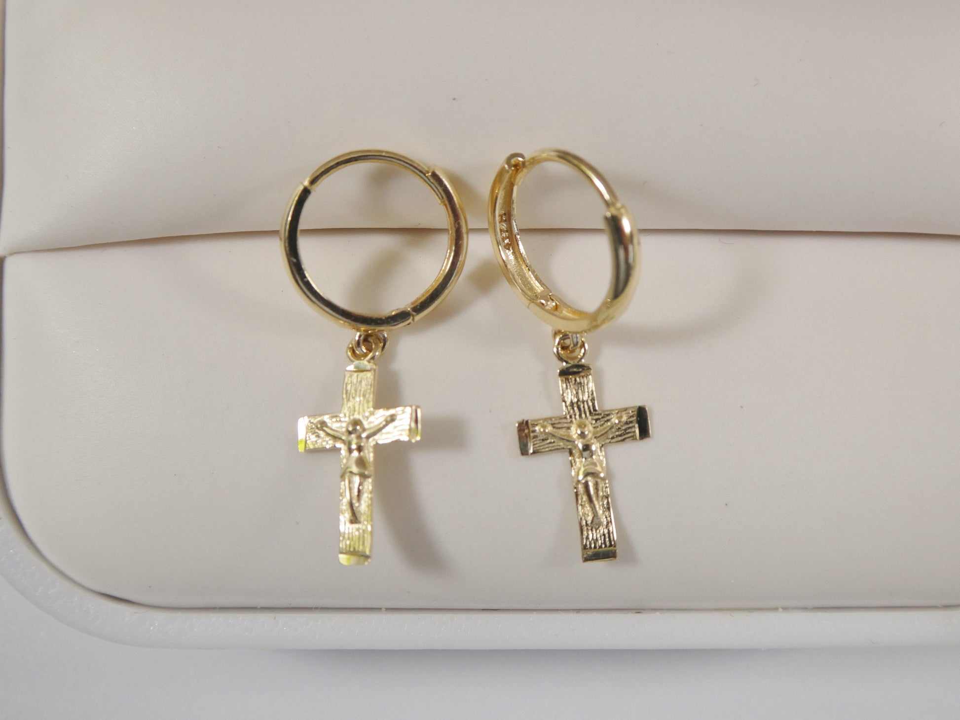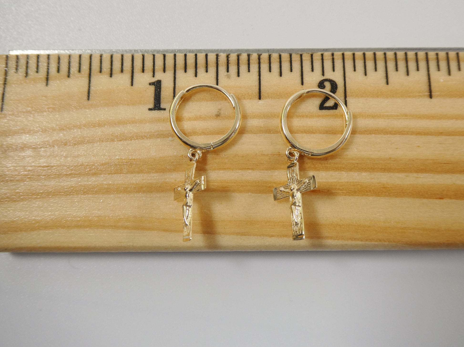real 10k solid yellow gold hoop huggie dangle cross earring