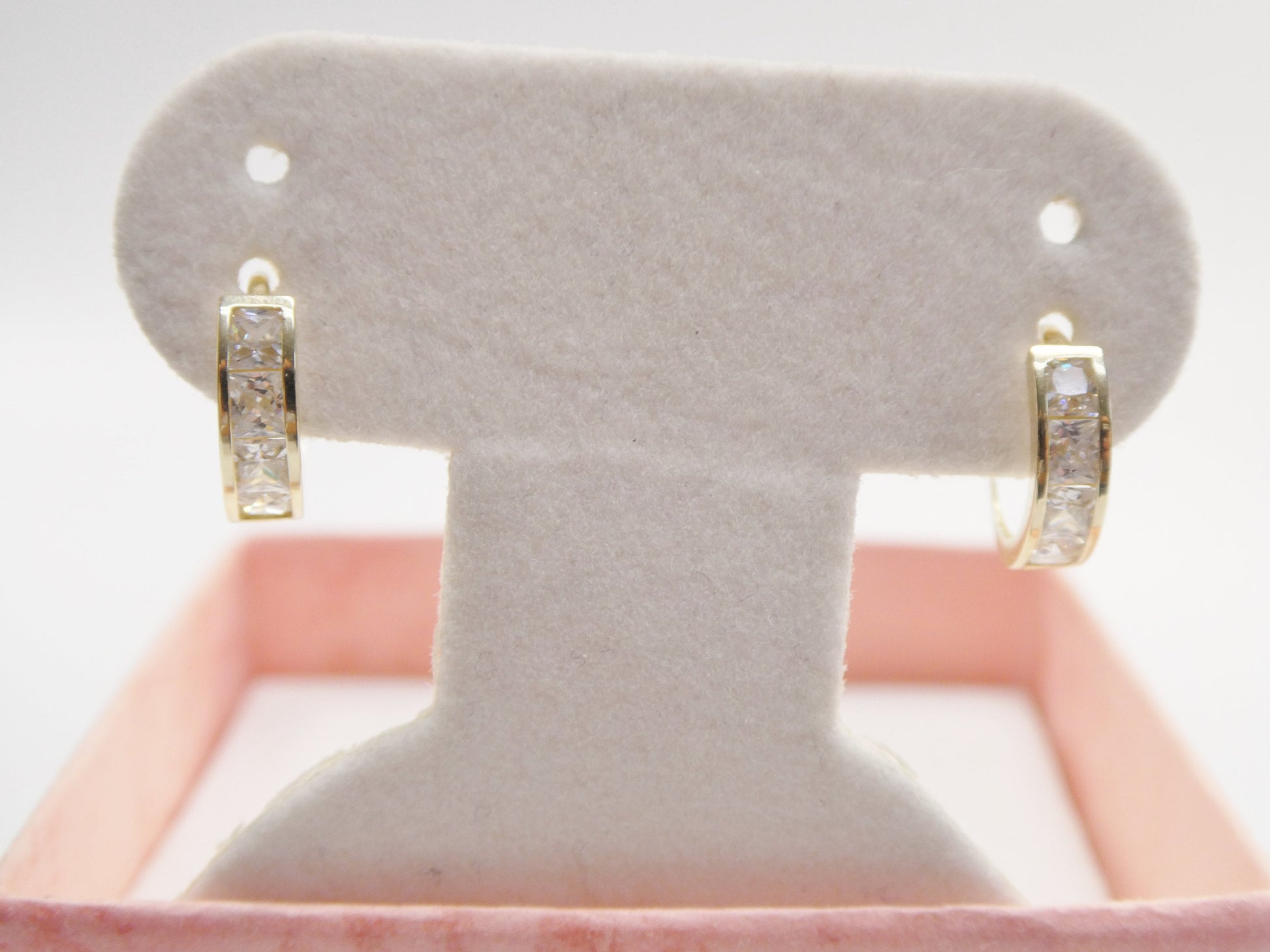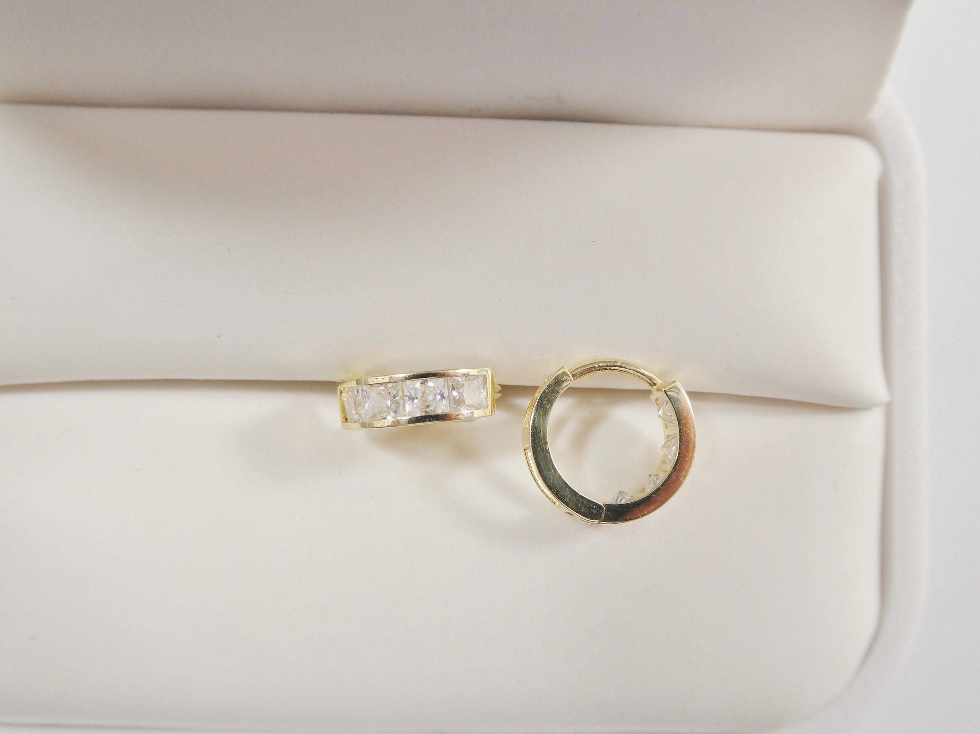 REAL 10K SOLID YELLOW GOLD SMALL 10MM PRINCESS-CUT SHINY CUBIZ ZIRCONIA HIGH POLISH HUGGIE HOOP EARRING HIGH QUALITY HIGH POLISH PERFECT FINISH GUARANTEE 10K GOLD MARK AND STAMP( NOT GOLD PLATED OR GOLD FILLED ) COME IN NICE GIFT BOX MAKE IT GREAT GIFT FOR ANY OCCASION