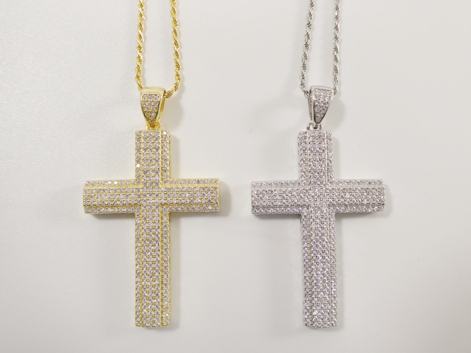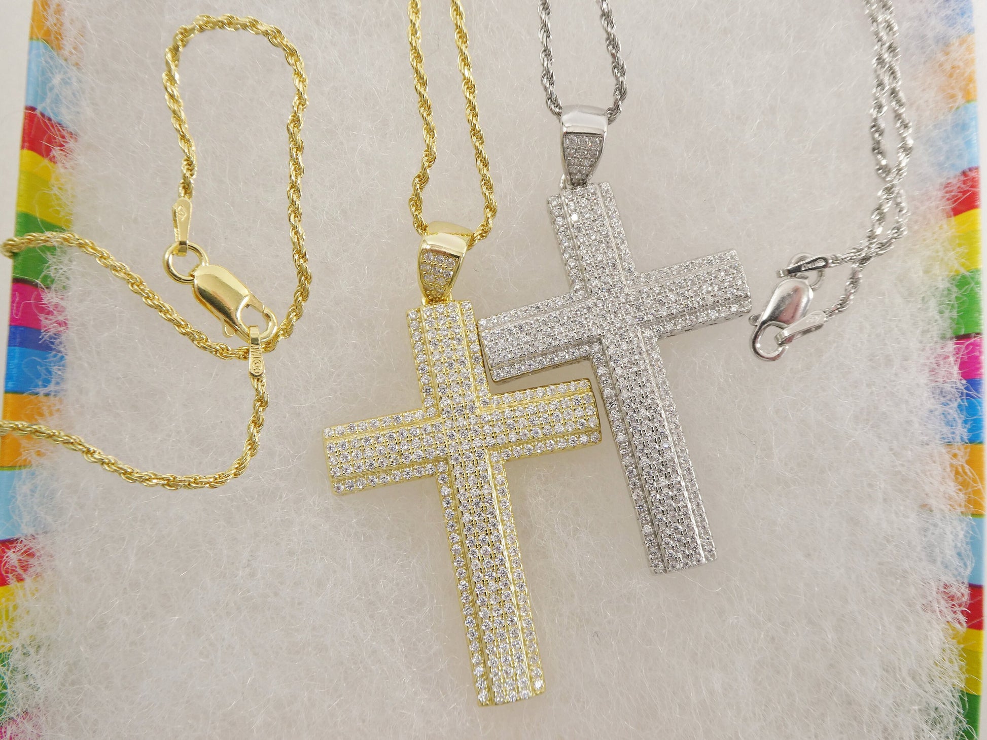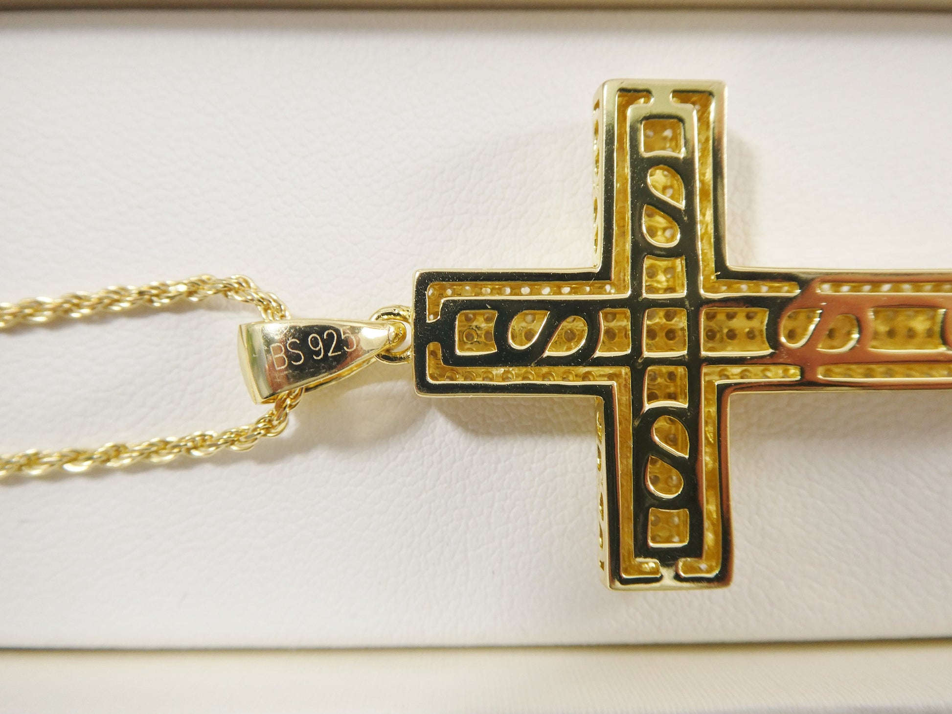 BRAND NEW REAL 925 STERLING SILVER 14K YELLOW GOLD SILVER / COLOR TONE 2MM 18 INCH ROBE CHAIN AND CROSS PENDENT FULL STONE SETTING LOBSTER LOCK CLASP LUXURY ATTRACTIVE LOOK GREAT GREAT PRICE RHODIUM PLATED FOR LASTING FINISH GOLD COLOR COME IN NICE GIFT BOX MAKE IT GREAT GIFT FOR ANY OCCASION