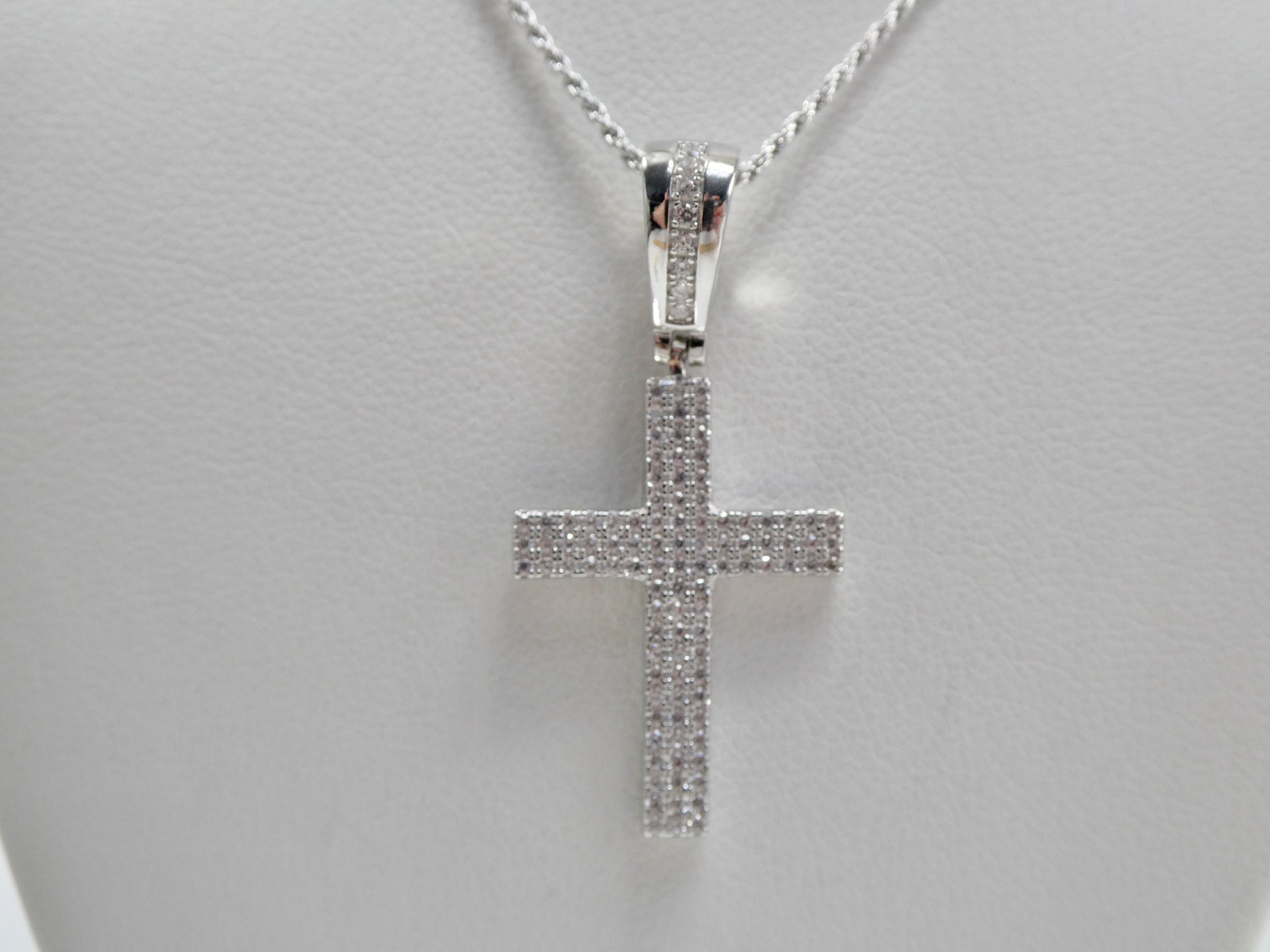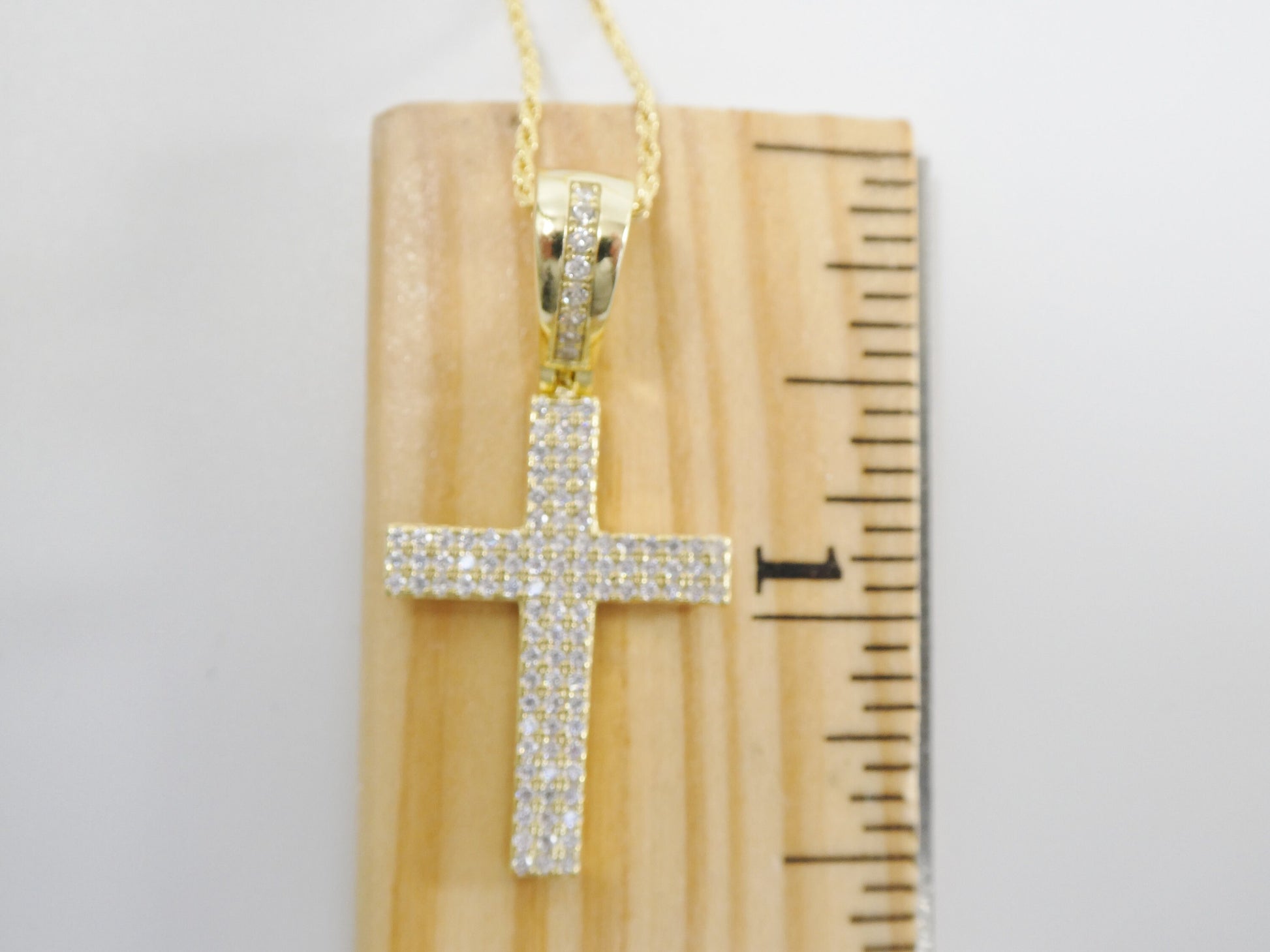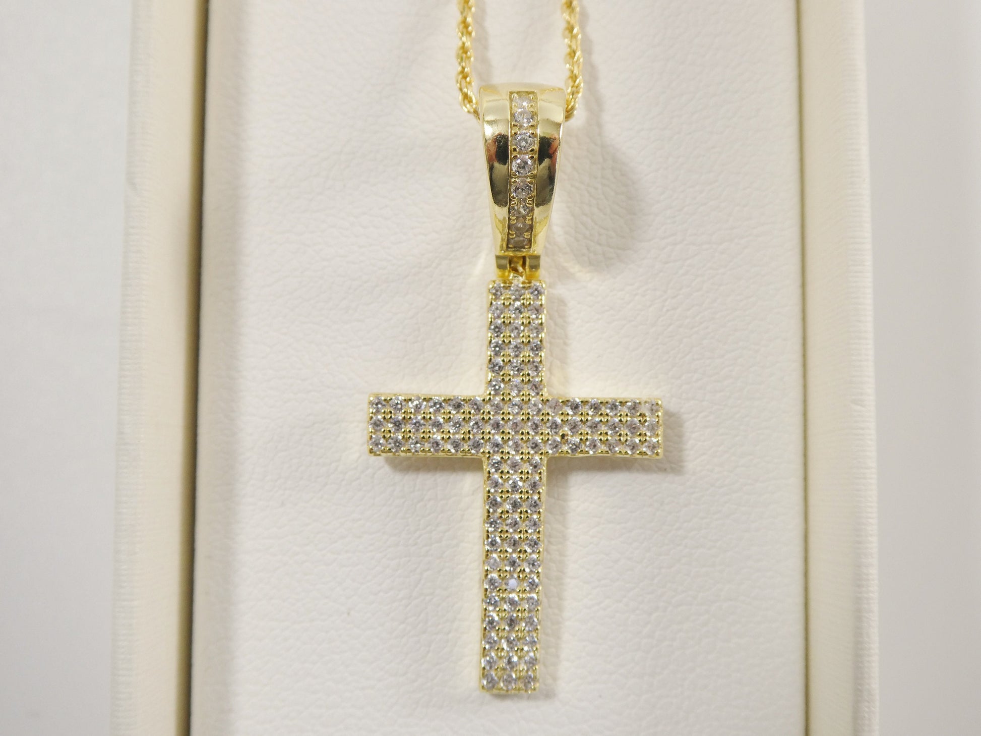 BRAND NEW REAL 925 STERLING SILVER 14K YELLOW GOLD SILVER / COLOR TONE 1.5M 18 INCH ROBE CHAIN AND CROSS PENDENT FULL STONE SETTING LOBSTER LOCK CLASP LUXURY ATTRACTIVE LOOK GREAT GREAT PRICE RHODIUM PLATED FOR LASTING FINISH GOLD COLOR COME IN NICE GIFT BOX MAKE IT GREAT GIFT FOR ANY OCCASION