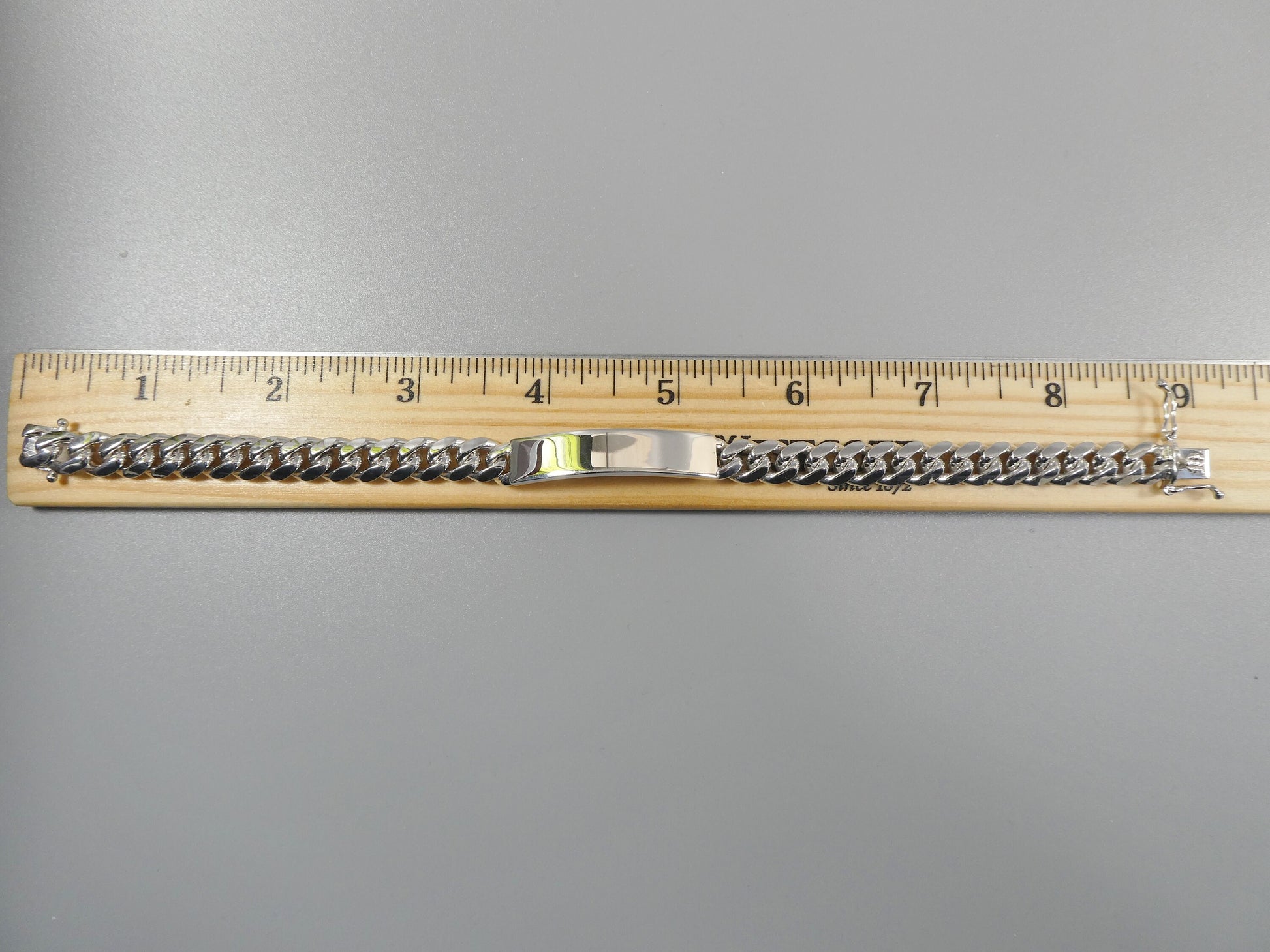 REAL 9INCH 925 STERLING SILVER SOLID MIAMI ID MEN BRACELET 14K WHITE GOLD FINISH RHODIUM PLATED FOR NOT TARNISH HIGH QUALITY HIGH POLISH GREAT FINISH BOX LOCK CLASP YOUR CHOICE NAME ENGRAVE COME IN NICE GIFT BOX MAKE IT GRATE GIFT FOR ANY OCCASION
