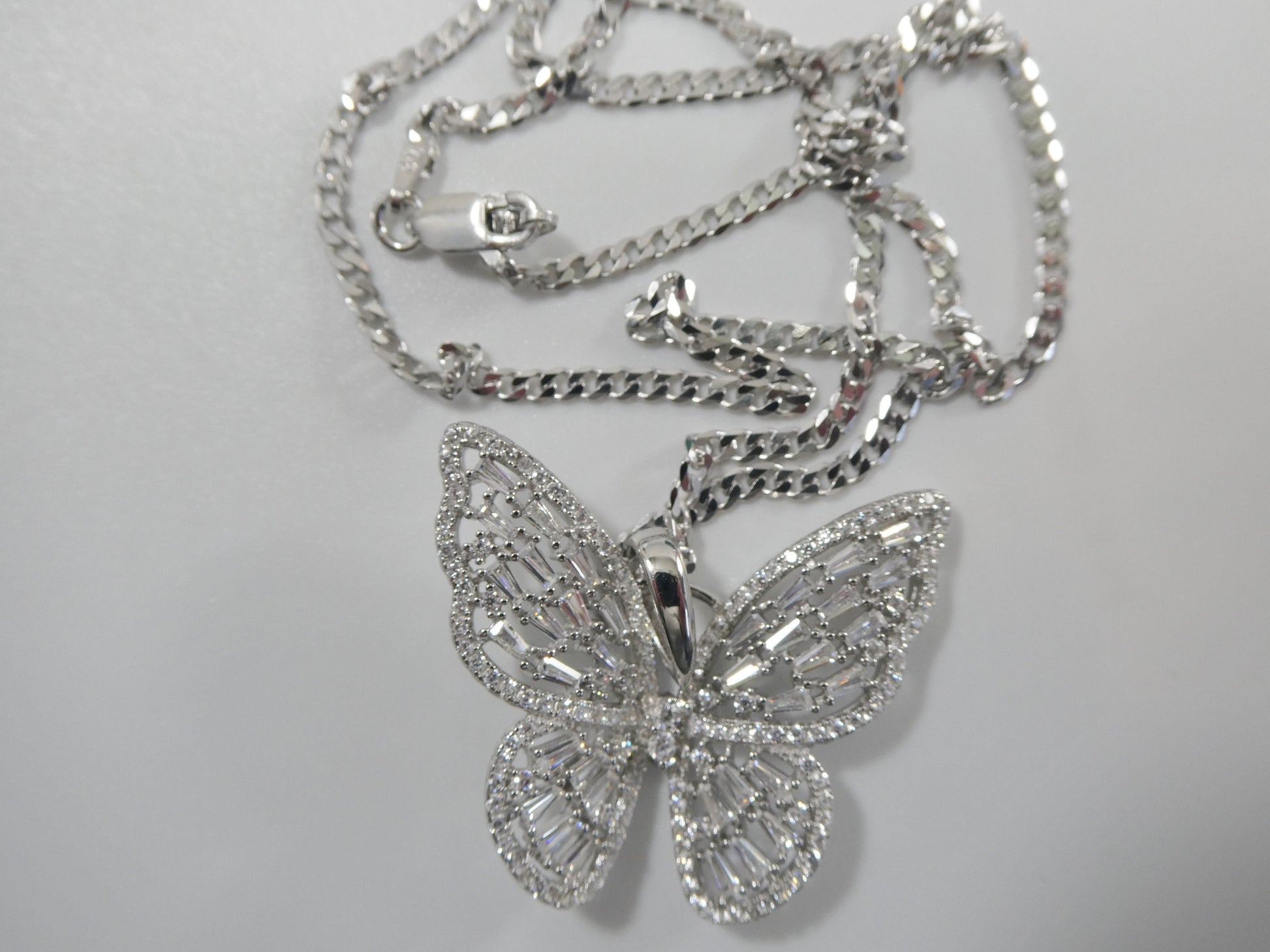 BRAND NEW NEW RELEASE 14K WHITE GOLD TONE COLOR CHAIN AND LARGE BUTTERFLY CHARM PENDENT OVER REAL 925 STERLING SILVER 18 INCH SMALL ITALYN FLAT CUBAN CHAIN LOBSTER CLASP LOCK RHODIUM PLATING FOR LASTER LUXURY ATTRACTIVE LOOK EXCELLENT GOLD COLOR FINISH HIGH POLISH GREAT PRICE COME IN NICE GIFT BOX PERFECT GIFT FOR ANY OCCASION