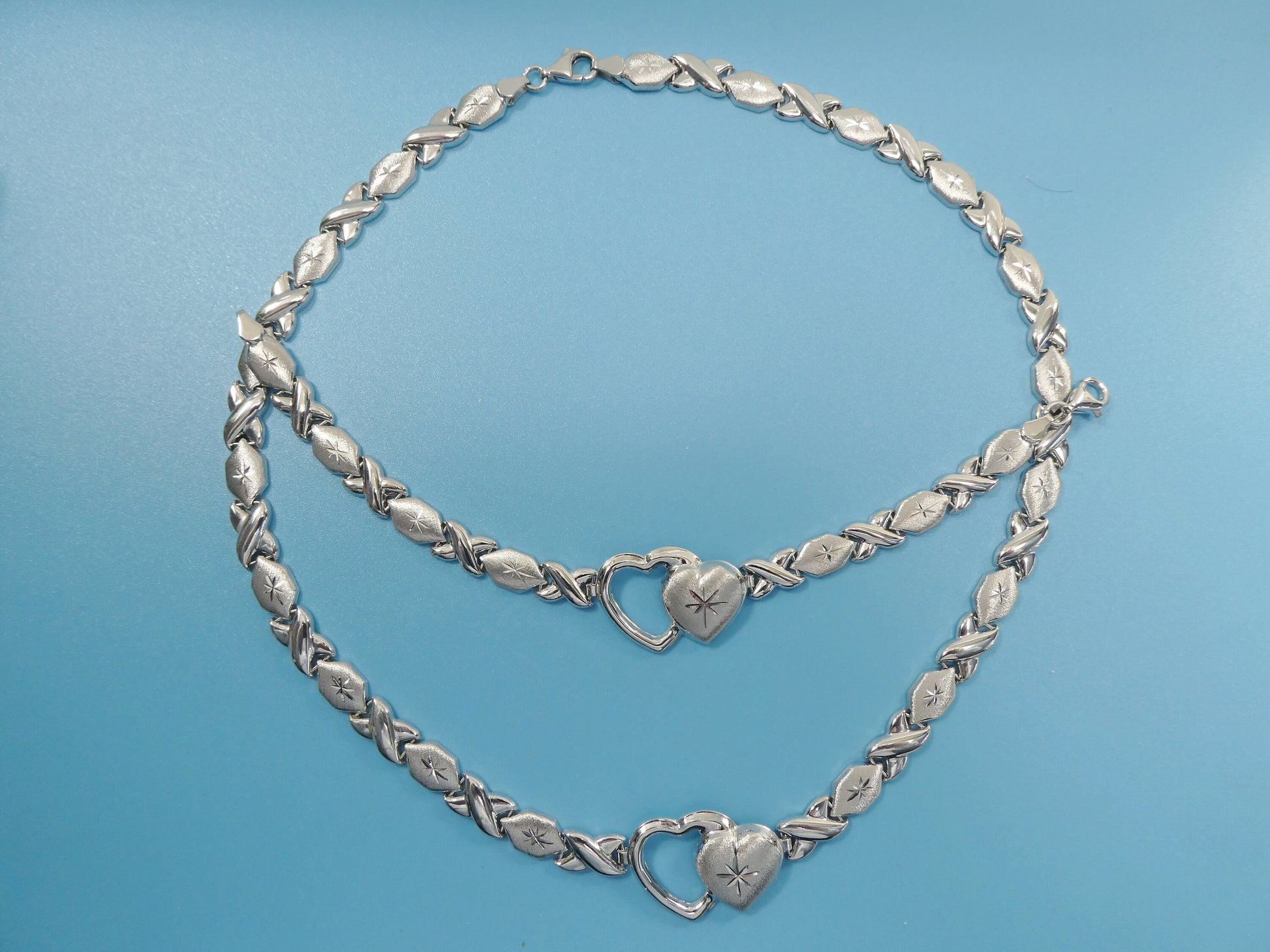 real 925 sterling silver double heart stampato set / necklace/ bracelet 14k white gold color finish