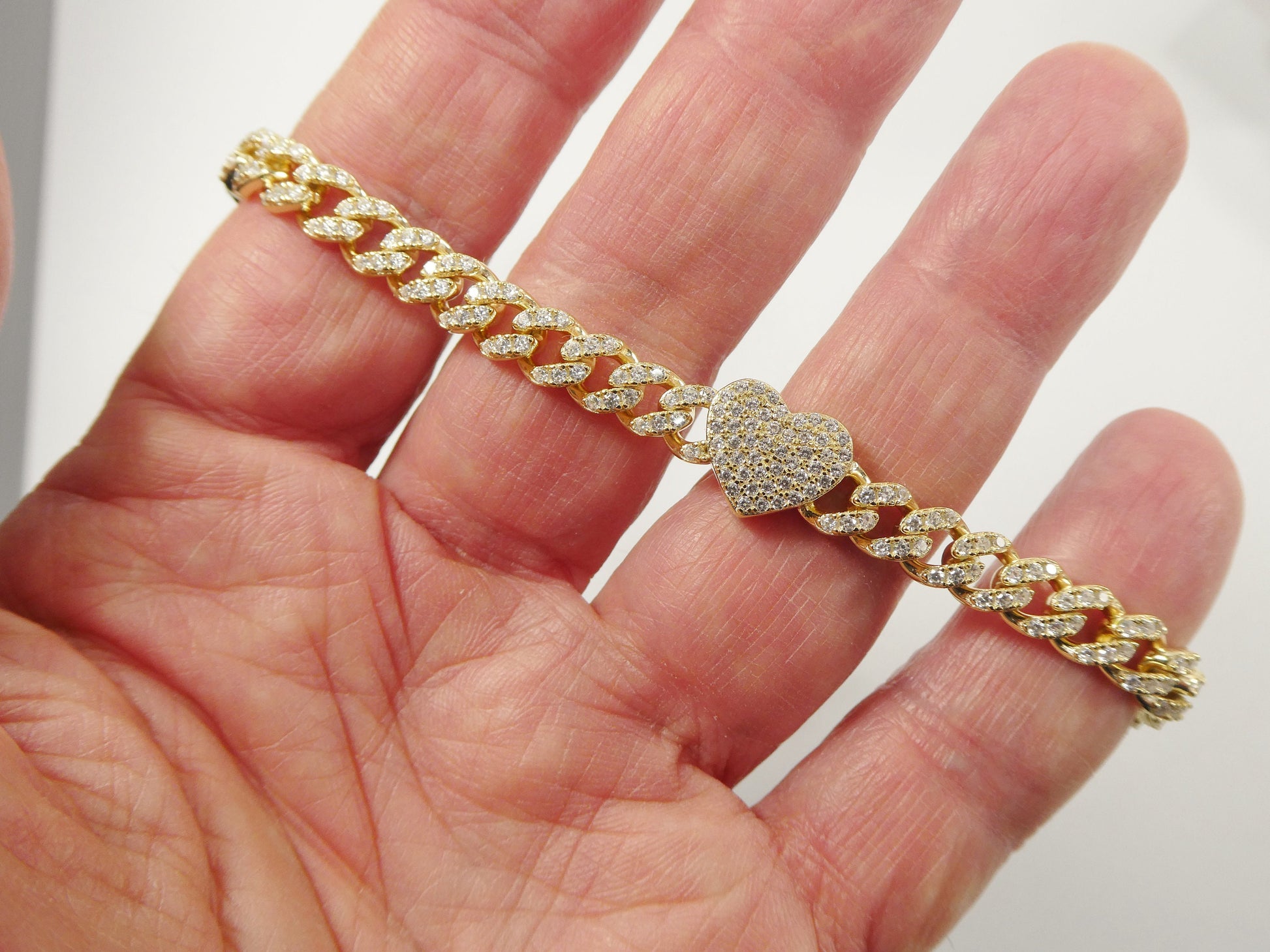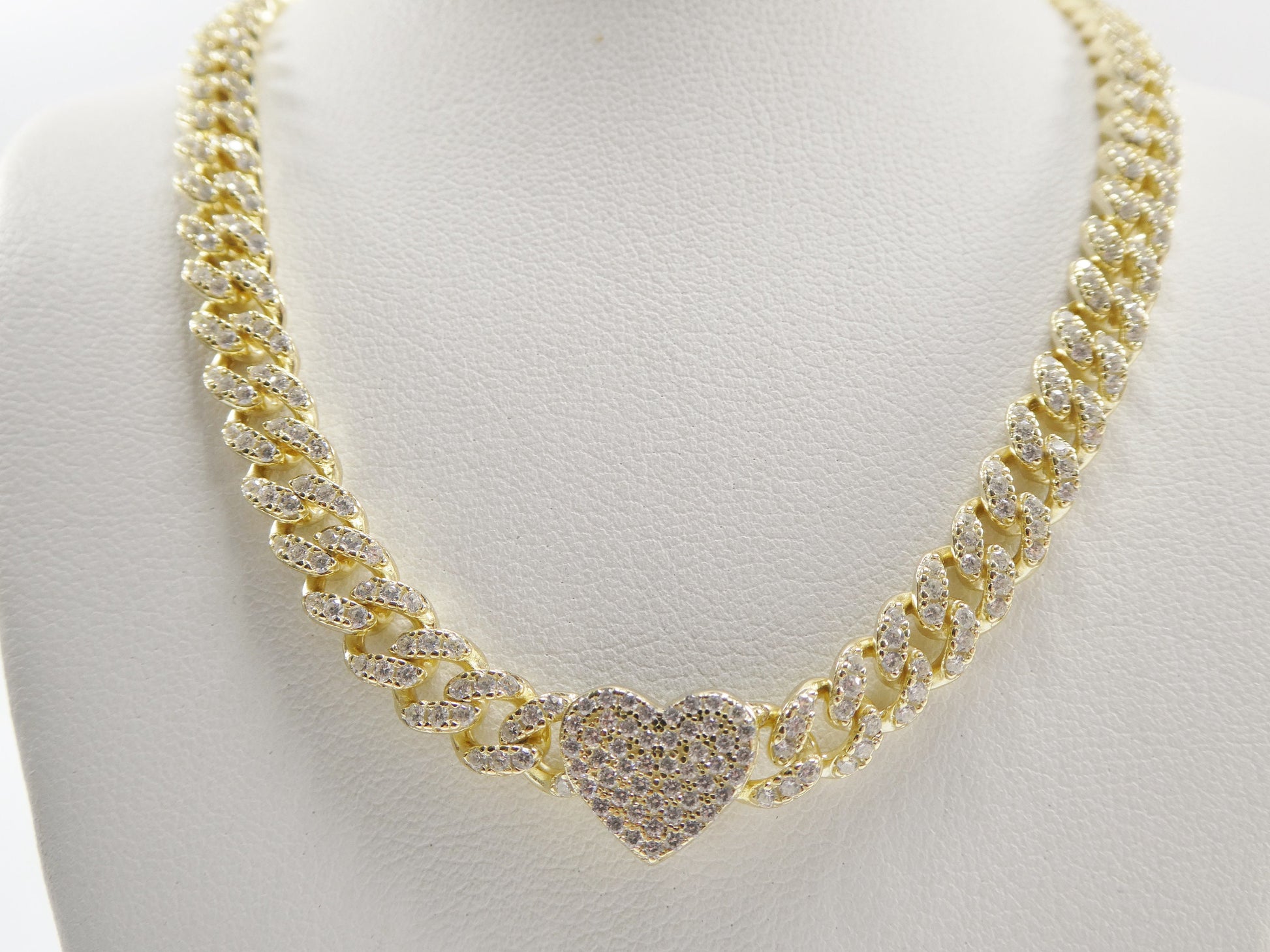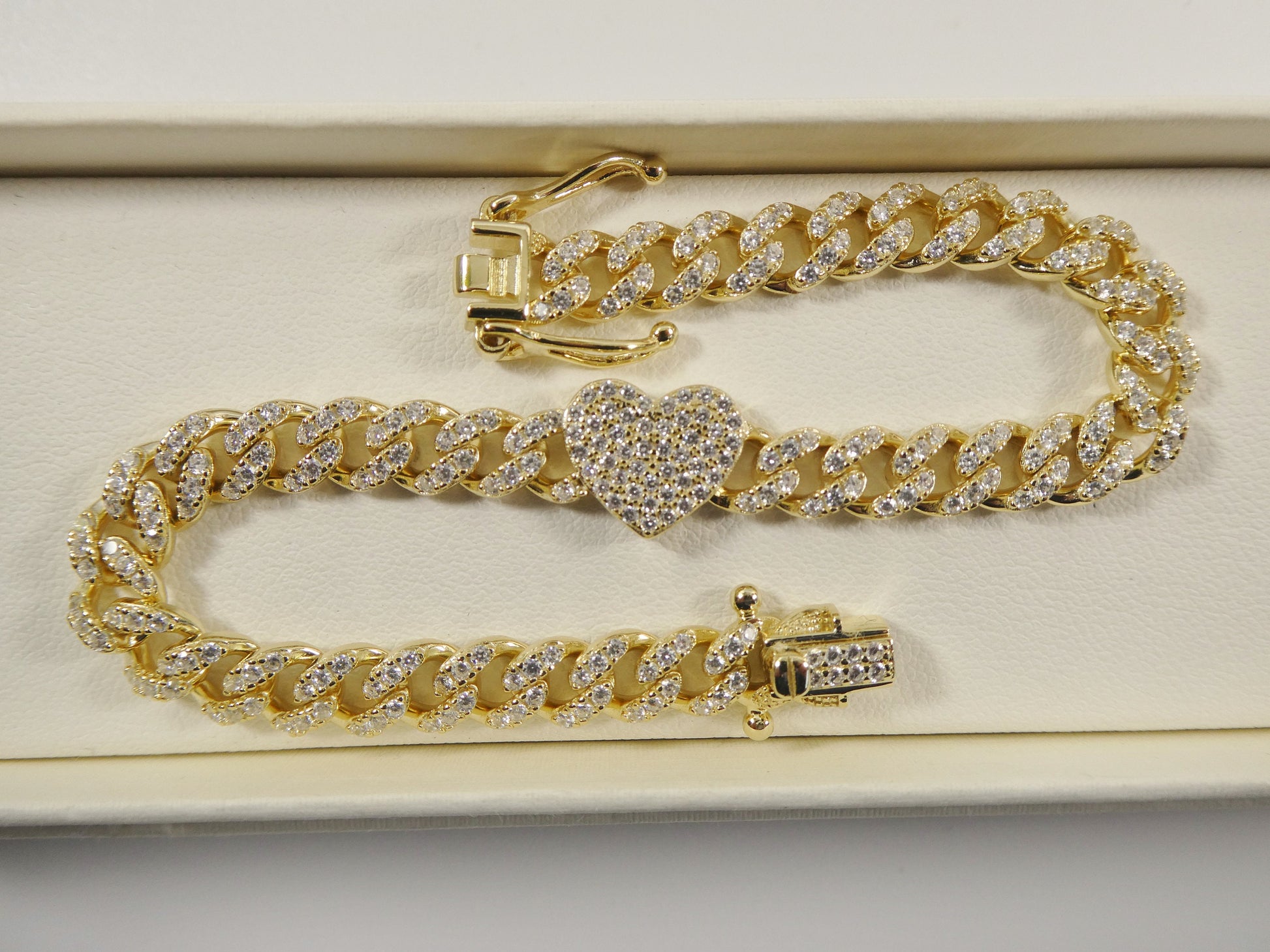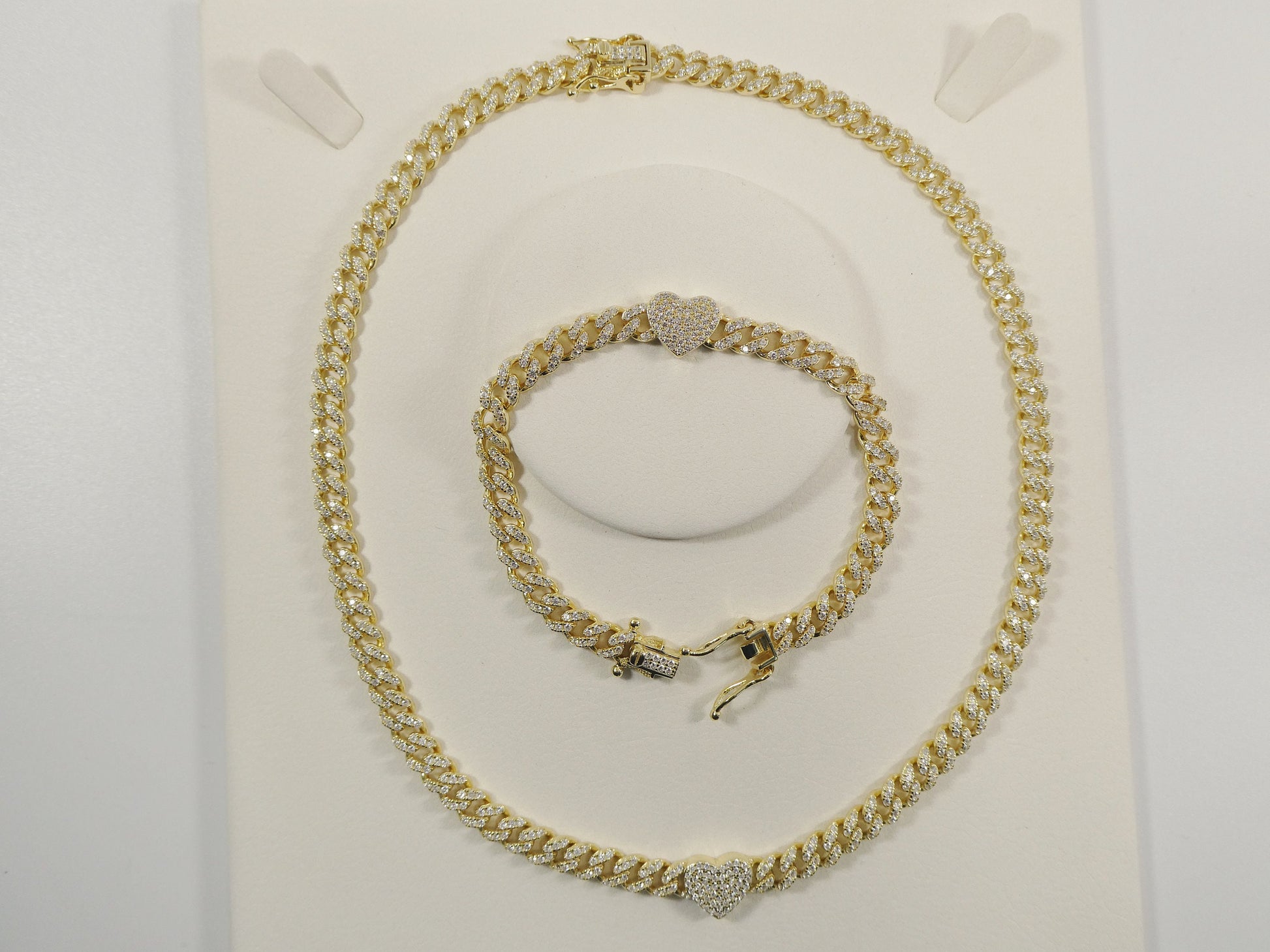 REAL 925 STERLING SILVER FULL ICE PRONG SETTING AAA SHINY CUBAN ZIRCONIA STONE HEART CENTER HIGH QUALITY GREAT GOLD COLOR FINISH RHODIUM PLATED FOR NOT TARNISH BOX LOCK CLASP THE SET COME IN 7 INCH BRACELET AND 16 INCH NECKLACE COME IN NICE GIFT BOX