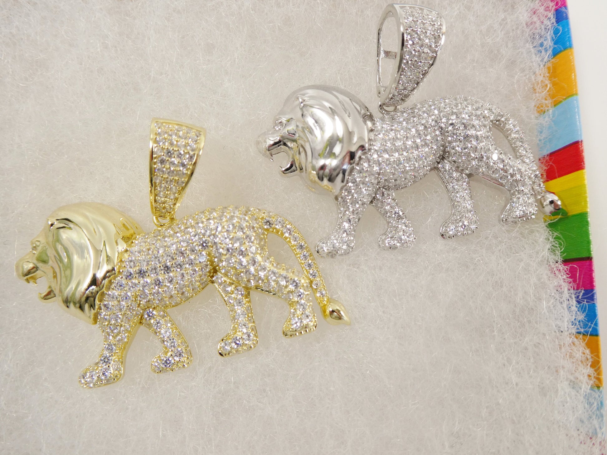 REAL 925 STERLING SILVER FULL STONE SETTING LARGE LION CHARM PENDENT MADE OF HIGH QUALITY HIGH POLISH GREAT GOLD COLOR FINISH PERFECT WHITE GOLD FINISH RHODIUM PLATING FOR NOT TARNISH COME IN NICE GIFT BOX MAKE GREAT GIFT FOR ANY OCCASIN
