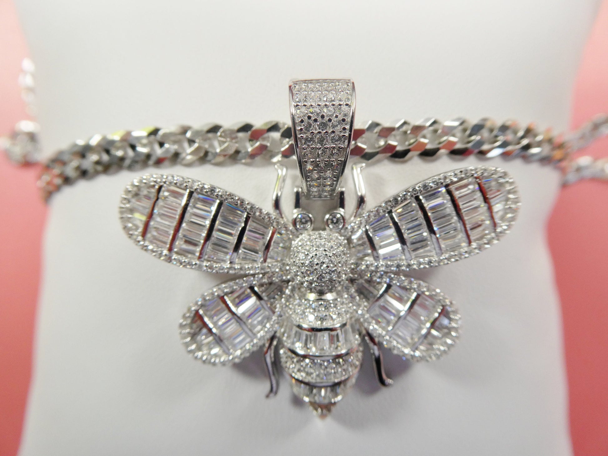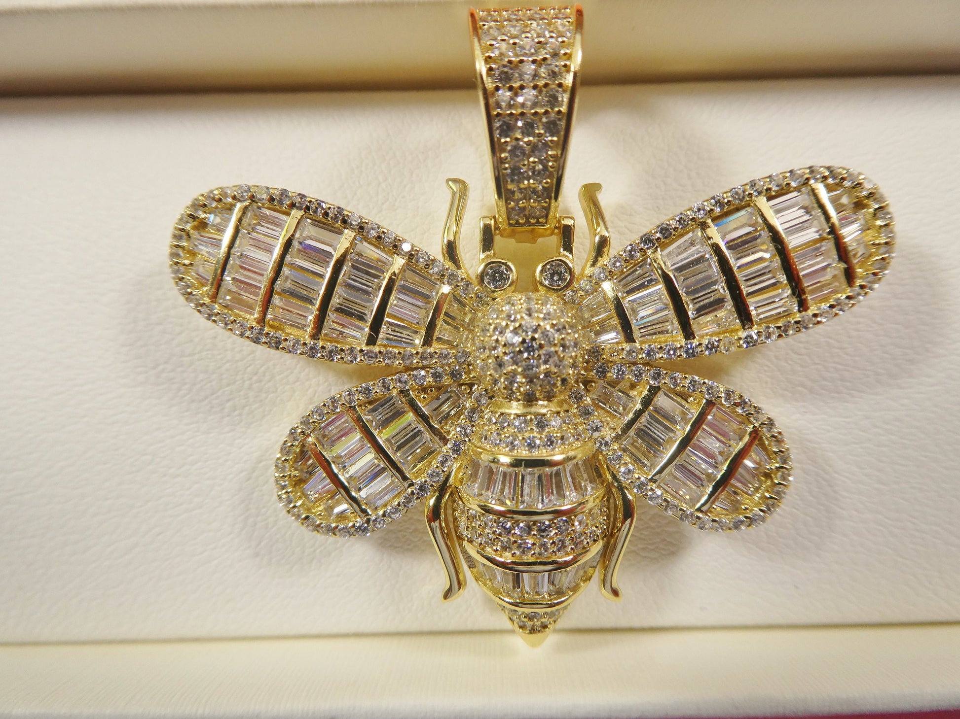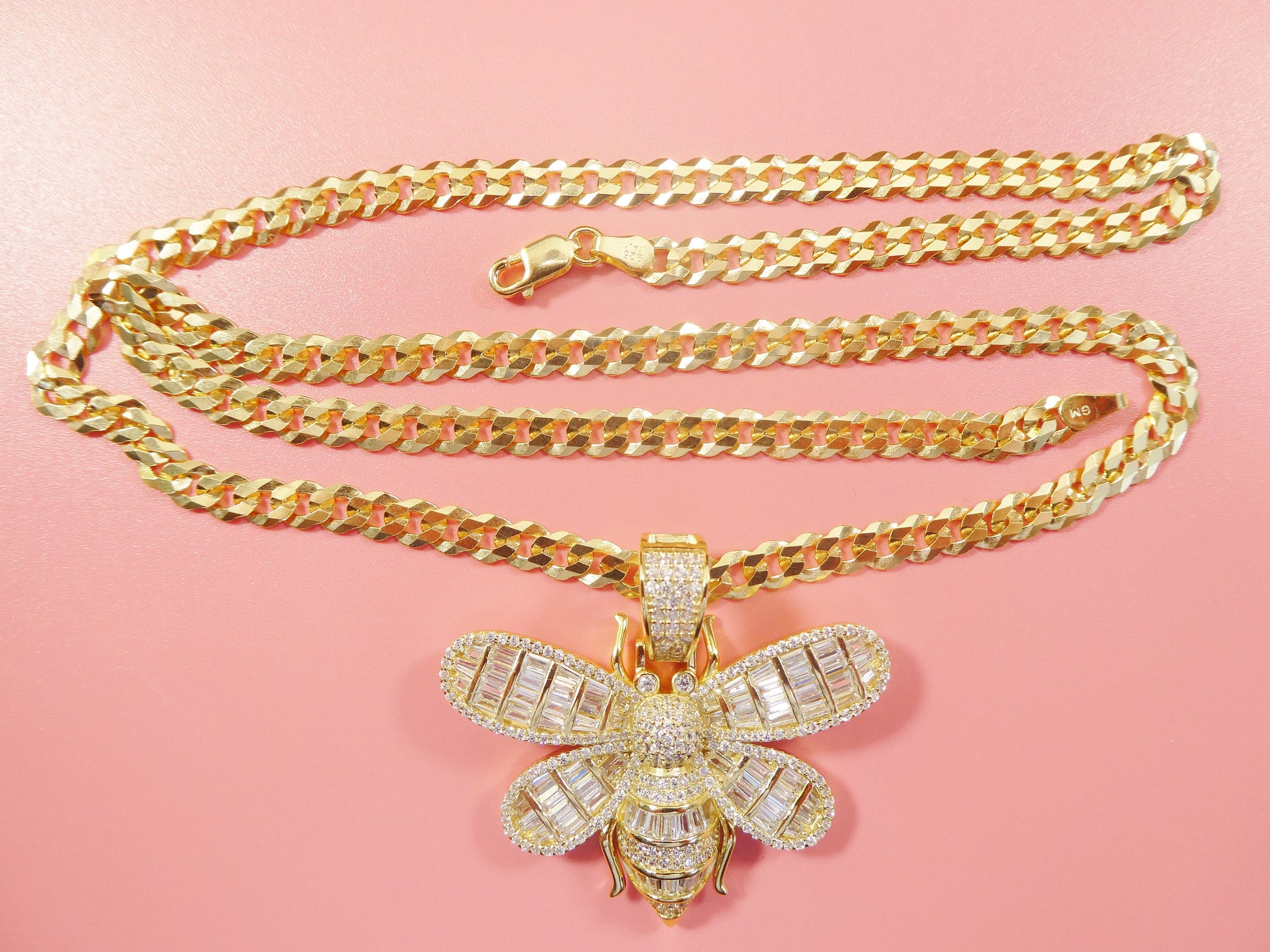 REAL 925 STERLING SILVER CHAIN AND HONEY BEE PENDENT 14K YELLOW GOLD FINISH COME IN YELLOW GOLD FINISH AND WHITE GOLD RHODIUM FINISH PERFECT GOLD COLOR FINISH HIGH QUALITY HIGH POLISH SHINY BAGUETTE STONE CUBIC ZIRCONIA CHAIN COME IN 20"22"24" INCH