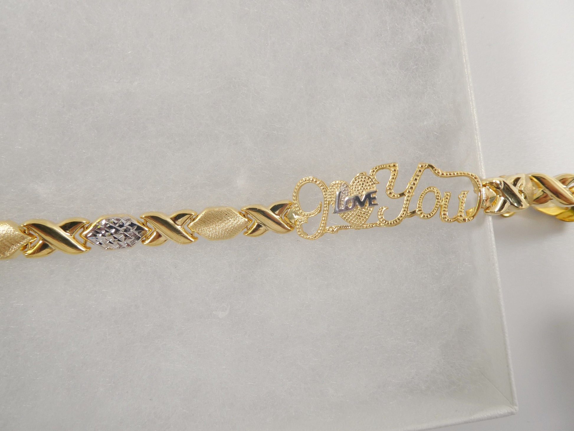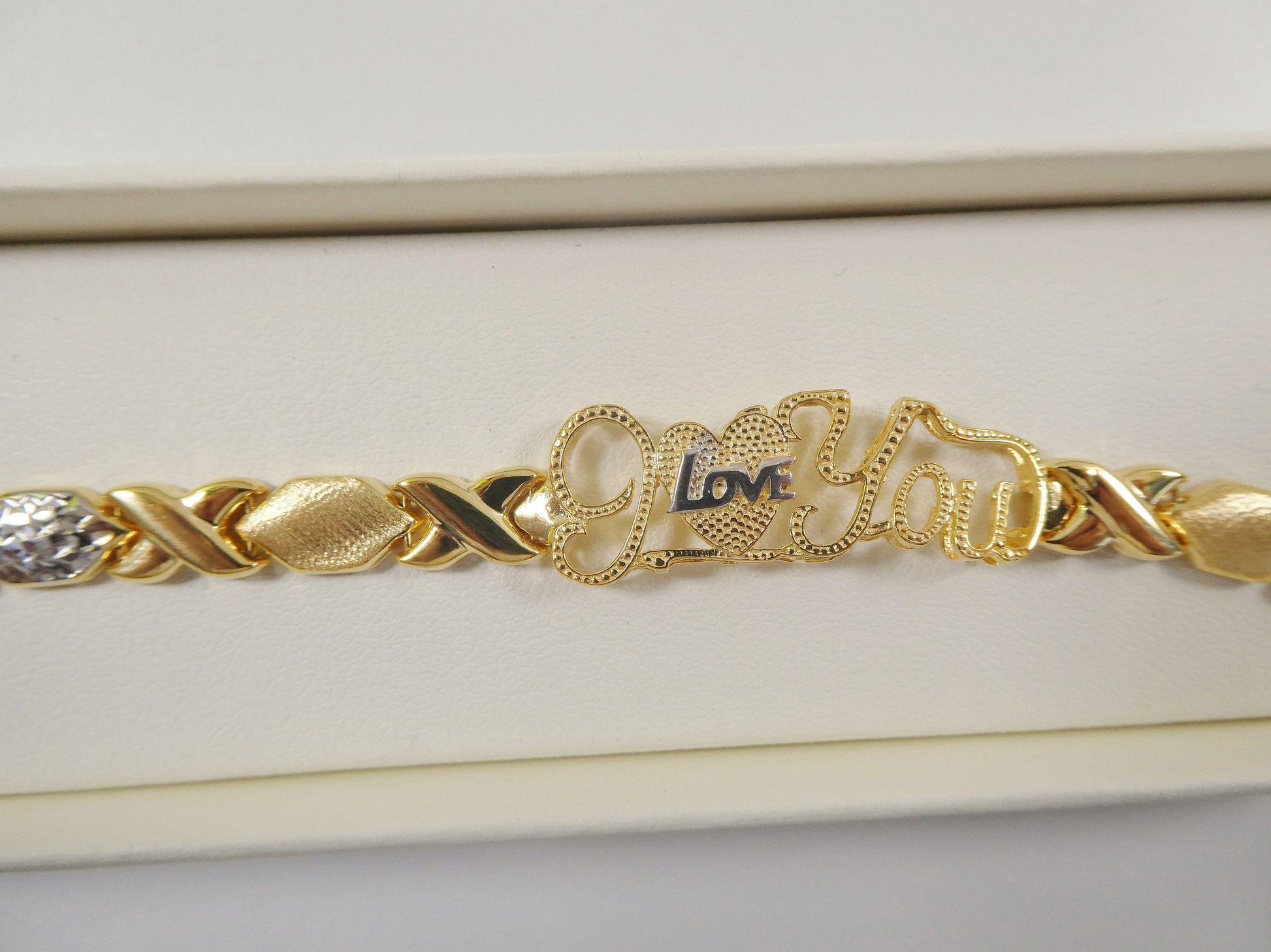 BRAND NEW REAL 925 STERLING SILVER I LOVE YOU BRACELET XOXO 14K GOLD TWO TONE FINISH /HIGH POLISH / PERFECT GOLD COLOR FINISH /HIGH QUALITY / LOBSTER CLASP LOCK LUXURY ATTRACTIVE LOOK COME IN 7 INCH AND 8 INCH COME IN NICE GIFT BOX MAKE IT GREAT GIFT FOR ANY OCCASION