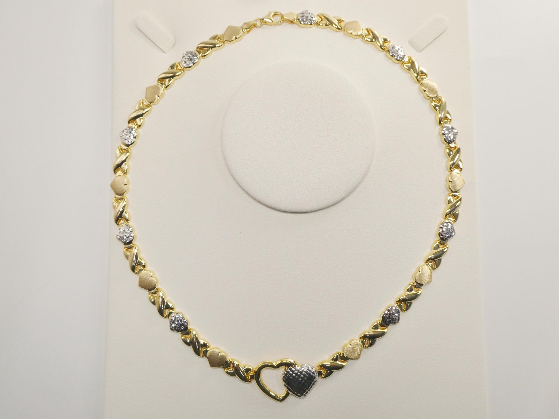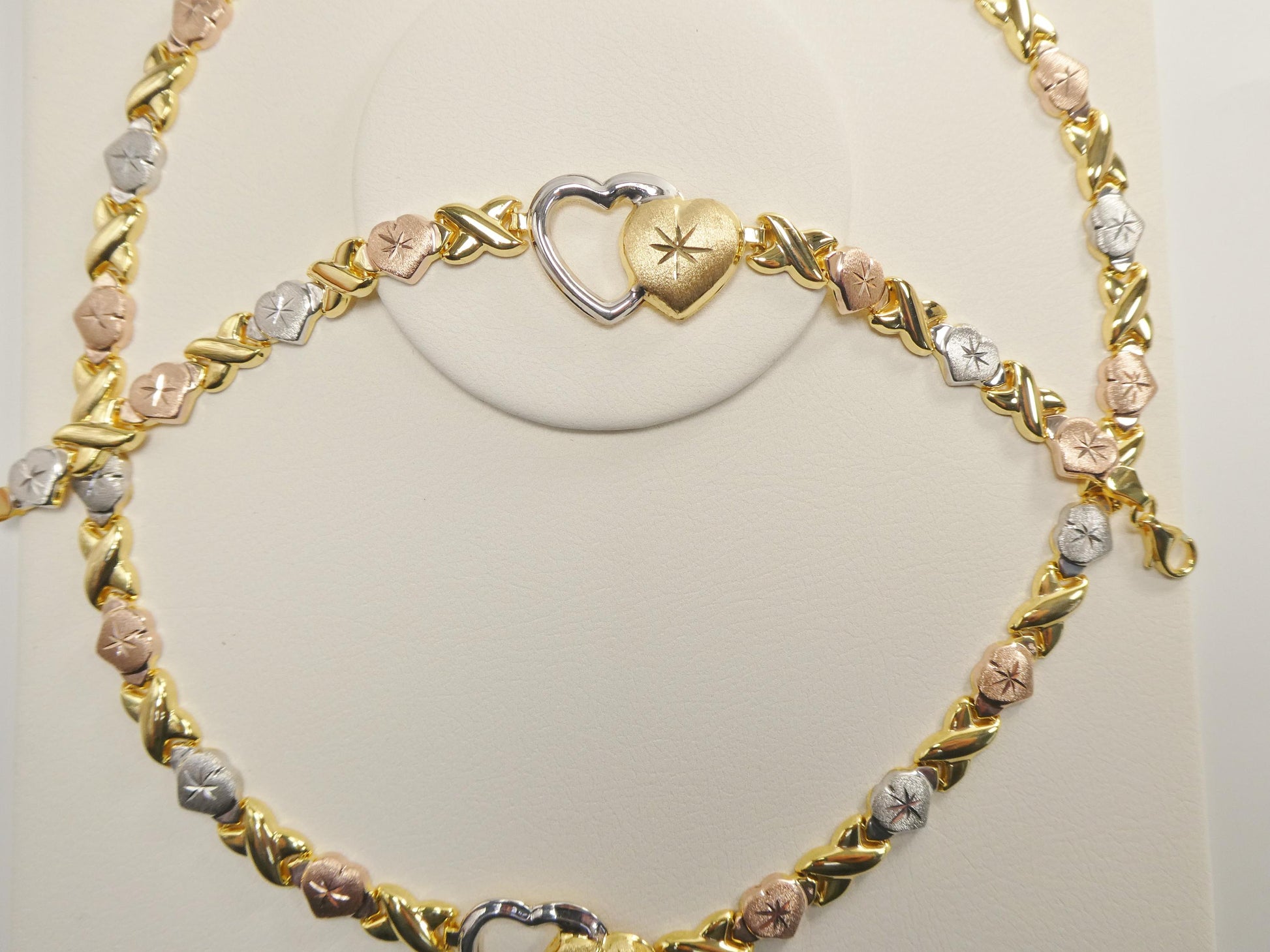 BRAND NEW XOXO DOUBLE HEART STAMPATO SET NECKLACE AND BRACELET NECKLACE LENGTH 17 INCH BRACELET 7.25 INCH 14K YELLOW GOLD ALL YELLOW TONE COLOR FINISH OVER REAL 925 STERLING SILVER PERFECT GOLD COLOR FINISH HIGH POLISH LUXURY COME IN ALL YELLOW TONE /TWO TONE/TRI COLOR TONE/ ATTRACTIVE LOOK LOBSTER CLASP LOCK COME IN NICE GIFT BOX MAKE IT PERFECT GIFT FOR VALENTINES DAY OR ANY OCCASION