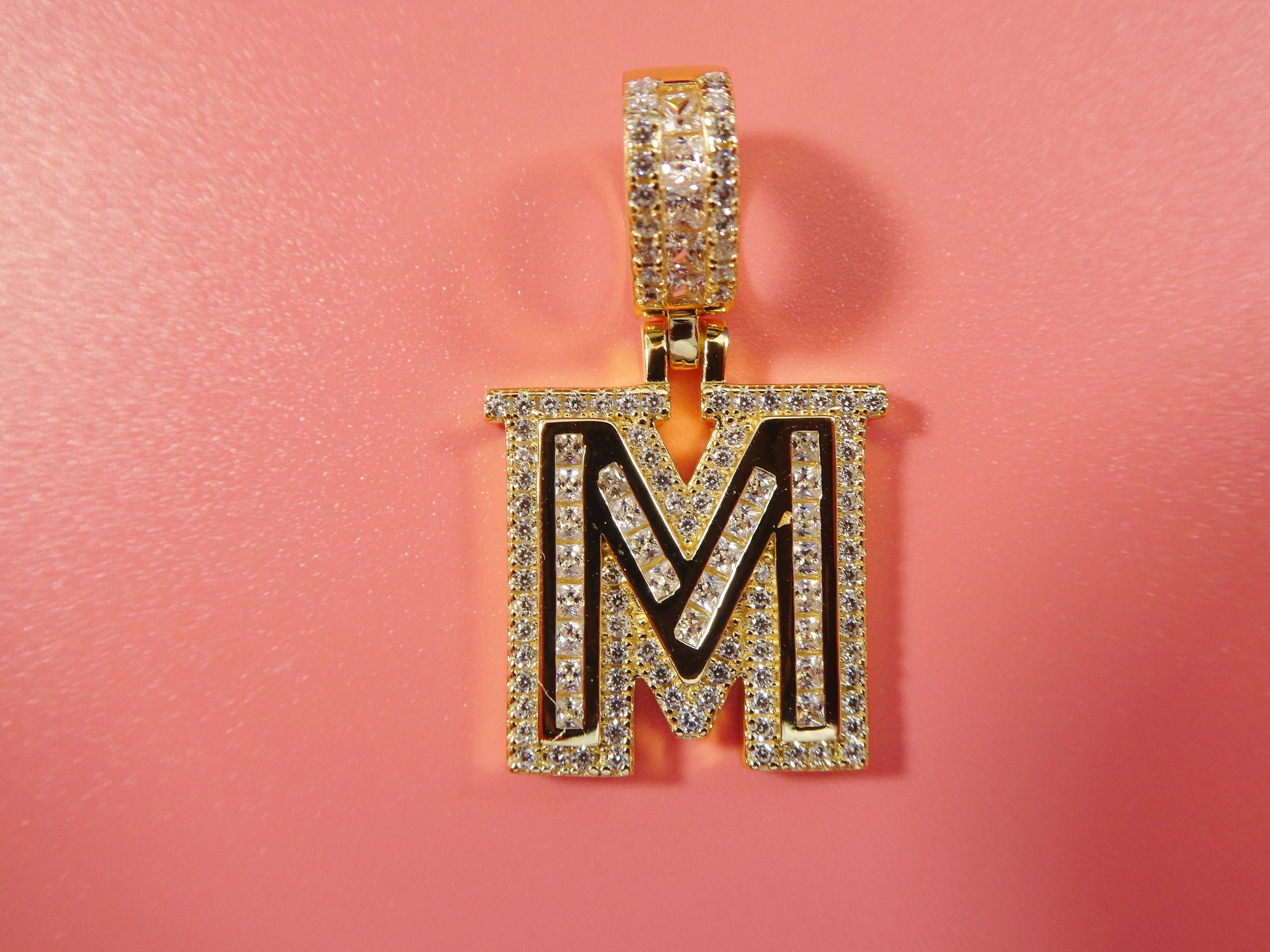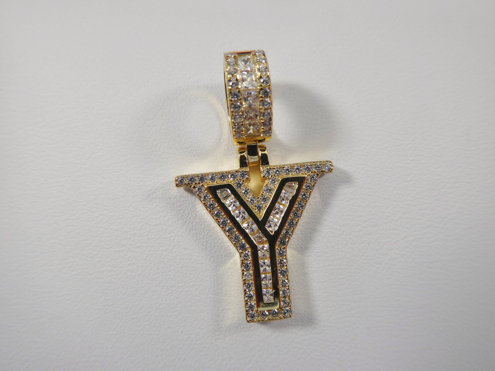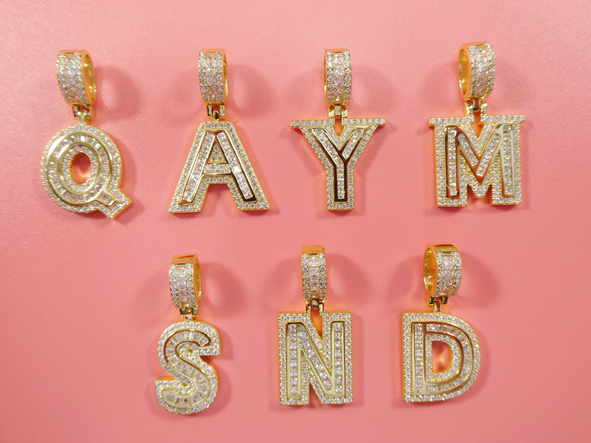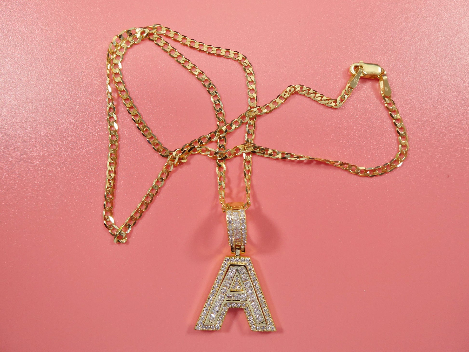 real 925 sterling silver yellow gold color tone baguette initial pendent with 18 inch small Miami chain